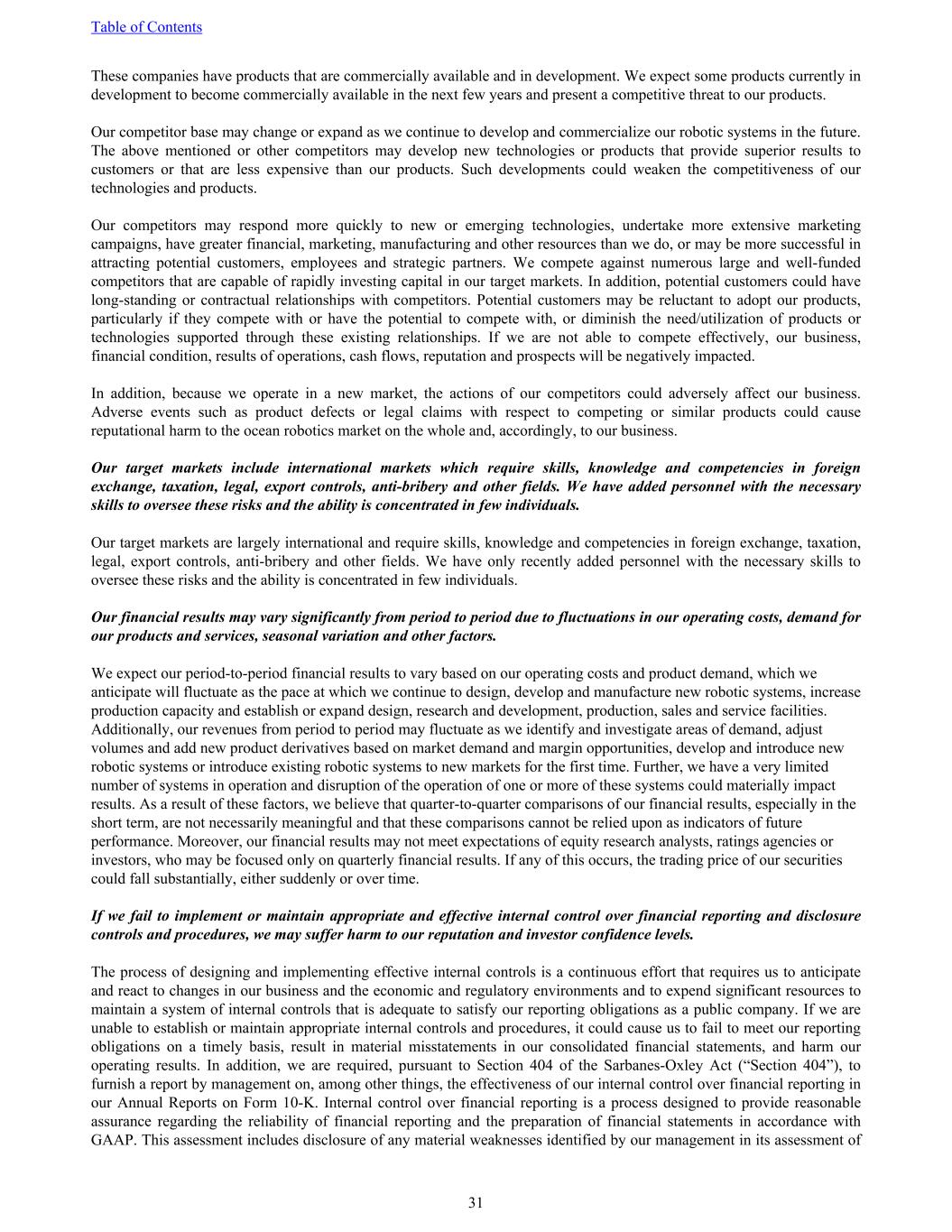 These companies have products that are commercially available and in development. We expect some products currently in development to become commercially available in the next few years and present a competitive threat to our products. Our competitor base may change or expand as we continue to develop and commercialize our robotic systems in the future. The above mentioned or other competitors may develop new technologies or products that provide superior results to customers or that are less expensive than our products. Such developments could weaken the competitiveness of our technologies and products. Our competitors may respond more quickly to new or emerging technologies, undertake more extensive marketing campaigns, have greater financial, marketing, manufacturing and other resources than we do, or may be more successful in attracting potential customers, employees and strategic partners. We compete against numerous large and well-funded competitors that are capable of rapidly investing capital in our target markets. In addition, potential customers could have long-standing or contractual relationships with competitors. Potential customers may be reluctant to adopt our products, particularly if they compete with or have the potential to compete with, or diminish the need/utilization of products or technologies supported through these existing relationships. If we are not able to compete effectively, our business, financial condition, results of operations, cash flows, reputation and prospects will be negatively impacted. In addition, because we operate in a new market, the actions of our competitors could adversely affect our business. Adverse events such as product defects or legal claims with respect to competing or similar products could cause reputational harm to the ocean robotics market on the whole and, accordingly, to our business. Our target markets include international markets which require skills, knowledge and competencies in foreign exchange, taxation, legal, export controls, anti-bribery and other fields. We have added personnel with the necessary skills to oversee these risks and the ability is concentrated in few individuals. Our target markets are largely international and require skills, knowledge and competencies in foreign exchange, taxation, legal, export controls, anti-bribery and other fields. We have only recently added personnel with the necessary skills to oversee these risks and the ability is concentrated in few individuals. Our financial results may vary significantly from period to period due to fluctuations in our operating costs, demand for our products and services, seasonal variation and other factors. We expect our period-to-period financial results to vary based on our operating costs and product demand, which we anticipate will fluctuate as the pace at which we continue to design, develop and manufacture new robotic systems, increase production capacity and establish or expand design, research and development, production, sales and service facilities. Additionally, our revenues from period to period may fluctuate as we identify and investigate areas of demand, adjust volumes and add new product derivatives based on market demand and margin opportunities, develop and introduce new robotic systems or introduce existing robotic systems to new markets for the first time. Further, we have a very limited number of systems in operation and disruption of the operation of one or more of these systems could materially impact results. As a result of these factors, we believe that quarter-to-quarter comparisons of our financial results, especially in the short term, are not necessarily meaningful and that these comparisons cannot be relied upon as indicators of future performance. Moreover, our financial results may not meet expectations of equity research analysts, ratings agencies or investors, who may be focused only on quarterly financial results. If any of this occurs, the trading price of our securities could fall substantially, either suddenly or over time. If we fail to implement or maintain appropriate and effective internal control over financial reporting and disclosure controls and procedures, we may suffer harm to our reputation and investor confidence levels. The process of designing and implementing effective internal controls is a continuous effort that requires us to anticipate and react to changes in our business and the economic and regulatory environments and to expend significant resources to maintain a system of internal controls that is adequate to satisfy our reporting obligations as a public company. If we are unable to establish or maintain appropriate internal controls and procedures, it could cause us to fail to meet our reporting obligations on a timely basis, result in material misstatements in our consolidated financial statements, and harm our operating results. In addition, we are required, pursuant to Section 404 of the Sarbanes-Oxley Act (“Section 404”), to furnish a report by management on, among other things, the effectiveness of our internal control over financial reporting in our Annual Reports on Form 10-K. Internal control over financial reporting is a process designed to provide reasonable assurance regarding the reliability of financial reporting and the preparation of financial statements in accordance with GAAP. This assessment includes disclosure of any material weaknesses identified by our management in its assessment of Table of Contents 31