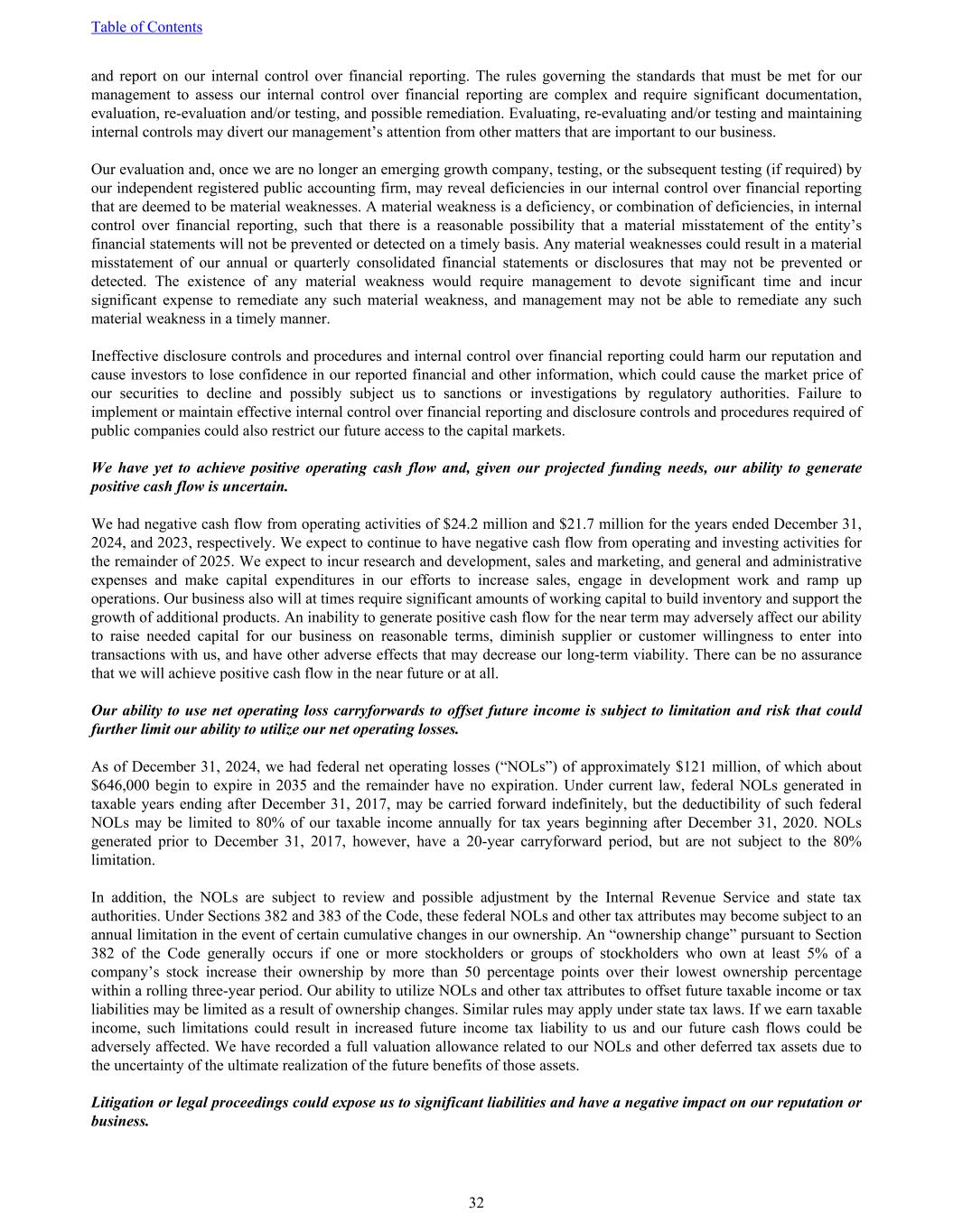 and report on our internal control over financial reporting. The rules governing the standards that must be met for our management to assess our internal control over financial reporting are complex and require significant documentation, evaluation, re-evaluation and/or testing, and possible remediation. Evaluating, re-evaluating and/or testing and maintaining internal controls may divert our management’s attention from other matters that are important to our business. Our evaluation and, once we are no longer an emerging growth company, testing, or the subsequent testing (if required) by our independent registered public accounting firm, may reveal deficiencies in our internal control over financial reporting that are deemed to be material weaknesses. A material weakness is a deficiency, or combination of deficiencies, in internal control over financial reporting, such that there is a reasonable possibility that a material misstatement of the entity’s financial statements will not be prevented or detected on a timely basis. Any material weaknesses could result in a material misstatement of our annual or quarterly consolidated financial statements or disclosures that may not be prevented or detected. The existence of any material weakness would require management to devote significant time and incur significant expense to remediate any such material weakness, and management may not be able to remediate any such material weakness in a timely manner. Ineffective disclosure controls and procedures and internal control over financial reporting could harm our reputation and cause investors to lose confidence in our reported financial and other information, which could cause the market price of our securities to decline and possibly subject us to sanctions or investigations by regulatory authorities. Failure to implement or maintain effective internal control over financial reporting and disclosure controls and procedures required of public companies could also restrict our future access to the capital markets. We have yet to achieve positive operating cash flow and, given our projected funding needs, our ability to generate positive cash flow is uncertain. We had negative cash flow from operating activities of $24.2 million and $21.7 million for the years ended December 31, 2024, and 2023, respectively. We expect to continue to have negative cash flow from operating and investing activities for the remainder of 2025. We expect to incur research and development, sales and marketing, and general and administrative expenses and make capital expenditures in our efforts to increase sales, engage in development work and ramp up operations. Our business also will at times require significant amounts of working capital to build inventory and support the growth of additional products. An inability to generate positive cash flow for the near term may adversely affect our ability to raise needed capital for our business on reasonable terms, diminish supplier or customer willingness to enter into transactions with us, and have other adverse effects that may decrease our long-term viability. There can be no assurance that we will achieve positive cash flow in the near future or at all. Our ability to use net operating loss carryforwards to offset future income is subject to limitation and risk that could further limit our ability to utilize our net operating losses. As of December 31, 2024, we had federal net operating losses (“NOLs”) of approximately $121 million, of which about $646,000 begin to expire in 2035 and the remainder have no expiration. Under current law, federal NOLs generated in taxable years ending after December 31, 2017, may be carried forward indefinitely, but the deductibility of such federal NOLs may be limited to 80% of our taxable income annually for tax years beginning after December 31, 2020. NOLs generated prior to December 31, 2017, however, have a 20-year carryforward period, but are not subject to the 80% limitation. In addition, the NOLs are subject to review and possible adjustment by the Internal Revenue Service and state tax authorities. Under Sections 382 and 383 of the Code, these federal NOLs and other tax attributes may become subject to an annual limitation in the event of certain cumulative changes in our ownership. An “ownership change” pursuant to Section 382 of the Code generally occurs if one or more stockholders or groups of stockholders who own at least 5% of a company’s stock increase their ownership by more than 50 percentage points over their lowest ownership percentage within a rolling three-year period. Our ability to utilize NOLs and other tax attributes to offset future taxable income or tax liabilities may be limited as a result of ownership changes. Similar rules may apply under state tax laws. If we earn taxable income, such limitations could result in increased future income tax liability to us and our future cash flows could be adversely affected. We have recorded a full valuation allowance related to our NOLs and other deferred tax assets due to the uncertainty of the ultimate realization of the future benefits of those assets. Litigation or legal proceedings could expose us to significant liabilities and have a negative impact on our reputation or business. Table of Contents 32