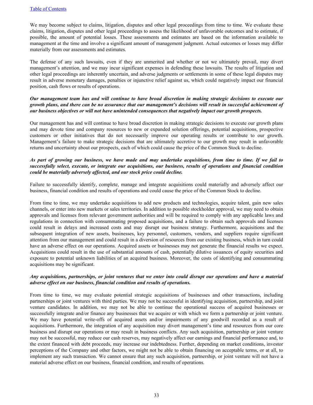 We may become subject to claims, litigation, disputes and other legal proceedings from time to time. We evaluate these claims, litigation, disputes and other legal proceedings to assess the likelihood of unfavorable outcomes and to estimate, if possible, the amount of potential losses. These assessments and estimates are based on the information available to management at the time and involve a significant amount of management judgment. Actual outcomes or losses may differ materially from our assessments and estimates. The defense of any such lawsuits, even if they are unmerited and whether or not we ultimately prevail, may divert management’s attention, and we may incur significant expenses in defending these lawsuits. The results of litigation and other legal proceedings are inherently uncertain, and adverse judgments or settlements in some of these legal disputes may result in adverse monetary damages, penalties or injunctive relief against us, which could negatively impact our financial position, cash flows or results of operations. Our management team has and will continue to have broad discretion in making strategic decisions to execute our growth plans, and there can be no assurance that our management’s decisions will result in successful achievement of our business objectives or will not have unintended consequences that negatively impact our growth prospects. Our management has and will continue to have broad discretion in making strategic decisions to execute our growth plans and may devote time and company resources to new or expanded solution offerings, potential acquisitions, prospective customers or other initiatives that do not necessarily improve our operating results or contribute to our growth. Management’s failure to make strategic decisions that are ultimately accretive to our growth may result in unfavorable returns and uncertainty about our prospects, each of which could cause the price of the Common Stock to decline. As part of growing our business, we have made and may undertake acquisitions, from time to time. If we fail to successfully select, execute, or integrate our acquisitions, our business, results of operations and financial condition could be materially adversely affected, and our stock price could decline. Failure to successfully identify, complete, manage and integrate acquisitions could materially and adversely affect our business, financial condition and results of operations and could cause the price of the Common Stock to decline. From time to time, we may undertake acquisitions to add new products and technologies, acquire talent, gain new sales channels, or enter into new markets or sales territories. In addition to possible stockholder approval, we may need to obtain approvals and licenses from relevant government authorities and will be required to comply with any applicable laws and regulations in connection with consummating proposed acquisitions, and a failure to obtain such approvals and licenses could result in delays and increased costs and may disrupt our business strategy. Furthermore, acquisitions and the subsequent integration of new assets, businesses, key personnel, customers, vendors, and suppliers require significant attention from our management and could result in a diversion of resources from our existing business, which in turn could have an adverse effect on our operations. Acquired assets or businesses may not generate the financial results we expect. Acquisitions could result in the use of substantial amounts of cash, potentially dilutive issuances of equity securities and exposure to potential unknown liabilities of an acquired business. Moreover, the costs of identifying and consummating acquisitions may be significant. Any acquisitions, partnerships, or joint ventures that we enter into could disrupt our operations and have a material adverse effect on our business, financial condition and results of operations. From time to time, we may evaluate potential strategic acquisitions of businesses and other transactions, including partnerships or joint ventures with third parties. We may not be successful in identifying acquisition, partnership, and joint venture candidates. In addition, we may not be able to continue the operational success of acquired businesses or successfully integrate and/or finance any businesses that we acquire or with which we form a partnership or joint venture. We may have potential write-offs of acquired assets and/or impairments of any goodwill recorded as a result of acquisitions. Furthermore, the integration of any acquisition may divert management’s time and resources from our core business and disrupt our operations or may result in business conflicts. Any such acquisition, partnership or joint venture may not be successful, may reduce our cash reserves, may negatively affect our earnings and financial performance and, to the extent financed with debt proceeds, may increase our indebtedness. Further, depending on market conditions, investor perceptions of the Company and other factors, we might not be able to obtain financing on acceptable terms, or at all, to implement any such transaction. We cannot ensure that any such acquisition, partnership, or joint venture will not have a material adverse effect on our business, financial condition, and results of operations. Table of Contents 33