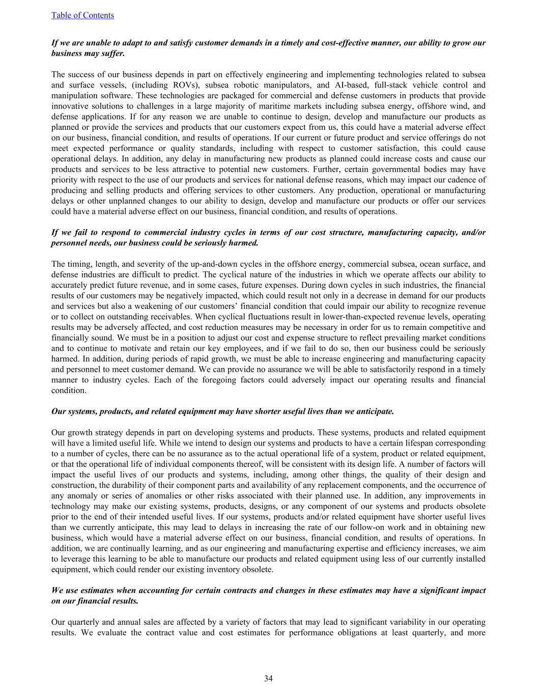 If we are unable to adapt to and satisfy customer demands in a timely and cost-effective manner, our ability to grow our business may suffer. The success of our business depends in part on effectively engineering and implementing technologies related to subsea and surface vessels, (including ROVs), subsea robotic manipulators, and AI-based, full-stack vehicle control and manipulation software. These technologies are packaged for commercial and defense customers in products that provide innovative solutions to challenges in a large majority of maritime markets including subsea energy, offshore wind, and defense applications. If for any reason we are unable to continue to design, develop and manufacture our products as planned or provide the services and products that our customers expect from us, this could have a material adverse effect on our business, financial condition, and results of operations. If our current or future product and service offerings do not meet expected performance or quality standards, including with respect to customer satisfaction, this could cause operational delays. In addition, any delay in manufacturing new products as planned could increase costs and cause our products and services to be less attractive to potential new customers. Further, certain governmental bodies may have priority with respect to the use of our products and services for national defense reasons, which may impact our cadence of producing and selling products and offering services to other customers. Any production, operational or manufacturing delays or other unplanned changes to our ability to design, develop and manufacture our products or offer our services could have a material adverse effect on our business, financial condition, and results of operations. If we fail to respond to commercial industry cycles in terms of our cost structure, manufacturing capacity, and/or personnel needs, our business could be seriously harmed. The timing, length, and severity of the up-and-down cycles in the offshore energy, commercial subsea, ocean surface, and defense industries are difficult to predict. The cyclical nature of the industries in which we operate affects our ability to accurately predict future revenue, and in some cases, future expenses. During down cycles in such industries, the financial results of our customers may be negatively impacted, which could result not only in a decrease in demand for our products and services but also a weakening of our customers’ financial condition that could impair our ability to recognize revenue or to collect on outstanding receivables. When cyclical fluctuations result in lower-than-expected revenue levels, operating results may be adversely affected, and cost reduction measures may be necessary in order for us to remain competitive and financially sound. We must be in a position to adjust our cost and expense structure to reflect prevailing market conditions and to continue to motivate and retain our key employees, and if we fail to do so, then our business could be seriously harmed. In addition, during periods of rapid growth, we must be able to increase engineering and manufacturing capacity and personnel to meet customer demand. We can provide no assurance we will be able to satisfactorily respond in a timely manner to industry cycles. Each of the foregoing factors could adversely impact our operating results and financial condition. Our systems, products, and related equipment may have shorter useful lives than we anticipate. Our growth strategy depends in part on developing systems and products. These systems, products and related equipment will have a limited useful life. While we intend to design our systems and products to have a certain lifespan corresponding to a number of cycles, there can be no assurance as to the actual operational life of a system, product or related equipment, or that the operational life of individual components thereof, will be consistent with its design life. A number of factors will impact the useful lives of our products and systems, including, among other things, the quality of their design and construction, the durability of their component parts and availability of any replacement components, and the occurrence of any anomaly or series of anomalies or other risks associated with their planned use. In addition, any improvements in technology may make our existing systems, products, designs, or any component of our systems and products obsolete prior to the end of their intended useful lives. If our systems, products and/or related equipment have shorter useful lives than we currently anticipate, this may lead to delays in increasing the rate of our follow-on work and in obtaining new business, which would have a material adverse effect on our business, financial condition, and results of operations. In addition, we are continually learning, and as our engineering and manufacturing expertise and efficiency increases, we aim to leverage this learning to be able to manufacture our products and related equipment using less of our currently installed equipment, which could render our existing inventory obsolete. We use estimates when accounting for certain contracts and changes in these estimates may have a significant impact on our financial results. Our quarterly and annual sales are affected by a variety of factors that may lead to significant variability in our operating results. We evaluate the contract value and cost estimates for performance obligations at least quarterly, and more Table of Contents 34