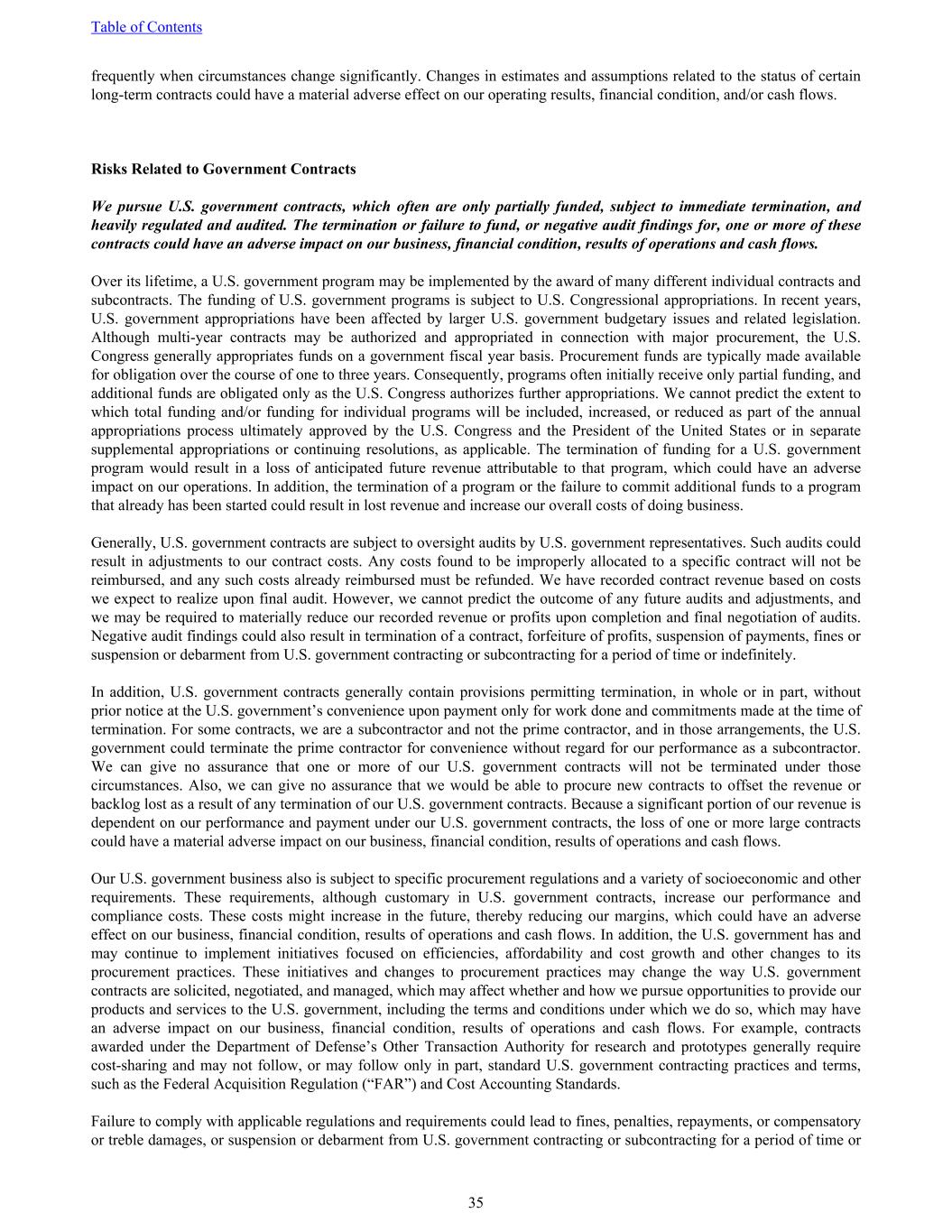 frequently when circumstances change significantly. Changes in estimates and assumptions related to the status of certain long-term contracts could have a material adverse effect on our operating results, financial condition, and/or cash flows. Risks Related to Government Contracts We pursue U.S. government contracts, which often are only partially funded, subject to immediate termination, and heavily regulated and audited. The termination or failure to fund, or negative audit findings for, one or more of these contracts could have an adverse impact on our business, financial condition, results of operations and cash flows. Over its lifetime, a U.S. government program may be implemented by the award of many different individual contracts and subcontracts. The funding of U.S. government programs is subject to U.S. Congressional appropriations. In recent years, U.S. government appropriations have been affected by larger U.S. government budgetary issues and related legislation. Although multi-year contracts may be authorized and appropriated in connection with major procurement, the U.S. Congress generally appropriates funds on a government fiscal year basis. Procurement funds are typically made available for obligation over the course of one to three years. Consequently, programs often initially receive only partial funding, and additional funds are obligated only as the U.S. Congress authorizes further appropriations. We cannot predict the extent to which total funding and/or funding for individual programs will be included, increased, or reduced as part of the annual appropriations process ultimately approved by the U.S. Congress and the President of the United States or in separate supplemental appropriations or continuing resolutions, as applicable. The termination of funding for a U.S. government program would result in a loss of anticipated future revenue attributable to that program, which could have an adverse impact on our operations. In addition, the termination of a program or the failure to commit additional funds to a program that already has been started could result in lost revenue and increase our overall costs of doing business. Generally, U.S. government contracts are subject to oversight audits by U.S. government representatives. Such audits could result in adjustments to our contract costs. Any costs found to be improperly allocated to a specific contract will not be reimbursed, and any such costs already reimbursed must be refunded. We have recorded contract revenue based on costs we expect to realize upon final audit. However, we cannot predict the outcome of any future audits and adjustments, and we may be required to materially reduce our recorded revenue or profits upon completion and final negotiation of audits. Negative audit findings could also result in termination of a contract, forfeiture of profits, suspension of payments, fines or suspension or debarment from U.S. government contracting or subcontracting for a period of time or indefinitely. In addition, U.S. government contracts generally contain provisions permitting termination, in whole or in part, without prior notice at the U.S. government’s convenience upon payment only for work done and commitments made at the time of termination. For some contracts, we are a subcontractor and not the prime contractor, and in those arrangements, the U.S. government could terminate the prime contractor for convenience without regard for our performance as a subcontractor. We can give no assurance that one or more of our U.S. government contracts will not be terminated under those circumstances. Also, we can give no assurance that we would be able to procure new contracts to offset the revenue or backlog lost as a result of any termination of our U.S. government contracts. Because a significant portion of our revenue is dependent on our performance and payment under our U.S. government contracts, the loss of one or more large contracts could have a material adverse impact on our business, financial condition, results of operations and cash flows. Our U.S. government business also is subject to specific procurement regulations and a variety of socioeconomic and other requirements. These requirements, although customary in U.S. government contracts, increase our performance and compliance costs. These costs might increase in the future, thereby reducing our margins, which could have an adverse effect on our business, financial condition, results of operations and cash flows. In addition, the U.S. government has and may continue to implement initiatives focused on efficiencies, affordability and cost growth and other changes to its procurement practices. These initiatives and changes to procurement practices may change the way U.S. government contracts are solicited, negotiated, and managed, which may affect whether and how we pursue opportunities to provide our products and services to the U.S. government, including the terms and conditions under which we do so, which may have an adverse impact on our business, financial condition, results of operations and cash flows. For example, contracts awarded under the Department of Defense’s Other Transaction Authority for research and prototypes generally require cost-sharing and may not follow, or may follow only in part, standard U.S. government contracting practices and terms, such as the Federal Acquisition Regulation (“FAR”) and Cost Accounting Standards. Failure to comply with applicable regulations and requirements could lead to fines, penalties, repayments, or compensatory or treble damages, or suspension or debarment from U.S. government contracting or subcontracting for a period of time or Table of Contents 35