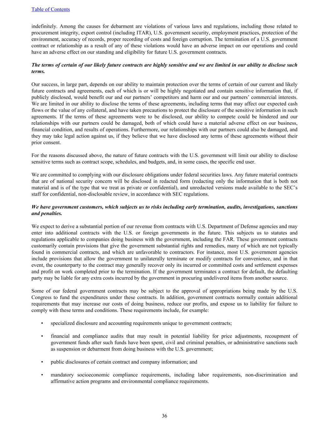 indefinitely. Among the causes for debarment are violations of various laws and regulations, including those related to procurement integrity, export control (including ITAR), U.S. government security, employment practices, protection of the environment, accuracy of records, proper recording of costs and foreign corruption. The termination of a U.S. government contract or relationship as a result of any of these violations would have an adverse impact on our operations and could have an adverse effect on our standing and eligibility for future U.S. government contracts. The terms of certain of our likely future contracts are highly sensitive and we are limited in our ability to disclose such terms. Our success, in large part, depends on our ability to maintain protection over the terms of certain of our current and likely future contracts and agreements, each of which is or will be highly negotiated and contain sensitive information that, if publicly disclosed, would benefit our and our partners’ competitors and harm our and our partners’ commercial interests. We are limited in our ability to disclose the terms of these agreements, including terms that may affect our expected cash flows or the value of any collateral, and have taken precautions to protect the disclosure of the sensitive information in such agreements. If the terms of these agreements were to be disclosed, our ability to compete could be hindered and our relationships with our partners could be damaged, both of which could have a material adverse effect on our business, financial condition, and results of operations. Furthermore, our relationships with our partners could also be damaged, and they may take legal action against us, if they believe that we have disclosed any terms of these agreements without their prior consent. For the reasons discussed above, the nature of future contracts with the U.S. government will limit our ability to disclose sensitive terms such as contract scope, schedules, and budgets, and, in some cases, the specific end user. We are committed to complying with our disclosure obligations under federal securities laws. Any future material contracts that are of national security concern will be disclosed in redacted form (redacting only the information that is both not material and is of the type that we treat as private or confidential), and unredacted versions made available to the SEC’s staff for confidential, non-disclosable review, in accordance with SEC regulations. We have government customers, which subjects us to risks including early termination, audits, investigations, sanctions and penalties. We expect to derive a substantial portion of our revenue from contracts with U.S. Department of Defense agencies and may enter into additional contracts with the U.S. or foreign governments in the future. This subjects us to statutes and regulations applicable to companies doing business with the government, including the FAR. These government contracts customarily contain provisions that give the government substantial rights and remedies, many of which are not typically found in commercial contracts, and which are unfavorable to contractors. For instance, most U.S. government agencies include provisions that allow the government to unilaterally terminate or modify contracts for convenience, and in that event, the counterparty to the contract may generally recover only its incurred or committed costs and settlement expenses and profit on work completed prior to the termination. If the government terminates a contract for default, the defaulting party may be liable for any extra costs incurred by the government in procuring undelivered items from another source. Some of our federal government contracts may be subject to the approval of appropriations being made by the U.S. Congress to fund the expenditures under these contracts. In addition, government contracts normally contain additional requirements that may increase our costs of doing business, reduce our profits, and expose us to liability for failure to comply with these terms and conditions. These requirements include, for example: • specialized disclosure and accounting requirements unique to government contracts; • financial and compliance audits that may result in potential liability for price adjustments, recoupment of government funds after such funds have been spent, civil and criminal penalties, or administrative sanctions such as suspension or debarment from doing business with the U.S. government; • public disclosures of certain contract and company information; and • mandatory socioeconomic compliance requirements, including labor requirements, non-discrimination and affirmative action programs and environmental compliance requirements. Table of Contents 36