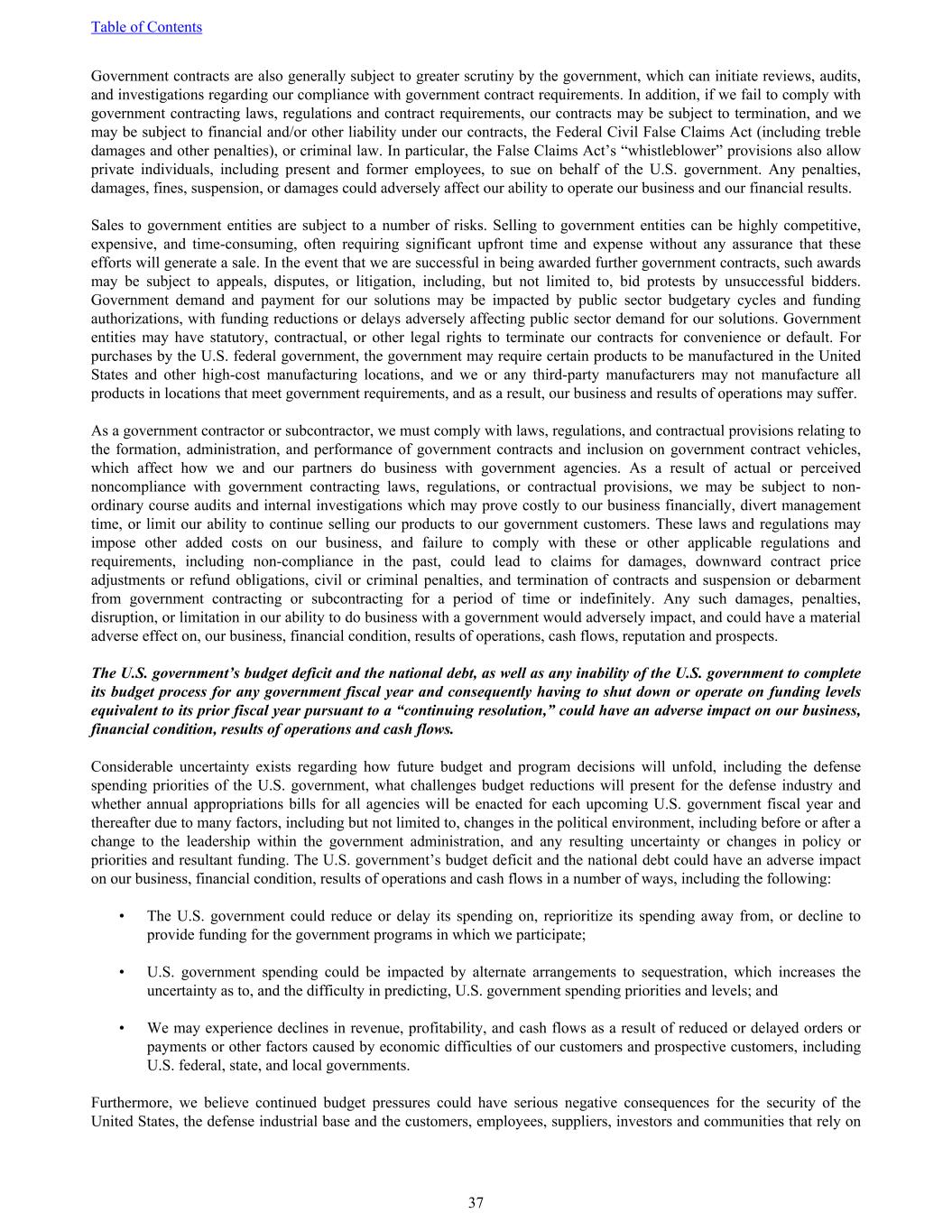 Government contracts are also generally subject to greater scrutiny by the government, which can initiate reviews, audits, and investigations regarding our compliance with government contract requirements. In addition, if we fail to comply with government contracting laws, regulations and contract requirements, our contracts may be subject to termination, and we may be subject to financial and/or other liability under our contracts, the Federal Civil False Claims Act (including treble damages and other penalties), or criminal law. In particular, the False Claims Act’s “whistleblower” provisions also allow private individuals, including present and former employees, to sue on behalf of the U.S. government. Any penalties, damages, fines, suspension, or damages could adversely affect our ability to operate our business and our financial results. Sales to government entities are subject to a number of risks. Selling to government entities can be highly competitive, expensive, and time-consuming, often requiring significant upfront time and expense without any assurance that these efforts will generate a sale. In the event that we are successful in being awarded further government contracts, such awards may be subject to appeals, disputes, or litigation, including, but not limited to, bid protests by unsuccessful bidders. Government demand and payment for our solutions may be impacted by public sector budgetary cycles and funding authorizations, with funding reductions or delays adversely affecting public sector demand for our solutions. Government entities may have statutory, contractual, or other legal rights to terminate our contracts for convenience or default. For purchases by the U.S. federal government, the government may require certain products to be manufactured in the United States and other high-cost manufacturing locations, and we or any third-party manufacturers may not manufacture all products in locations that meet government requirements, and as a result, our business and results of operations may suffer. As a government contractor or subcontractor, we must comply with laws, regulations, and contractual provisions relating to the formation, administration, and performance of government contracts and inclusion on government contract vehicles, which affect how we and our partners do business with government agencies. As a result of actual or perceived noncompliance with government contracting laws, regulations, or contractual provisions, we may be subject to non- ordinary course audits and internal investigations which may prove costly to our business financially, divert management time, or limit our ability to continue selling our products to our government customers. These laws and regulations may impose other added costs on our business, and failure to comply with these or other applicable regulations and requirements, including non-compliance in the past, could lead to claims for damages, downward contract price adjustments or refund obligations, civil or criminal penalties, and termination of contracts and suspension or debarment from government contracting or subcontracting for a period of time or indefinitely. Any such damages, penalties, disruption, or limitation in our ability to do business with a government would adversely impact, and could have a material adverse effect on, our business, financial condition, results of operations, cash flows, reputation and prospects. The U.S. government’s budget deficit and the national debt, as well as any inability of the U.S. government to complete its budget process for any government fiscal year and consequently having to shut down or operate on funding levels equivalent to its prior fiscal year pursuant to a “continuing resolution,” could have an adverse impact on our business, financial condition, results of operations and cash flows. Considerable uncertainty exists regarding how future budget and program decisions will unfold, including the defense spending priorities of the U.S. government, what challenges budget reductions will present for the defense industry and whether annual appropriations bills for all agencies will be enacted for each upcoming U.S. government fiscal year and thereafter due to many factors, including but not limited to, changes in the political environment, including before or after a change to the leadership within the government administration, and any resulting uncertainty or changes in policy or priorities and resultant funding. The U.S. government’s budget deficit and the national debt could have an adverse impact on our business, financial condition, results of operations and cash flows in a number of ways, including the following: • The U.S. government could reduce or delay its spending on, reprioritize its spending away from, or decline to provide funding for the government programs in which we participate; • U.S. government spending could be impacted by alternate arrangements to sequestration, which increases the uncertainty as to, and the difficulty in predicting, U.S. government spending priorities and levels; and • We may experience declines in revenue, profitability, and cash flows as a result of reduced or delayed orders or payments or other factors caused by economic difficulties of our customers and prospective customers, including U.S. federal, state, and local governments. Furthermore, we believe continued budget pressures could have serious negative consequences for the security of the United States, the defense industrial base and the customers, employees, suppliers, investors and communities that rely on Table of Contents 37