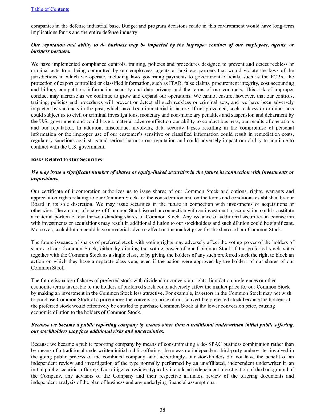 companies in the defense industrial base. Budget and program decisions made in this environment would have long-term implications for us and the entire defense industry. Our reputation and ability to do business may be impacted by the improper conduct of our employees, agents, or business partners. We have implemented compliance controls, training, policies and procedures designed to prevent and detect reckless or criminal acts from being committed by our employees, agents or business partners that would violate the laws of the jurisdictions in which we operate, including laws governing payments to government officials, such as the FCPA, the protection of export controlled or classified information, such as ITAR, false claims, procurement integrity, cost accounting and billing, competition, information security and data privacy and the terms of our contracts. This risk of improper conduct may increase as we continue to grow and expand our operations. We cannot ensure, however, that our controls, training, policies and procedures will prevent or detect all such reckless or criminal acts, and we have been adversely impacted by such acts in the past, which have been immaterial in nature. If not prevented, such reckless or criminal acts could subject us to civil or criminal investigations, monetary and non-monetary penalties and suspension and debarment by the U.S. government and could have a material adverse effect on our ability to conduct business, our results of operations and our reputation. In addition, misconduct involving data security lapses resulting in the compromise of personal information or the improper use of our customer’s sensitive or classified information could result in remediation costs, regulatory sanctions against us and serious harm to our reputation and could adversely impact our ability to continue to contract with the U.S. government. Risks Related to Our Securities We may issue a significant number of shares or equity-linked securities in the future in connection with investments or acquisitions. Our certificate of incorporation authorizes us to issue shares of our Common Stock and options, rights, warrants and appreciation rights relating to our Common Stock for the consideration and on the terms and conditions established by our Board in its sole discretion. We may issue securities in the future in connection with investments or acquisitions or otherwise. The amount of shares of Common Stock issued in connection with an investment or acquisition could constitute a material portion of our then-outstanding shares of Common Stock. Any issuance of additional securities in connection with investments or acquisitions may result in additional dilution to our stockholders and such dilution could be significant. Moreover, such dilution could have a material adverse effect on the market price for the shares of our Common Stock. The future issuance of shares of preferred stock with voting rights may adversely affect the voting power of the holders of shares of our Common Stock, either by diluting the voting power of our Common Stock if the preferred stock votes together with the Common Stock as a single class, or by giving the holders of any such preferred stock the right to block an action on which they have a separate class vote, even if the action were approved by the holders of our shares of our Common Stock. The future issuance of shares of preferred stock with dividend or conversion rights, liquidation preferences or other economic terms favorable to the holders of preferred stock could adversely affect the market price for our Common Stock by making an investment in the Common Stock less attractive. For example, investors in the Common Stock may not wish to purchase Common Stock at a price above the conversion price of our convertible preferred stock because the holders of the preferred stock would effectively be entitled to purchase Common Stock at the lower conversion price, causing economic dilution to the holders of Common Stock. Because we became a public reporting company by means other than a traditional underwritten initial public offering, our stockholders may face additional risks and uncertainties. Because we became a public reporting company by means of consummating a de- SPAC business combination rather than by means of a traditional underwritten initial public offering, there was no independent third-party underwriter involved in the going public process of the combined company, and, accordingly, our stockholders did not have the benefit of an independent review and investigation of the type normally performed by an unaffiliated, independent underwriter in an initial public securities offering. Due diligence reviews typically include an independent investigation of the background of the Company, any advisors of the Company and their respective affiliates, review of the offering documents and independent analysis of the plan of business and any underlying financial assumptions. Table of Contents 38