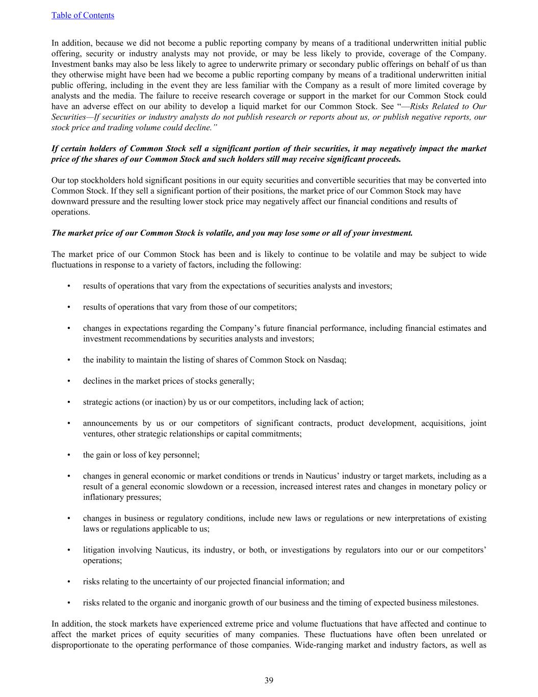 In addition, because we did not become a public reporting company by means of a traditional underwritten initial public offering, security or industry analysts may not provide, or may be less likely to provide, coverage of the Company. Investment banks may also be less likely to agree to underwrite primary or secondary public offerings on behalf of us than they otherwise might have been had we become a public reporting company by means of a traditional underwritten initial public offering, including in the event they are less familiar with the Company as a result of more limited coverage by analysts and the media. The failure to receive research coverage or support in the market for our Common Stock could have an adverse effect on our ability to develop a liquid market for our Common Stock. See “—Risks Related to Our Securities—If securities or industry analysts do not publish research or reports about us, or publish negative reports, our stock price and trading volume could decline.” If certain holders of Common Stock sell a significant portion of their securities, it may negatively impact the market price of the shares of our Common Stock and such holders still may receive significant proceeds. Our top stockholders hold significant positions in our equity securities and convertible securities that may be converted into Common Stock. If they sell a significant portion of their positions, the market price of our Common Stock may have downward pressure and the resulting lower stock price may negatively affect our financial conditions and results of operations. The market price of our Common Stock is volatile, and you may lose some or all of your investment. The market price of our Common Stock has been and is likely to continue to be volatile and may be subject to wide fluctuations in response to a variety of factors, including the following: • results of operations that vary from the expectations of securities analysts and investors; • results of operations that vary from those of our competitors; • changes in expectations regarding the Company’s future financial performance, including financial estimates and investment recommendations by securities analysts and investors; • the inability to maintain the listing of shares of Common Stock on Nasdaq; • declines in the market prices of stocks generally; • strategic actions (or inaction) by us or our competitors, including lack of action; • announcements by us or our competitors of significant contracts, product development, acquisitions, joint ventures, other strategic relationships or capital commitments; • the gain or loss of key personnel; • changes in general economic or market conditions or trends in Nauticus’ industry or target markets, including as a result of a general economic slowdown or a recession, increased interest rates and changes in monetary policy or inflationary pressures; • changes in business or regulatory conditions, include new laws or regulations or new interpretations of existing laws or regulations applicable to us; • litigation involving Nauticus, its industry, or both, or investigations by regulators into our or our competitors’ operations; • risks relating to the uncertainty of our projected financial information; and • risks related to the organic and inorganic growth of our business and the timing of expected business milestones. In addition, the stock markets have experienced extreme price and volume fluctuations that have affected and continue to affect the market prices of equity securities of many companies. These fluctuations have often been unrelated or disproportionate to the operating performance of those companies. Wide-ranging market and industry factors, as well as Table of Contents 39