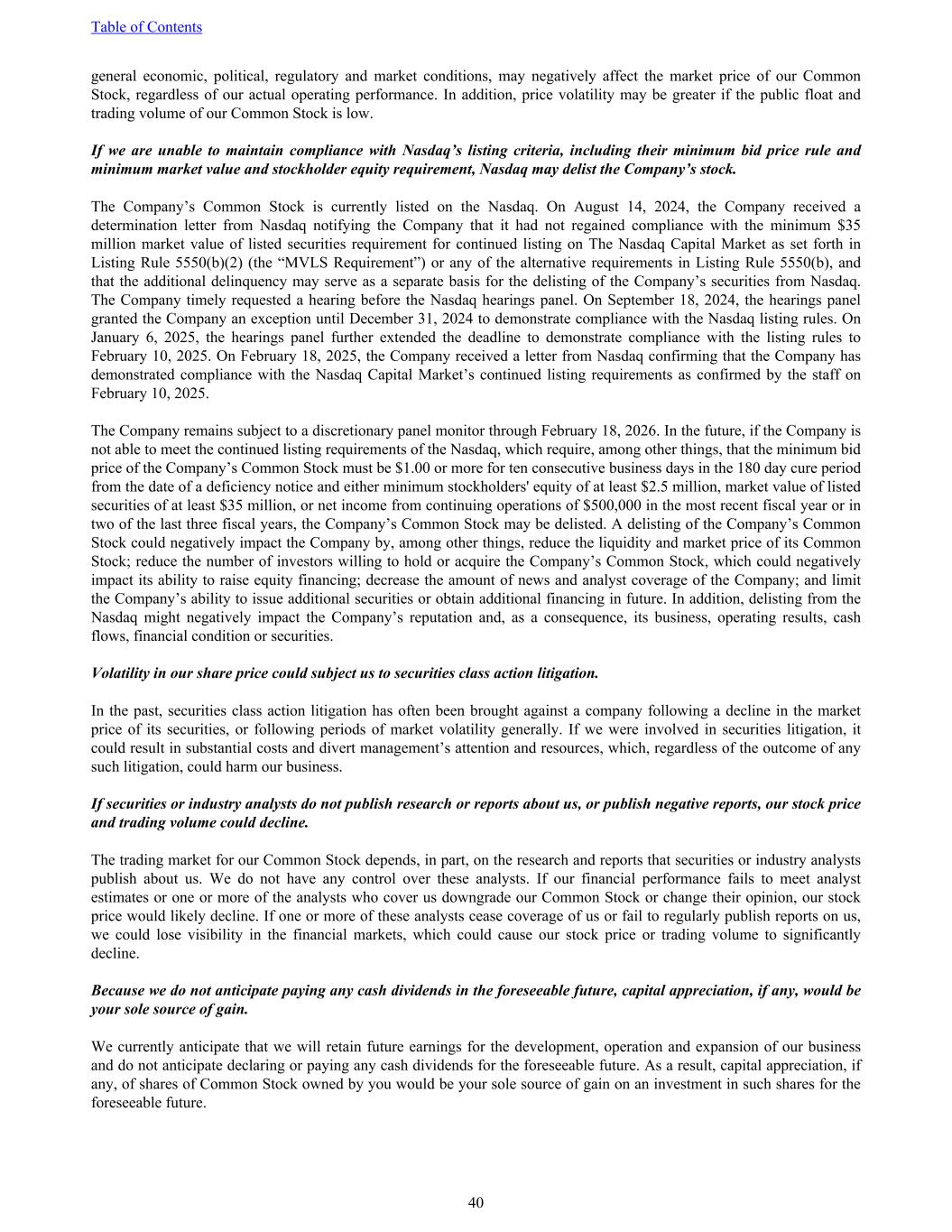 general economic, political, regulatory and market conditions, may negatively affect the market price of our Common Stock, regardless of our actual operating performance. In addition, price volatility may be greater if the public float and trading volume of our Common Stock is low. If we are unable to maintain compliance with Nasdaq’s listing criteria, including their minimum bid price rule and minimum market value and stockholder equity requirement, Nasdaq may delist the Company’s stock. The Company’s Common Stock is currently listed on the Nasdaq. On August 14, 2024, the Company received a determination letter from Nasdaq notifying the Company that it had not regained compliance with the minimum $35 million market value of listed securities requirement for continued listing on The Nasdaq Capital Market as set forth in Listing Rule 5550(b)(2) (the “MVLS Requirement”) or any of the alternative requirements in Listing Rule 5550(b), and that the additional delinquency may serve as a separate basis for the delisting of the Company’s securities from Nasdaq. The Company timely requested a hearing before the Nasdaq hearings panel. On September 18, 2024, the hearings panel granted the Company an exception until December 31, 2024 to demonstrate compliance with the Nasdaq listing rules. On January 6, 2025, the hearings panel further extended the deadline to demonstrate compliance with the listing rules to February 10, 2025. On February 18, 2025, the Company received a letter from Nasdaq confirming that the Company has demonstrated compliance with the Nasdaq Capital Market’s continued listing requirements as confirmed by the staff on February 10, 2025. The Company remains subject to a discretionary panel monitor through February 18, 2026. In the future, if the Company is not able to meet the continued listing requirements of the Nasdaq, which require, among other things, that the minimum bid price of the Company’s Common Stock must be $1.00 or more for ten consecutive business days in the 180 day cure period from the date of a deficiency notice and either minimum stockholders' equity of at least $2.5 million, market value of listed securities of at least $35 million, or net income from continuing operations of $500,000 in the most recent fiscal year or in two of the last three fiscal years, the Company’s Common Stock may be delisted. A delisting of the Company’s Common Stock could negatively impact the Company by, among other things, reduce the liquidity and market price of its Common Stock; reduce the number of investors willing to hold or acquire the Company’s Common Stock, which could negatively impact its ability to raise equity financing; decrease the amount of news and analyst coverage of the Company; and limit the Company’s ability to issue additional securities or obtain additional financing in future. In addition, delisting from the Nasdaq might negatively impact the Company’s reputation and, as a consequence, its business, operating results, cash flows, financial condition or securities. Volatility in our share price could subject us to securities class action litigation. In the past, securities class action litigation has often been brought against a company following a decline in the market price of its securities, or following periods of market volatility generally. If we were involved in securities litigation, it could result in substantial costs and divert management’s attention and resources, which, regardless of the outcome of any such litigation, could harm our business. If securities or industry analysts do not publish research or reports about us, or publish negative reports, our stock price and trading volume could decline. The trading market for our Common Stock depends, in part, on the research and reports that securities or industry analysts publish about us. We do not have any control over these analysts. If our financial performance fails to meet analyst estimates or one or more of the analysts who cover us downgrade our Common Stock or change their opinion, our stock price would likely decline. If one or more of these analysts cease coverage of us or fail to regularly publish reports on us, we could lose visibility in the financial markets, which could cause our stock price or trading volume to significantly decline. Because we do not anticipate paying any cash dividends in the foreseeable future, capital appreciation, if any, would be your sole source of gain. We currently anticipate that we will retain future earnings for the development, operation and expansion of our business and do not anticipate declaring or paying any cash dividends for the foreseeable future. As a result, capital appreciation, if any, of shares of Common Stock owned by you would be your sole source of gain on an investment in such shares for the foreseeable future. Table of Contents 40