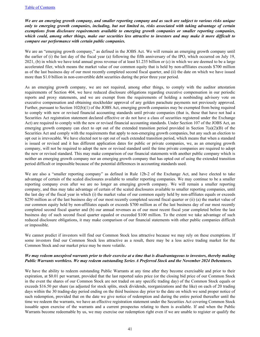 We are an emerging growth company, and smaller reporting company and as such are subject to various risks unique only to emerging growth companies, including, but not limited to, risks associated with taking advantage of certain exemptions from disclosure requirements available to emerging growth companies or smaller reporting companies, which could, among other things, make our securities less attractive to investors and may make it more difficult to compare our performance with certain public companies. We are an “emerging growth company,” as defined in the JOBS Act. We will remain an emerging growth company until the earlier of (i) the last day of the fiscal year (a) following the fifth anniversary of the IPO, which occurred on July 19, 2021, (b) in which we have total annual gross revenue of at least $1.235 billion or (c) in which we are deemed to be a large accelerated filer, which means the market value of our common equity that is held by non-affiliates exceeds $700 million as of the last business day of our most recently completed second fiscal quarter, and (ii) the date on which we have issued more than $1.0 billion in non-convertible debt securities during the prior three year period. As an emerging growth company, we are not required, among other things, to comply with the auditor attestation requirements of Section 404, we have reduced disclosure obligations regarding executive compensation in our periodic reports and proxy statements, and we are exempt from the requirements of holding a nonbinding advisory vote on executive compensation and obtaining stockholder approval of any golden parachute payments not previously approved. Further, pursuant to Section 102(b)(1) of the JOBS Act, emerging growth companies may be exempted from being required to comply with new or revised financial accounting standards until private companies (that is, those that have not had a Securities Act registration statement declared effective or do not have a class of securities registered under the Exchange Act) are required to comply with the new or revised financial accounting standards. Under Section 107 of the JOBS Act, an emerging growth company can elect to opt out of the extended transition period provided in Section 7(a)(2)(B) of the Securities Act and comply with the requirements that apply to non-emerging growth companies, but any such an election to opt out is irrevocable. We have elected not to opt out of such extended transition period, which means that when a standard is issued or revised and it has different application dates for public or private companies, we, as an emerging growth company, will not be required to adopt the new or revised standard until the time private companies are required to adopt the new or revised standard. This may make comparison of our financial statements with another public company which is neither an emerging growth company nor an emerging growth company that has opted out of using the extended transition period difficult or impossible because of the potential differences in accounting standards used. We are also a “smaller reporting company” as defined in Rule 12b-2 of the Exchange Act, and have elected to take advantage of certain of the scaled disclosures available to smaller reporting companies. We may continue to be a smaller reporting company even after we are no longer an emerging growth company. We will remain a smaller reporting company, and thus may take advantage of certain of the scaled disclosures available to smaller reporting companies, until the last day of the fiscal year in which (i) the market value of our common equity held by non-affiliates equals or exceeds $250 million as of the last business day of our most recently completed second fiscal quarter or (ii) (a) the market value of our common equity held by non-affiliates equals or exceeds $700 million as of the last business day of our most recently completed second fiscal quarter and (b) our annual revenues as of our most recent fiscal year completed before the last business day of such second fiscal quarter equaled or exceeded $100 million. To the extent we take advantage of such reduced disclosure obligations, it may make comparison of our financial statements with other public companies difficult or impossible. We cannot predict if investors will find our Common Stock less attractive because we may rely on these exemptions. If some investors find our Common Stock less attractive as a result, there may be a less active trading market for the Common Stock and our market price may be more volatile. We may redeem unexpired warrants prior to their exercise at a time that is disadvantageous to investors, thereby making Public Warrants worthless. We may redeem outstanding Series A Preferred Stock and the November 2024 Debentures. We have the ability to redeem outstanding Public Warrants at any time after they become exercisable and prior to their expiration, at $0.01 per warrant, provided that the last reported sales price (or the closing bid price of our Common Stock in the event the shares of our Common Stock are not traded on any specific trading day) of the Common Stock equals or exceeds $16.50 per share (as adjusted for stock splits, stock dividends, reorganizations and the like) on each of 20 trading days within the 30 trading-day period ending on the third business day prior to the date on which we send proper notice of such redemption, provided that on the date we give notice of redemption and during the entire period thereafter until the time we redeem the warrants, we have an effective registration statement under the Securities Act covering Common Stock issuable upon exercise of the warrants and a current prospectus relating to them is available. If and when the Public Warrants become redeemable by us, we may exercise our redemption right even if we are unable to register or qualify the Table of Contents 41