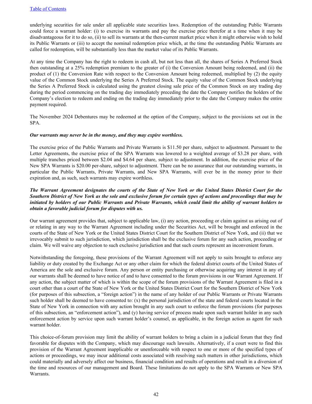 underlying securities for sale under all applicable state securities laws. Redemption of the outstanding Public Warrants could force a warrant holder: (i) to exercise its warrants and pay the exercise price therefor at a time when it may be disadvantageous for it to do so, (ii) to sell its warrants at the then-current market price when it might otherwise wish to hold its Public Warrants or (iii) to accept the nominal redemption price which, at the time the outstanding Public Warrants are called for redemption, will be substantially less than the market value of its Public Warrants. At any time the Company has the right to redeem in cash all, but not less than all, the shares of Series A Preferred Stock then outstanding at a 25% redemption premium to the greater of (i) the Conversion Amount being redeemed, and (ii) the product of (1) the Conversion Rate with respect to the Conversion Amount being redeemed, multiplied by (2) the equity value of the Common Stock underlying the Series A Preferred Stock. The equity value of the Common Stock underlying the Series A Preferred Stock is calculated using the greatest closing sale price of the Common Stock on any trading day during the period commencing on the trading day immediately preceding the date the Company notifies the holders of the Company’s election to redeem and ending on the trading day immediately prior to the date the Company makes the entire payment required. The November 2024 Debentures may be redeemed at the option of the Company, subject to the provisions set out in the SPA. Our warrants may never be in the money, and they may expire worthless. The exercise price of the Public Warrants and Private Warrants is $11.50 per share, subject to adjustment. Pursuant to the Letter Agreements, the exercise price of the SPA Warrants was lowered to a weighted average of $3.28 per share, with multiple tranches priced between $2.04 and $4.64 per share, subject to adjustment. In addition, the exercise price of the New SPA Warrants is $20.00 per-share, subject to adjustment. There can be no assurance that our outstanding warrants, in particular the Public Warrants, Private Warrants, and New SPA Warrants, will ever be in the money prior to their expiration and, as such, such warrants may expire worthless. The Warrant Agreement designates the courts of the State of New York or the United States District Court for the Southern District of New York as the sole and exclusive forum for certain types of actions and proceedings that may be initiated by holders of our Public Warrants and Private Warrants, which could limit the ability of warrant holders to obtain a favorable judicial forum for disputes with us. Our warrant agreement provides that, subject to applicable law, (i) any action, proceeding or claim against us arising out of or relating in any way to the Warrant Agreement including under the Securities Act, will be brought and enforced in the courts of the State of New York or the United States District Court for the Southern District of New York, and (ii) that we irrevocably submit to such jurisdiction, which jurisdiction shall be the exclusive forum for any such action, proceeding or claim. We will waive any objection to such exclusive jurisdiction and that such courts represent an inconvenient forum. Notwithstanding the foregoing, these provisions of the Warrant Agreement will not apply to suits brought to enforce any liability or duty created by the Exchange Act or any other claim for which the federal district courts of the United States of America are the sole and exclusive forum. Any person or entity purchasing or otherwise acquiring any interest in any of our warrants shall be deemed to have notice of and to have consented to the forum provisions in our Warrant Agreement. If any action, the subject matter of which is within the scope of the forum provisions of the Warrant Agreement is filed in a court other than a court of the State of New York or the United States District Court for the Southern District of New York (for purposes of this subsection, a “foreign action”) in the name of any holder of our Public Warrants or Private Warrants such holder shall be deemed to have consented to: (x) the personal jurisdiction of the state and federal courts located in the State of New York in connection with any action brought in any such court to enforce the forum provisions (for purposes of this subsection, an “enforcement action”), and (y) having service of process made upon such warrant holder in any such enforcement action by service upon such warrant holder’s counsel, as applicable, in the foreign action as agent for such warrant holder. This choice-of-forum provision may limit the ability of warrant holders to bring a claim in a judicial forum that they find favorable for disputes with the Company, which may discourage such lawsuits. Alternatively, if a court were to find this provision of the Warrant Agreement inapplicable or unenforceable with respect to one or more of the specified types of actions or proceedings, we may incur additional costs associated with resolving such matters in other jurisdictions, which could materially and adversely affect our business, financial condition and results of operations and result in a diversion of the time and resources of our management and Board. These limitations do not apply to the SPA Warrants or New SPA Warrants. Table of Contents 42