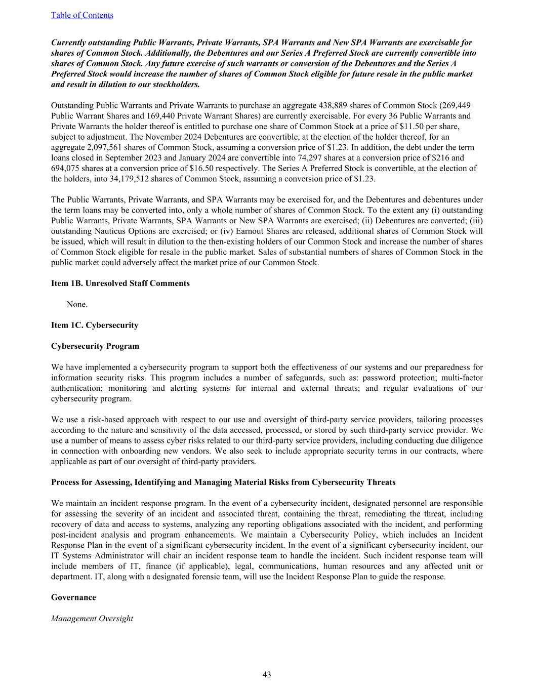 Currently outstanding Public Warrants, Private Warrants, SPA Warrants and New SPA Warrants are exercisable for shares of Common Stock. Additionally, the Debentures and our Series A Preferred Stock are currently convertible into shares of Common Stock. Any future exercise of such warrants or conversion of the Debentures and the Series A Preferred Stock would increase the number of shares of Common Stock eligible for future resale in the public market and result in dilution to our stockholders. Outstanding Public Warrants and Private Warrants to purchase an aggregate 438,889 shares of Common Stock (269,449 Public Warrant Shares and 169,440 Private Warrant Shares) are currently exercisable. For every 36 Public Warrants and Private Warrants the holder thereof is entitled to purchase one share of Common Stock at a price of $11.50 per share, subject to adjustment. The November 2024 Debentures are convertible, at the election of the holder thereof, for an aggregate 2,097,561 shares of Common Stock, assuming a conversion price of $1.23. In addition, the debt under the term loans closed in September 2023 and January 2024 are convertible into 74,297 shares at a conversion price of $216 and 694,075 shares at a conversion price of $16.50 respectively. The Series A Preferred Stock is convertible, at the election of the holders, into 34,179,512 shares of Common Stock, assuming a conversion price of $1.23. The Public Warrants, Private Warrants, and SPA Warrants may be exercised for, and the Debentures and debentures under the term loans may be converted into, only a whole number of shares of Common Stock. To the extent any (i) outstanding Public Warrants, Private Warrants, SPA Warrants or New SPA Warrants are exercised; (ii) Debentures are converted; (iii) outstanding Nauticus Options are exercised; or (iv) Earnout Shares are released, additional shares of Common Stock will be issued, which will result in dilution to the then-existing holders of our Common Stock and increase the number of shares of Common Stock eligible for resale in the public market. Sales of substantial numbers of shares of Common Stock in the public market could adversely affect the market price of our Common Stock. Item 1B. Unresolved Staff Comments None. Item 1C. Cybersecurity Cybersecurity Program We have implemented a cybersecurity program to support both the effectiveness of our systems and our preparedness for information security risks. This program includes a number of safeguards, such as: password protection; multi-factor authentication; monitoring and alerting systems for internal and external threats; and regular evaluations of our cybersecurity program. We use a risk-based approach with respect to our use and oversight of third-party service providers, tailoring processes according to the nature and sensitivity of the data accessed, processed, or stored by such third-party service provider. We use a number of means to assess cyber risks related to our third-party service providers, including conducting due diligence in connection with onboarding new vendors. We also seek to include appropriate security terms in our contracts, where applicable as part of our oversight of third-party providers. Process for Assessing, Identifying and Managing Material Risks from Cybersecurity Threats We maintain an incident response program. In the event of a cybersecurity incident, designated personnel are responsible for assessing the severity of an incident and associated threat, containing the threat, remediating the threat, including recovery of data and access to systems, analyzing any reporting obligations associated with the incident, and performing post-incident analysis and program enhancements. We maintain a Cybersecurity Policy, which includes an Incident Response Plan in the event of a significant cybersecurity incident. In the event of a significant cybersecurity incident, our IT Systems Administrator will chair an incident response team to handle the incident. Such incident response team will include members of IT, finance (if applicable), legal, communications, human resources and any affected unit or department. IT, along with a designated forensic team, will use the Incident Response Plan to guide the response. Governance Management Oversight Table of Contents 43