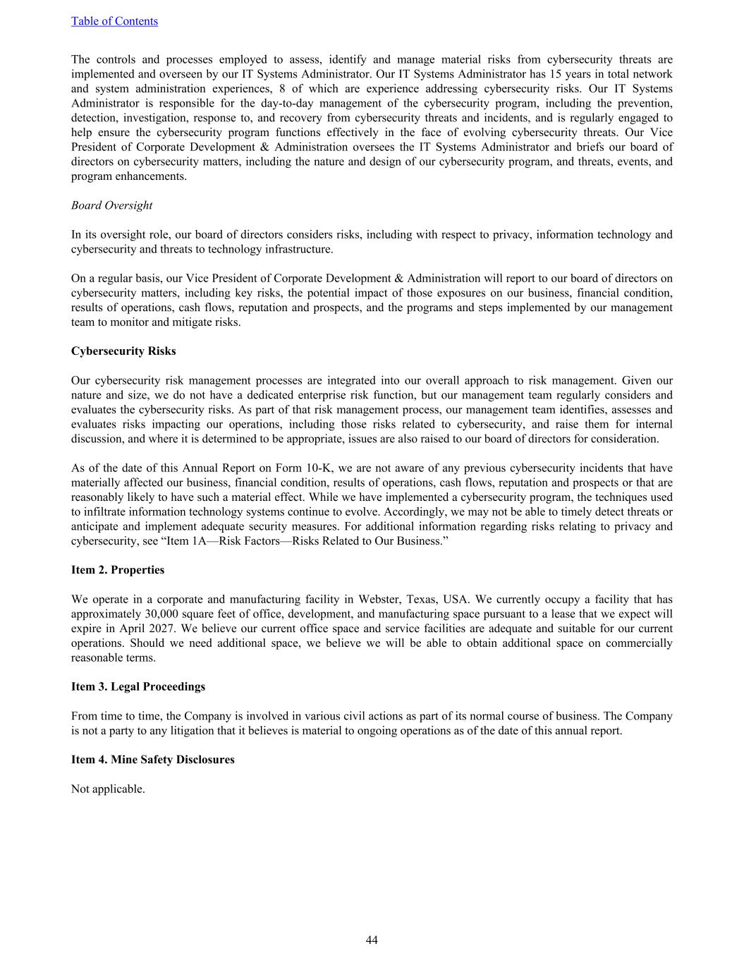 The controls and processes employed to assess, identify and manage material risks from cybersecurity threats are implemented and overseen by our IT Systems Administrator. Our IT Systems Administrator has 15 years in total network and system administration experiences, 8 of which are experience addressing cybersecurity risks. Our IT Systems Administrator is responsible for the day-to-day management of the cybersecurity program, including the prevention, detection, investigation, response to, and recovery from cybersecurity threats and incidents, and is regularly engaged to help ensure the cybersecurity program functions effectively in the face of evolving cybersecurity threats. Our Vice President of Corporate Development & Administration oversees the IT Systems Administrator and briefs our board of directors on cybersecurity matters, including the nature and design of our cybersecurity program, and threats, events, and program enhancements. Board Oversight In its oversight role, our board of directors considers risks, including with respect to privacy, information technology and cybersecurity and threats to technology infrastructure. On a regular basis, our Vice President of Corporate Development & Administration will report to our board of directors on cybersecurity matters, including key risks, the potential impact of those exposures on our business, financial condition, results of operations, cash flows, reputation and prospects, and the programs and steps implemented by our management team to monitor and mitigate risks. Cybersecurity Risks Our cybersecurity risk management processes are integrated into our overall approach to risk management. Given our nature and size, we do not have a dedicated enterprise risk function, but our management team regularly considers and evaluates the cybersecurity risks. As part of that risk management process, our management team identifies, assesses and evaluates risks impacting our operations, including those risks related to cybersecurity, and raise them for internal discussion, and where it is determined to be appropriate, issues are also raised to our board of directors for consideration. As of the date of this Annual Report on Form 10-K, we are not aware of any previous cybersecurity incidents that have materially affected our business, financial condition, results of operations, cash flows, reputation and prospects or that are reasonably likely to have such a material effect. While we have implemented a cybersecurity program, the techniques used to infiltrate information technology systems continue to evolve. Accordingly, we may not be able to timely detect threats or anticipate and implement adequate security measures. For additional information regarding risks relating to privacy and cybersecurity, see “Item 1A—Risk Factors—Risks Related to Our Business.” Item 2. Properties We operate in a corporate and manufacturing facility in Webster, Texas, USA. We currently occupy a facility that has approximately 30,000 square feet of office, development, and manufacturing space pursuant to a lease that we expect will expire in April 2027. We believe our current office space and service facilities are adequate and suitable for our current operations. Should we need additional space, we believe we will be able to obtain additional space on commercially reasonable terms. Item 3. Legal Proceedings From time to time, the Company is involved in various civil actions as part of its normal course of business. The Company is not a party to any litigation that it believes is material to ongoing operations as of the date of this annual report. Item 4. Mine Safety Disclosures Not applicable. Table of Contents 44