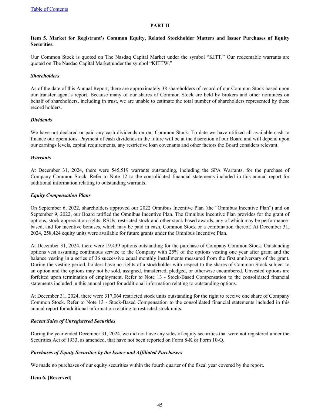 PART II Item 5. Market for Registrant’s Common Equity, Related Stockholder Matters and Issuer Purchases of Equity Securities. Our Common Stock is quoted on The Nasdaq Capital Market under the symbol “KITT.” Our redeemable warrants are quoted on The Nasdaq Capital Market under the symbol “KITTW.” Shareholders As of the date of this Annual Report, there are approximately 38 shareholders of record of our Common Stock based upon our transfer agent’s report. Because many of our shares of Common Stock are held by brokers and other nominees on behalf of shareholders, including in trust, we are unable to estimate the total number of shareholders represented by these record holders. Dividends We have not declared or paid any cash dividends on our Common Stock. To date we have utilized all available cash to finance our operations. Payment of cash dividends in the future will be at the discretion of our Board and will depend upon our earnings levels, capital requirements, any restrictive loan covenants and other factors the Board considers relevant. Warrants At December 31, 2024, there were 545,519 warrants outstanding, including the SPA Warrants, for the purchase of Company Common Stock. Refer to Note 12 to the consolidated financial statements included in this annual report for additional information relating to outstanding warrants. Equity Compensation Plans On September 6, 2022, shareholders approved our 2022 Omnibus Incentive Plan (the “Omnibus Incentive Plan”) and on September 9, 2022, our Board ratified the Omnibus Incentive Plan. The Omnibus Incentive Plan provides for the grant of options, stock appreciation rights, RSUs, restricted stock and other stock-based awards, any of which may be performance- based, and for incentive bonuses, which may be paid in cash, Common Stock or a combination thereof. At December 31, 2024, 258,424 equity units were available for future grants under the Omnibus Incentive Plan. At December 31, 2024, there were 19,439 options outstanding for the purchase of Company Common Stock. Outstanding options vest assuming continuous service to the Company with 25% of the options vesting one year after grant and the balance vesting in a series of 36 successive equal monthly installments measured from the first anniversary of the grant. During the vesting period, holders have no rights of a stockholder with respect to the shares of Common Stock subject to an option and the options may not be sold, assigned, transferred, pledged, or otherwise encumbered. Unvested options are forfeited upon termination of employment. Refer to Note 13 - Stock-Based Compensation to the consolidated financial statements included in this annual report for additional information relating to outstanding options. At December 31, 2024, there were 317,064 restricted stock units outstanding for the right to receive one share of Company Common Stock. Refer to Note 13 - Stock-Based Compensation to the consolidated financial statements included in this annual report for additional information relating to restricted stock units. Recent Sales of Unregistered Securities During the year ended December 31, 2024, we did not have any sales of equity securities that were not registered under the Securities Act of 1933, as amended, that have not been reported on Form 8-K or Form 10-Q. Purchases of Equity Securities by the Issuer and Affiliated Purchasers We made no purchases of our equity securities within the fourth quarter of the fiscal year covered by the report. Item 6. [Reserved] Table of Contents 45