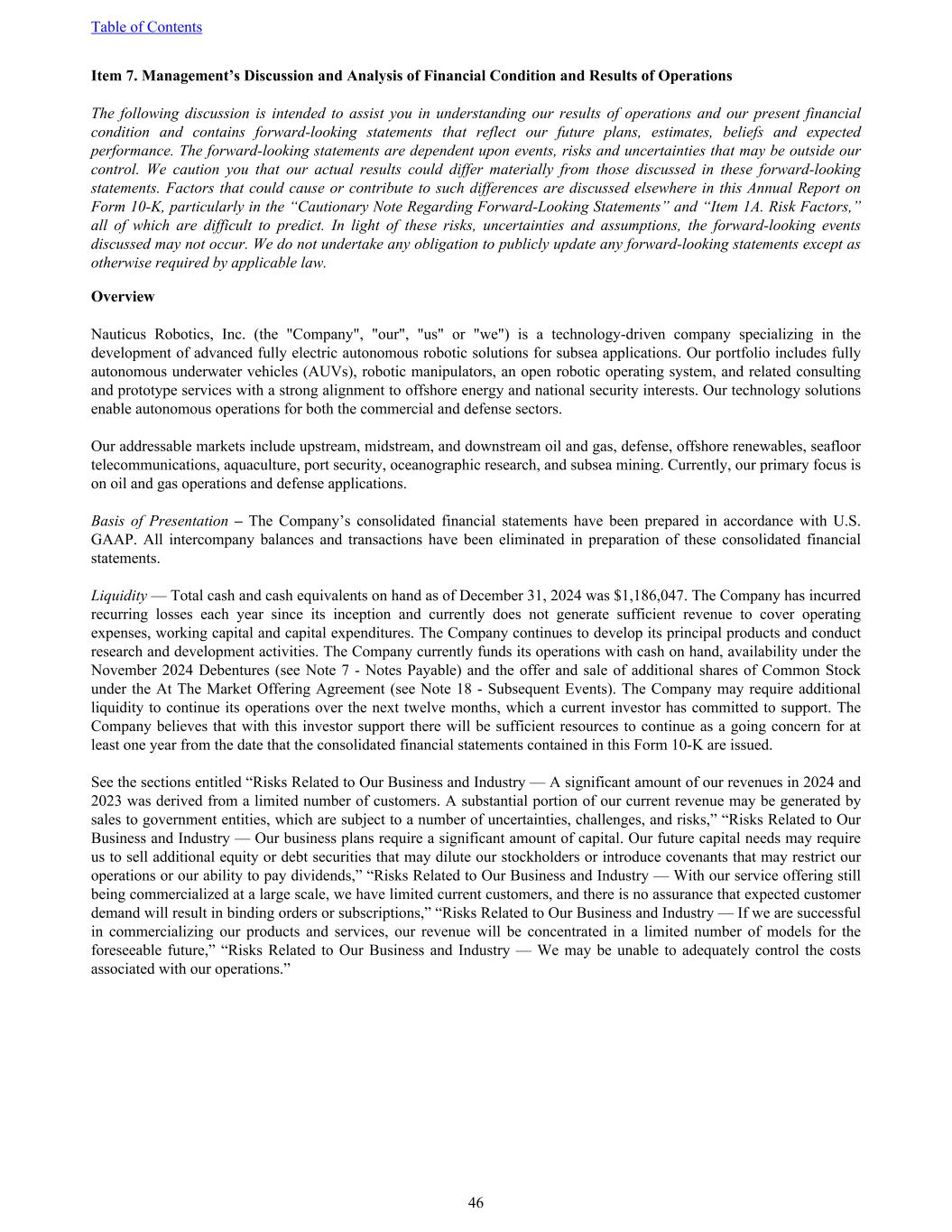 Item 7. Management’s Discussion and Analysis of Financial Condition and Results of Operations The following discussion is intended to assist you in understanding our results of operations and our present financial condition and contains forward-looking statements that reflect our future plans, estimates, beliefs and expected performance. The forward-looking statements are dependent upon events, risks and uncertainties that may be outside our control. We caution you that our actual results could differ materially from those discussed in these forward-looking statements. Factors that could cause or contribute to such differences are discussed elsewhere in this Annual Report on Form 10-K, particularly in the “Cautionary Note Regarding Forward-Looking Statements” and “Item 1A. Risk Factors,” all of which are difficult to predict. In light of these risks, uncertainties and assumptions, the forward-looking events discussed may not occur. We do not undertake any obligation to publicly update any forward-looking statements except as otherwise required by applicable law. Overview Nauticus Robotics, Inc. (the "Company", "our", "us" or "we") is a technology-driven company specializing in the development of advanced fully electric autonomous robotic solutions for subsea applications. Our portfolio includes fully autonomous underwater vehicles (AUVs), robotic manipulators, an open robotic operating system, and related consulting and prototype services with a strong alignment to offshore energy and national security interests. Our technology solutions enable autonomous operations for both the commercial and defense sectors. Our addressable markets include upstream, midstream, and downstream oil and gas, defense, offshore renewables, seafloor telecommunications, aquaculture, port security, oceanographic research, and subsea mining. Currently, our primary focus is on oil and gas operations and defense applications. Basis of Presentation – The Company’s consolidated financial statements have been prepared in accordance with U.S. GAAP. All intercompany balances and transactions have been eliminated in preparation of these consolidated financial statements. Liquidity — Total cash and cash equivalents on hand as of December 31, 2024 was $1,186,047. The Company has incurred recurring losses each year since its inception and currently does not generate sufficient revenue to cover operating expenses, working capital and capital expenditures. The Company continues to develop its principal products and conduct research and development activities. The Company currently funds its operations with cash on hand, availability under the November 2024 Debentures (see Note 7 - Notes Payable) and the offer and sale of additional shares of Common Stock under the At The Market Offering Agreement (see Note 18 - Subsequent Events). The Company may require additional liquidity to continue its operations over the next twelve months, which a current investor has committed to support. The Company believes that with this investor support there will be sufficient resources to continue as a going concern for at least one year from the date that the consolidated financial statements contained in this Form 10-K are issued. See the sections entitled “Risks Related to Our Business and Industry — A significant amount of our revenues in 2024 and 2023 was derived from a limited number of customers. A substantial portion of our current revenue may be generated by sales to government entities, which are subject to a number of uncertainties, challenges, and risks,” “Risks Related to Our Business and Industry — Our business plans require a significant amount of capital. Our future capital needs may require us to sell additional equity or debt securities that may dilute our stockholders or introduce covenants that may restrict our operations or our ability to pay dividends,” “Risks Related to Our Business and Industry — With our service offering still being commercialized at a large scale, we have limited current customers, and there is no assurance that expected customer demand will result in binding orders or subscriptions,” “Risks Related to Our Business and Industry — If we are successful in commercializing our products and services, our revenue will be concentrated in a limited number of models for the foreseeable future,” “Risks Related to Our Business and Industry — We may be unable to adequately control the costs associated with our operations.” Table of Contents 46
