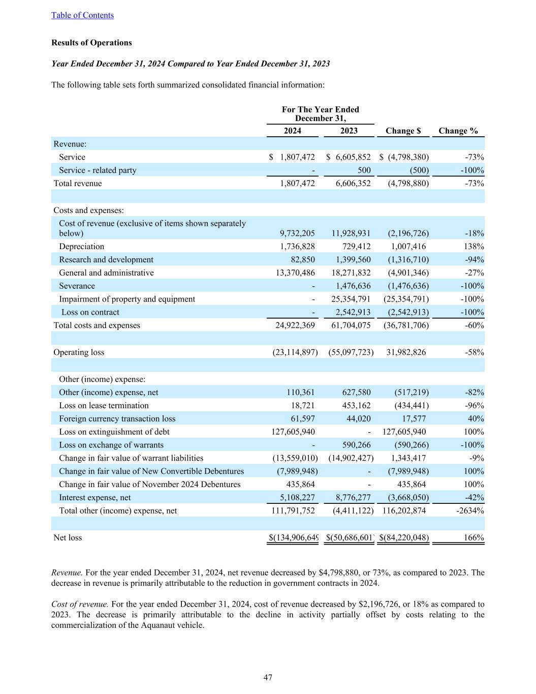 Results of Operations Year Ended December 31, 2024 Compared to Year Ended December 31, 2023 The following table sets forth summarized consolidated financial information: For The Year Ended December 31, Change $ Change % 2024 2023 Revenue: Service $ 1,807,472 $ 6,605,852 $ (4,798,380) -73% Service - related party - 500 (500) -100% Total revenue 1,807,472 6,606,352 (4,798,880) -73% Costs and expenses: Cost of revenue (exclusive of items shown separately below) 9,732,205 11,928,931 (2,196,726) -18% Depreciation 1,736,828 729,412 1,007,416 138% Research and development 82,850 1,399,560 (1,316,710) -94% General and administrative 13,370,486 18,271,832 (4,901,346) -27% Severance - 1,476,636 (1,476,636) -100% Impairment of property and equipment - 25,354,791 (25,354,791) -100% Loss on contract - 2,542,913 (2,542,913) -100% Total costs and expenses 24,922,369 61,704,075 (36,781,706) -60% Operating loss (23,114,897) (55,097,723) 31,982,826 -58% Other (income) expense: Other (income) expense, net 110,361 627,580 (517,219) -82% Loss on lease termination 18,721 453,162 (434,441) -96% Foreign currency transaction loss 61,597 44,020 17,577 40% Loss on extinguishment of debt 127,605,940 - 127,605,940 100% Loss on exchange of warrants - 590,266 (590,266) -100% Change in fair value of warrant liabilities (13,559,010) (14,902,427) 1,343,417 -9% Change in fair value of New Convertible Debentures (7,989,948) - (7,989,948) 100% Change in fair value of November 2024 Debentures 435,864 - 435,864 100% Interest expense, net 5,108,227 8,776,277 (3,668,050) -42% Total other (income) expense, net 111,791,752 (4,411,122) 116,202,874 -2634% Net loss $ (134,906,649) $ (50,686,601) $ (84,220,048) 166% Revenue. For the year ended December 31, 2024, net revenue decreased by $4,798,880, or 73%, as compared to 2023. The decrease in revenue is primarily attributable to the reduction in government contracts in 2024. Cost of revenue. For the year ended December 31, 2024, cost of revenue decreased by $2,196,726, or 18% as compared to 2023. The decrease is primarily attributable to the decline in activity partially offset by costs relating to the commercialization of the Aquanaut vehicle. Table of Contents 47