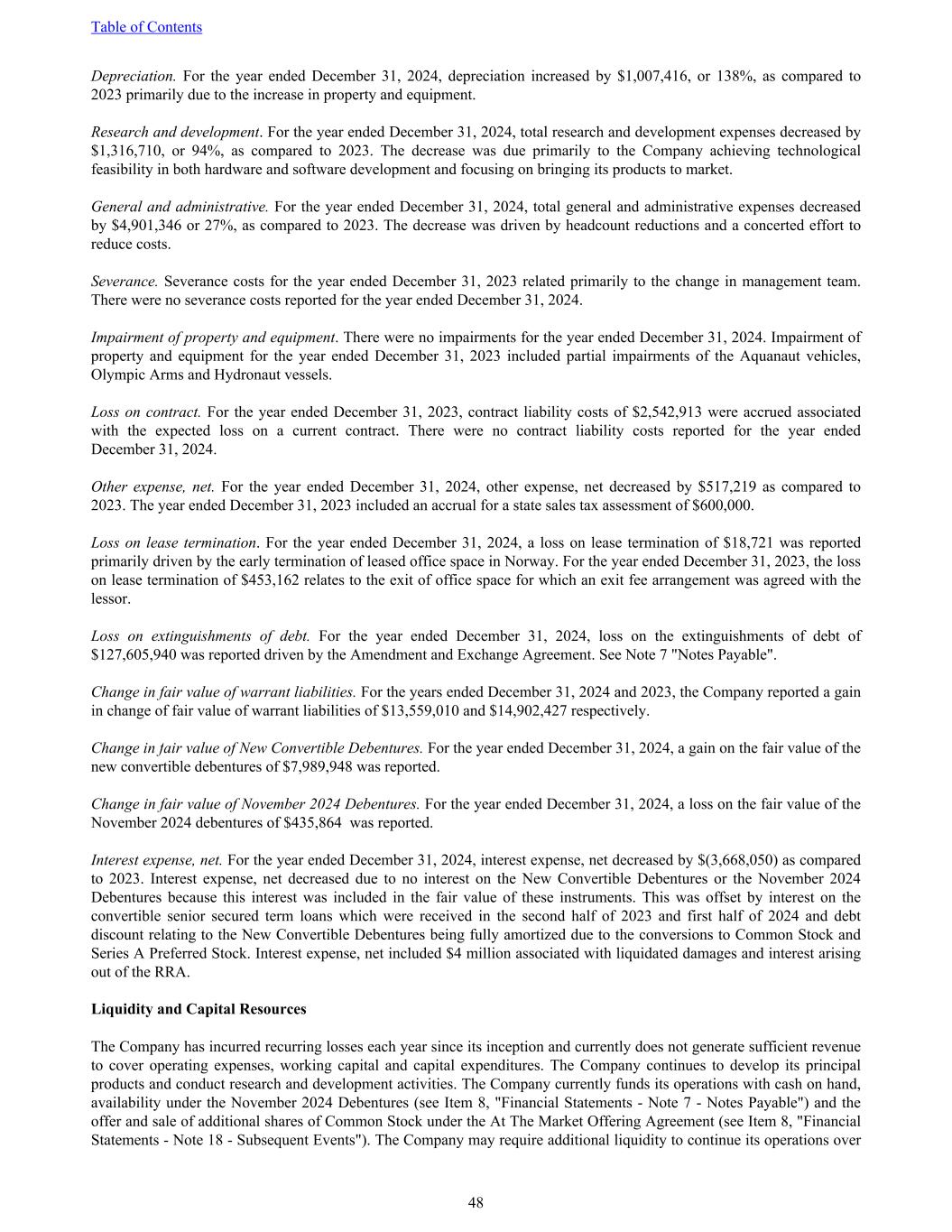Depreciation. For the year ended December 31, 2024, depreciation increased by $1,007,416, or 138%, as compared to 2023 primarily due to the increase in property and equipment. Research and development. For the year ended December 31, 2024, total research and development expenses decreased by $1,316,710, or 94%, as compared to 2023. The decrease was due primarily to the Company achieving technological feasibility in both hardware and software development and focusing on bringing its products to market. General and administrative. For the year ended December 31, 2024, total general and administrative expenses decreased by $4,901,346 or 27%, as compared to 2023. The decrease was driven by headcount reductions and a concerted effort to reduce costs. Severance. Severance costs for the year ended December 31, 2023 related primarily to the change in management team. There were no severance costs reported for the year ended December 31, 2024. Impairment of property and equipment. There were no impairments for the year ended December 31, 2024. Impairment of property and equipment for the year ended December 31, 2023 included partial impairments of the Aquanaut vehicles, Olympic Arms and Hydronaut vessels. Loss on contract. For the year ended December 31, 2023, contract liability costs of $2,542,913 were accrued associated with the expected loss on a current contract. There were no contract liability costs reported for the year ended December 31, 2024. Other expense, net. For the year ended December 31, 2024, other expense, net decreased by $517,219 as compared to 2023. The year ended December 31, 2023 included an accrual for a state sales tax assessment of $600,000. Loss on lease termination. For the year ended December 31, 2024, a loss on lease termination of $18,721 was reported primarily driven by the early termination of leased office space in Norway. For the year ended December 31, 2023, the loss on lease termination of $453,162 relates to the exit of office space for which an exit fee arrangement was agreed with the lessor. Loss on extinguishments of debt. For the year ended December 31, 2024, loss on the extinguishments of debt of $127,605,940 was reported driven by the Amendment and Exchange Agreement. See Note 7 "Notes Payable". Change in fair value of warrant liabilities. For the years ended December 31, 2024 and 2023, the Company reported a gain in change of fair value of warrant liabilities of $13,559,010 and $14,902,427 respectively. Change in fair value of New Convertible Debentures. For the year ended December 31, 2024, a gain on the fair value of the new convertible debentures of $7,989,948 was reported. Change in fair value of November 2024 Debentures. For the year ended December 31, 2024, a loss on the fair value of the November 2024 debentures of $435,864 was reported. Interest expense, net. For the year ended December 31, 2024, interest expense, net decreased by $(3,668,050) as compared to 2023. Interest expense, net decreased due to no interest on the New Convertible Debentures or the November 2024 Debentures because this interest was included in the fair value of these instruments. This was offset by interest on the convertible senior secured term loans which were received in the second half of 2023 and first half of 2024 and debt discount relating to the New Convertible Debentures being fully amortized due to the conversions to Common Stock and Series A Preferred Stock. Interest expense, net included $4 million associated with liquidated damages and interest arising out of the RRA. Liquidity and Capital Resources The Company has incurred recurring losses each year since its inception and currently does not generate sufficient revenue to cover operating expenses, working capital and capital expenditures. The Company continues to develop its principal products and conduct research and development activities. The Company currently funds its operations with cash on hand, availability under the November 2024 Debentures (see Item 8, "Financial Statements - Note 7 - Notes Payable") and the offer and sale of additional shares of Common Stock under the At The Market Offering Agreement (see Item 8, "Financial Statements - Note 18 - Subsequent Events"). The Company may require additional liquidity to continue its operations over Table of Contents 48