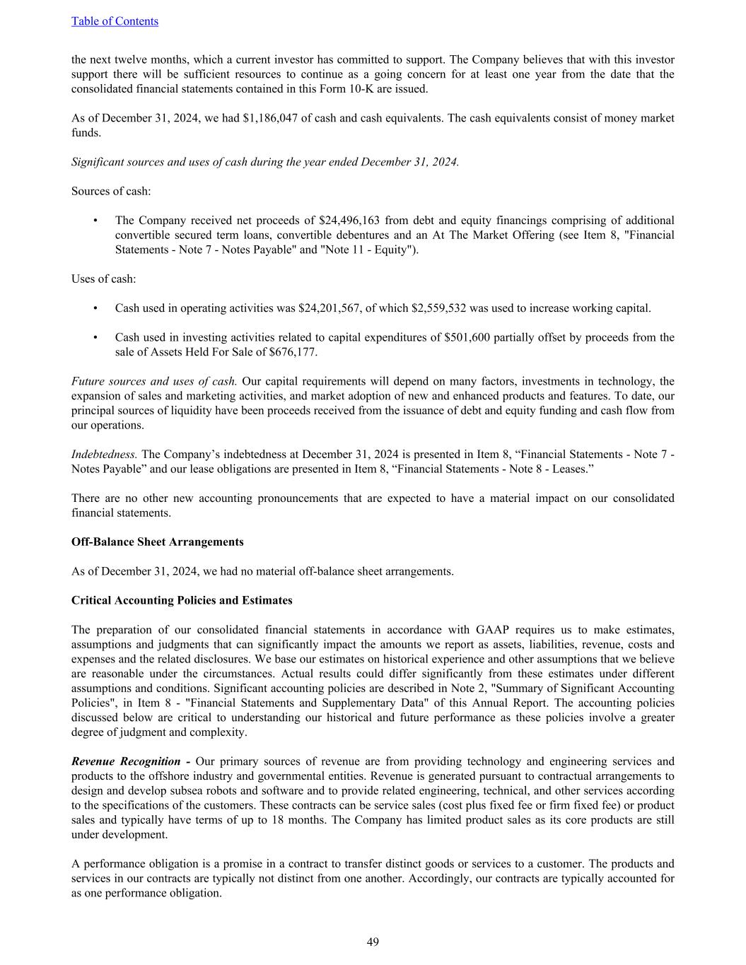 the next twelve months, which a current investor has committed to support. The Company believes that with this investor support there will be sufficient resources to continue as a going concern for at least one year from the date that the consolidated financial statements contained in this Form 10-K are issued. As of December 31, 2024, we had $1,186,047 of cash and cash equivalents. The cash equivalents consist of money market funds. Significant sources and uses of cash during the year ended December 31, 2024. Sources of cash: • The Company received net proceeds of $24,496,163 from debt and equity financings comprising of additional convertible secured term loans, convertible debentures and an At The Market Offering (see Item 8, "Financial Statements - Note 7 - Notes Payable" and "Note 11 - Equity"). Uses of cash: • Cash used in operating activities was $24,201,567, of which $2,559,532 was used to increase working capital. • Cash used in investing activities related to capital expenditures of $501,600 partially offset by proceeds from the sale of Assets Held For Sale of $676,177. Future sources and uses of cash. Our capital requirements will depend on many factors, investments in technology, the expansion of sales and marketing activities, and market adoption of new and enhanced products and features. To date, our principal sources of liquidity have been proceeds received from the issuance of debt and equity funding and cash flow from our operations. Indebtedness. The Company’s indebtedness at December 31, 2024 is presented in Item 8, “Financial Statements - Note 7 - Notes Payable” and our lease obligations are presented in Item 8, “Financial Statements - Note 8 - Leases.” There are no other new accounting pronouncements that are expected to have a material impact on our consolidated financial statements. Off-Balance Sheet Arrangements As of December 31, 2024, we had no material off-balance sheet arrangements. Critical Accounting Policies and Estimates The preparation of our consolidated financial statements in accordance with GAAP requires us to make estimates, assumptions and judgments that can significantly impact the amounts we report as assets, liabilities, revenue, costs and expenses and the related disclosures. We base our estimates on historical experience and other assumptions that we believe are reasonable under the circumstances. Actual results could differ significantly from these estimates under different assumptions and conditions. Significant accounting policies are described in Note 2, "Summary of Significant Accounting Policies", in Item 8 - "Financial Statements and Supplementary Data" of this Annual Report. The accounting policies discussed below are critical to understanding our historical and future performance as these policies involve a greater degree of judgment and complexity. Revenue Recognition - Our primary sources of revenue are from providing technology and engineering services and products to the offshore industry and governmental entities. Revenue is generated pursuant to contractual arrangements to design and develop subsea robots and software and to provide related engineering, technical, and other services according to the specifications of the customers. These contracts can be service sales (cost plus fixed fee or firm fixed fee) or product sales and typically have terms of up to 18 months. The Company has limited product sales as its core products are still under development. A performance obligation is a promise in a contract to transfer distinct goods or services to a customer. The products and services in our contracts are typically not distinct from one another. Accordingly, our contracts are typically accounted for as one performance obligation. Table of Contents 49