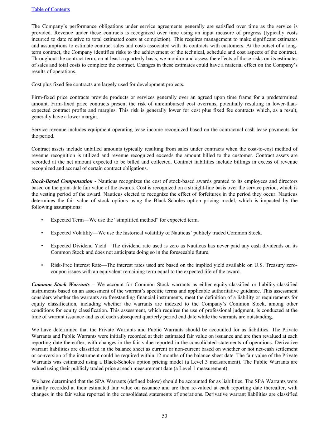 The Company’s performance obligations under service agreements generally are satisfied over time as the service is provided. Revenue under these contracts is recognized over time using an input measure of progress (typically costs incurred to date relative to total estimated costs at completion). This requires management to make significant estimates and assumptions to estimate contract sales and costs associated with its contracts with customers. At the outset of a long- term contract, the Company identifies risks to the achievement of the technical, schedule and cost aspects of the contract. Throughout the contract term, on at least a quarterly basis, we monitor and assess the effects of those risks on its estimates of sales and total costs to complete the contract. Changes in these estimates could have a material effect on the Company’s results of operations. Cost plus fixed fee contracts are largely used for development projects. Firm-fixed price contracts provide products or services generally over an agreed upon time frame for a predetermined amount. Firm-fixed price contracts present the risk of unreimbursed cost overruns, potentially resulting in lower-than- expected contract profits and margins. This risk is generally lower for cost plus fixed fee contracts which, as a result, generally have a lower margin. Service revenue includes equipment operating lease income recognized based on the contractual cash lease payments for the period. Contract assets include unbilled amounts typically resulting from sales under contracts when the cost-to-cost method of revenue recognition is utilized and revenue recognized exceeds the amount billed to the customer. Contract assets are recorded at the net amount expected to be billed and collected. Contract liabilities include billings in excess of revenue recognized and accrual of certain contract obligations. Stock-Based Compensation - Nauticus recognizes the cost of stock-based awards granted to its employees and directors based on the grant-date fair value of the awards. Cost is recognized on a straight-line basis over the service period, which is the vesting period of the award. Nauticus elected to recognize the effect of forfeitures in the period they occur. Nauticus determines the fair value of stock options using the Black-Scholes option pricing model, which is impacted by the following assumptions: • Expected Term—We use the “simplified method” for expected term. • Expected Volatility—We use the historical volatility of Nauticus’ publicly traded Common Stock. • Expected Dividend Yield—The dividend rate used is zero as Nauticus has never paid any cash dividends on its Common Stock and does not anticipate doing so in the foreseeable future. • Risk-Free Interest Rate—The interest rates used are based on the implied yield available on U.S. Treasury zero- coupon issues with an equivalent remaining term equal to the expected life of the award. Common Stock Warrants – We account for Common Stock warrants as either equity-classified or liability-classified instruments based on an assessment of the warrant’s specific terms and applicable authoritative guidance. This assessment considers whether the warrants are freestanding financial instruments, meet the definition of a liability or requirements for equity classification, including whether the warrants are indexed to the Company’s Common Stock, among other conditions for equity classification. This assessment, which requires the use of professional judgment, is conducted at the time of warrant issuance and as of each subsequent quarterly period end date while the warrants are outstanding. We have determined that the Private Warrants and Public Warrants should be accounted for as liabilities. The Private Warrants and Public Warrants were initially recorded at their estimated fair value on issuance and are then revalued at each reporting date thereafter, with changes in the fair value reported in the consolidated statements of operations. Derivative warrant liabilities are classified in the balance sheet as current or non-current based on whether or not net-cash settlement or conversion of the instrument could be required within 12 months of the balance sheet date. The fair value of the Private Warrants was estimated using a Black-Scholes option pricing model (a Level 3 measurement). The Public Warrants are valued using their publicly traded price at each measurement date (a Level 1 measurement). We have determined that the SPA Warrants (defined below) should be accounted for as liabilities. The SPA Warrants were initially recorded at their estimated fair value on issuance and are then re-valued at each reporting date thereafter, with changes in the fair value reported in the consolidated statements of operations. Derivative warrant liabilities are classified Table of Contents 50