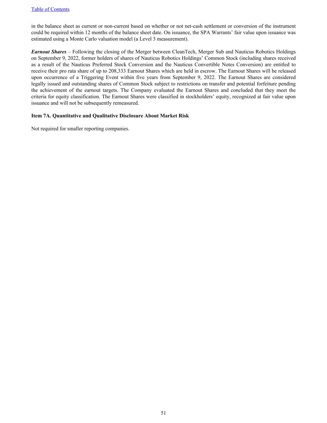 in the balance sheet as current or non-current based on whether or not net-cash settlement or conversion of the instrument could be required within 12 months of the balance sheet date. On issuance, the SPA Warrants’ fair value upon issuance was estimated using a Monte Carlo valuation model (a Level 3 measurement). Earnout Shares – Following the closing of the Merger between CleanTech, Merger Sub and Nauticus Robotics Holdings on September 9, 2022, former holders of shares of Nauticus Robotics Holdings’ Common Stock (including shares received as a result of the Nauticus Preferred Stock Conversion and the Nauticus Convertible Notes Conversion) are entitled to receive their pro rata share of up to 208,333 Earnout Shares which are held in escrow. The Earnout Shares will be released upon occurrence of a Triggering Event within five years from September 9, 2022. The Earnout Shares are considered legally issued and outstanding shares of Common Stock subject to restrictions on transfer and potential forfeiture pending the achievement of the earnout targets. The Company evaluated the Earnout Shares and concluded that they meet the criteria for equity classification. The Earnout Shares were classified in stockholders’ equity, recognized at fair value upon issuance and will not be subsequently remeasured. Item 7A. Quantitative and Qualitative Disclosure About Market Risk Not required for smaller reporting companies. Table of Contents 51