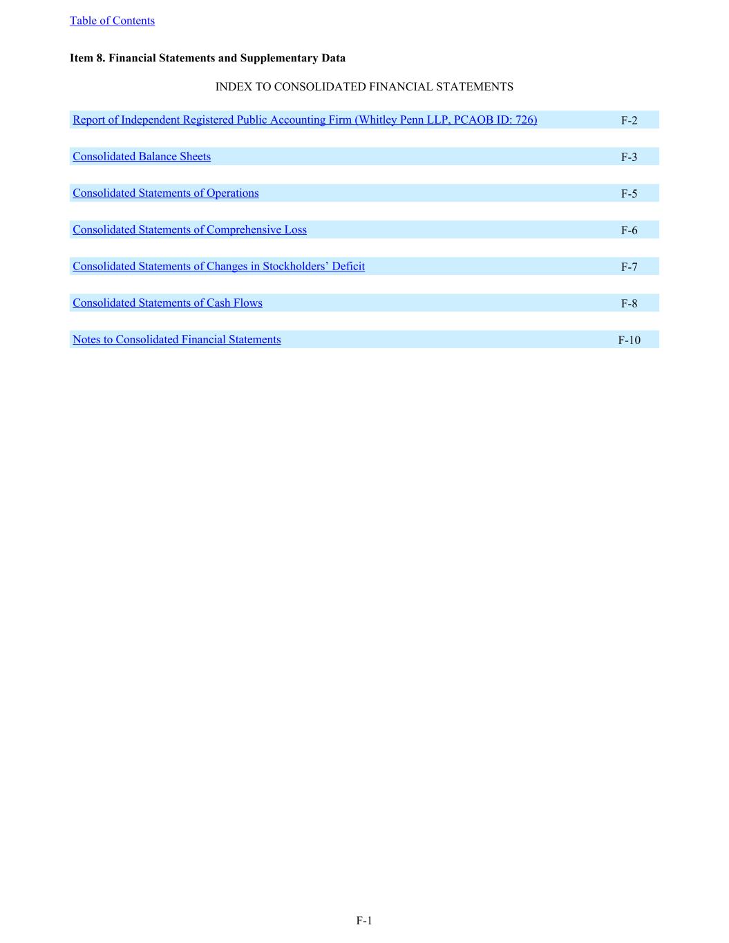 Item 8. Financial Statements and Supplementary Data INDEX TO CONSOLIDATED FINANCIAL STATEMENTS Report of Independent Registered Public Accounting Firm (Whitley Penn LLP, PCAOB ID: 726) F-2 Consolidated Balance Sheets F-3 Consolidated Statements of Operations F-5 Consolidated Statements of Comprehensive Loss F-6 Consolidated Statements of Changes in Stockholders’ Deficit F-7 Consolidated Statements of Cash Flows F-8 Notes to Consolidated Financial Statements F-10 Table of Contents F-1