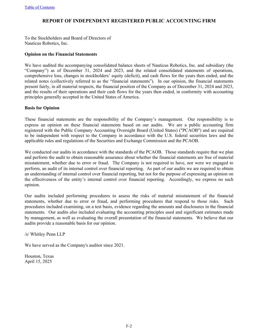 REPORT OF INDEPENDENT REGISTERED PUBLIC ACCOUNTING FIRM To the Stockholders and Board of Directors of Nauticus Robotics, Inc. Opinion on the Financial Statements We have audited the accompanying consolidated balance sheets of Nauticus Robotics, Inc. and subsidiary (the “Company”) as of December 31, 2024 and 2023, and the related consolidated statements of operations, comprehensive loss, changes in stockholders’ equity (deficit), and cash flows for the years then ended, and the related notes (collectively referred to as the “financial statements”). In our opinion, the financial statements present fairly, in all material respects, the financial position of the Company as of December 31, 2024 and 2023, and the results of their operations and their cash flows for the years then ended, in conformity with accounting principles generally accepted in the United States of America. Basis for Opinion These financial statements are the responsibility of the Company’s management. Our responsibility is to express an opinion on these financial statements based on our audits. We are a public accounting firm registered with the Public Company Accounting Oversight Board (United States) ("PCAOB") and are required to be independent with respect to the Company in accordance with the U.S. federal securities laws and the applicable rules and regulations of the Securities and Exchange Commission and the PCAOB. We conducted our audits in accordance with the standards of the PCAOB. Those standards require that we plan and perform the audit to obtain reasonable assurance about whether the financial statements are free of material misstatement, whether due to error or fraud. The Company is not required to have, nor were we engaged to perform, an audit of its internal control over financial reporting. As part of our audits we are required to obtain an understanding of internal control over financial reporting, but not for the purpose of expressing an opinion on the effectiveness of the entity’s internal control over financial reporting. Accordingly, we express no such opinion. Our audits included performing procedures to assess the risks of material misstatement of the financial statements, whether due to error or fraud, and performing procedures that respond to those risks. Such procedures included examining, on a test basis, evidence regarding the amounts and disclosures in the financial statements. Our audits also included evaluating the accounting principles used and significant estimates made by management, as well as evaluating the overall presentation of the financial statements. We believe that our audits provide a reasonable basis for our opinion. /s/ Whitley Penn LLP We have served as the Company's auditor since 2021. Houston, Texas April 15, 2025 Table of Contents F-2