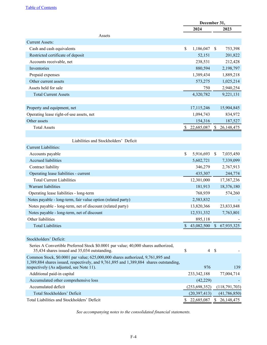 December 31, 2024 2023 Assets Current Assets: Cash and cash equivalents $ 1,186,047 $ 753,398 Restricted certificate of deposit 52,151 201,822 Accounts receivable, net 238,531 212,428 Inventories 880,594 2,198,797 Prepaid expenses 1,389,434 1,889,218 Other current assets 573,275 1,025,214 Assets held for sale 750 2,940,254 Total Current Assets 4,320,782 9,221,131 Property and equipment, net 17,115,246 15,904,845 Operating lease right-of-use assets, net 1,094,743 834,972 Other assets 154,316 187,527 Total Assets $ 22,685,087 $ 26,148,475 Liabilities and Stockholders’ Deficit Current Liabilities: Accounts payable $ 5,916,693 $ 7,035,450 Accrued liabilities 5,602,721 7,339,099 Contract liability 346,279 2,767,913 Operating lease liabilities - current 435,307 244,774 Total Current Liabilities 12,301,000 17,387,236 Warrant liabilities 181,913 18,376,180 Operating lease liabilities - long-term 768,939 574,260 Notes payable - long-term, fair value option (related party) 2,583,832 - Notes payable - long-term, net of discount (related party) 13,820,366 23,833,848 Notes payable - long-term, net of discount 12,531,332 7,763,801 Other liabilities 895,118 - Total Liabilities $ 43,082,500 $ 67,935,325 Stockholders’ Deficit: Series A Convertible Preferred Stock $0.0001 par value; 40,000 shares authorized, 35,434 shares issued and 35,034 outstanding. $ 4 $ - Common Stock, $0.0001 par value; 625,000,000 shares authorized, 9,761,895 and 1,389,884 shares issued, respectively, and 9,761,895 and 1,389,884 shares outstanding, respectively (As adjusted, see Note 11). 976 139 Additional paid-in capital 233,342,188 77,004,714 Accumulated other comprehensive loss (42,229) - Accumulated deficit (253,698,352) (118,791,703) Total Stockholders’ Deficit (20,397,413) (41,786,850) Total Liabilities and Stockholders’ Deficit $ 22,685,087 $ 26,148,475 See accompanying notes to the consolidated financial statements. Table of Contents F-4