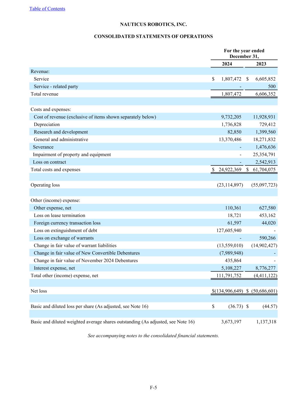 NAUTICUS ROBOTICS, INC. CONSOLIDATED STATEMENTS OF OPERATIONS For the year ended December 31, 2024 2023 Revenue: Service $ 1,807,472 $ 6,605,852 Service - related party - 500 Total revenue 1,807,472 6,606,352 Costs and expenses: Cost of revenue (exclusive of items shown separately below) 9,732,205 11,928,931 Depreciation 1,736,828 729,412 Research and development 82,850 1,399,560 General and administrative 13,370,486 18,271,832 Severance - 1,476,636 Impairment of property and equipment - 25,354,791 Loss on contract - 2,542,913 Total costs and expenses $ 24,922,369 $ 61,704,075 Operating loss (23,114,897) (55,097,723) Other (income) expense: Other expense, net 110,361 627,580 Loss on lease termination 18,721 453,162 Foreign currency transaction loss 61,597 44,020 Loss on extinguishment of debt 127,605,940 - Loss on exchange of warrants - 590,266 Change in fair value of warrant liabilities (13,559,010) (14,902,427) Change in fair value of New Convertible Debentures (7,989,948) - Change in fair value of November 2024 Debentures 435,864 - Interest expense, net 5,108,227 8,776,277 Total other (income) expense, net 111,791,752 (4,411,122) Net loss $ (134,906,649) $ (50,686,601) Basic and diluted loss per share (As adjusted, see Note 16) $ (36.73) $ (44.57) Basic and diluted weighted average shares outstanding (As adjusted, see Note 16) 3,673,197 1,137,318 See accompanying notes to the consolidated financial statements. Table of Contents F-5