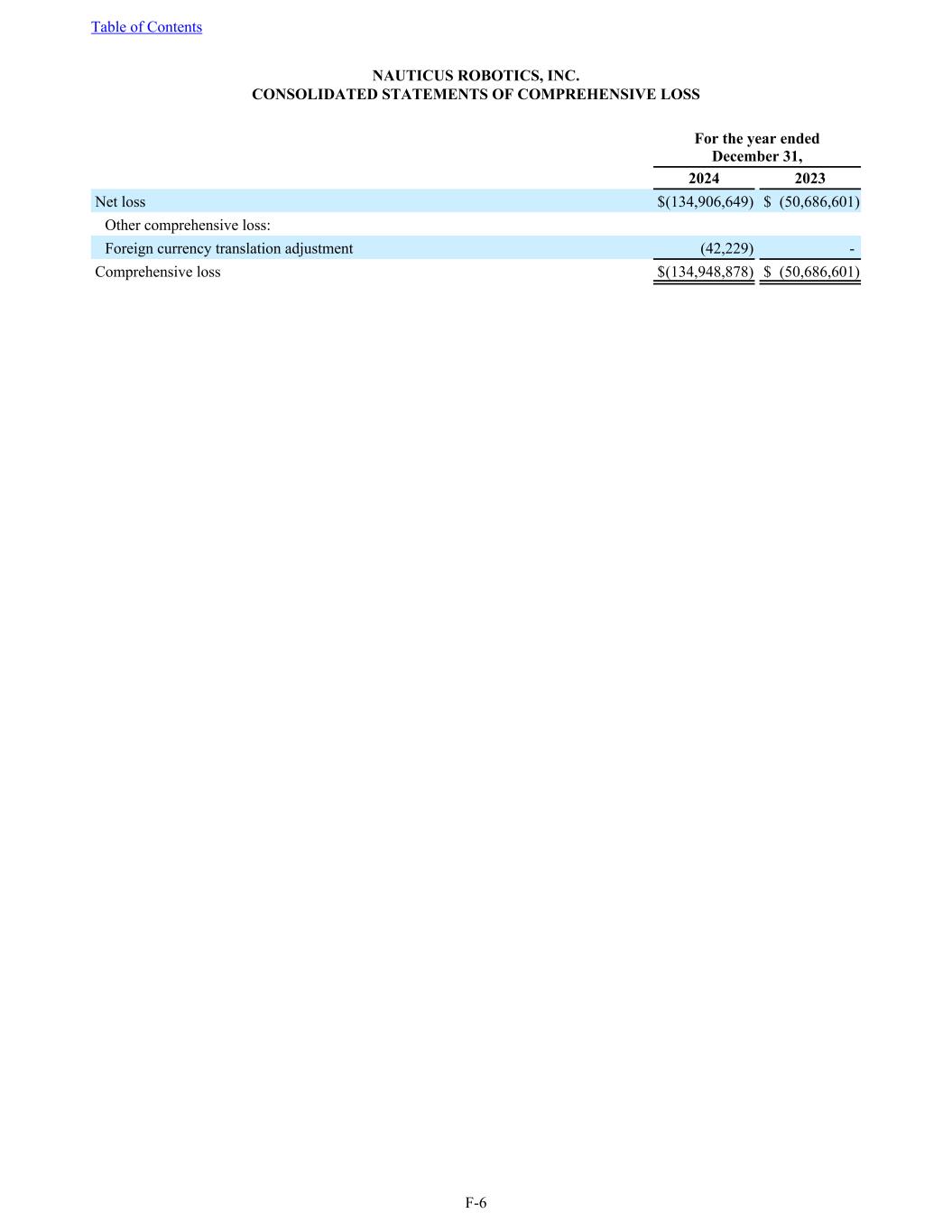 NAUTICUS ROBOTICS, INC. CONSOLIDATED STATEMENTS OF COMPREHENSIVE LOSS For the year ended December 31, 2024 2023 Net loss $ (134,906,649) $ (50,686,601) Other comprehensive loss: Foreign currency translation adjustment (42,229) - Comprehensive loss $ (134,948,878) $ (50,686,601) Table of Contents F-6