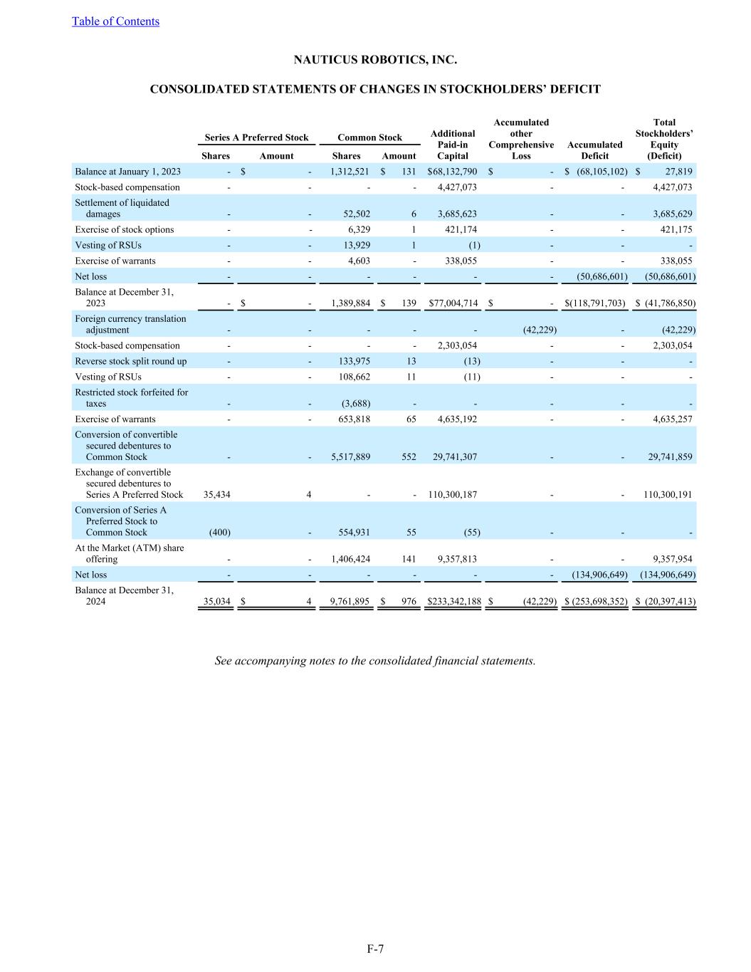 NAUTICUS ROBOTICS, INC. CONSOLIDATED STATEMENTS OF CHANGES IN STOCKHOLDERS’ DEFICIT Series A Preferred Stock Common Stock Additional Paid-in Capital Accumulated other Comprehensive Loss Accumulated Deficit Total Stockholders’ Equity (Deficit) Shares Amount Shares Amount Balance at January 1, 2023 - $ - 1,312,521 $ 131 $ 68,132,790 $ - $ (68,105,102) $ 27,819 Stock-based compensation - - - - 4,427,073 - - 4,427,073 Settlement of liquidated damages - - 52,502 6 3,685,623 - - 3,685,629 Exercise of stock options - - 6,329 1 421,174 - - 421,175 Vesting of RSUs - - 13,929 1 (1) - - - Exercise of warrants - - 4,603 - 338,055 - - 338,055 Net loss - - - - - - (50,686,601) (50,686,601) Balance at December 31, 2023 - $ - 1,389,884 $ 139 $77,004,714 $ - $(118,791,703) $ (41,786,850) Foreign currency translation adjustment - - - - - (42,229) - (42,229) Stock-based compensation - - - - 2,303,054 - - 2,303,054 Reverse stock split round up - - 133,975 13 (13) - - - Vesting of RSUs - - 108,662 11 (11) - - - Restricted stock forfeited for taxes - - (3,688) - - - - - Exercise of warrants - - 653,818 65 4,635,192 - - 4,635,257 Conversion of convertible secured debentures to Common Stock - - 5,517,889 552 29,741,307 - - 29,741,859 Exchange of convertible secured debentures to Series A Preferred Stock 35,434 4 - - 110,300,187 - - 110,300,191 Conversion of Series A Preferred Stock to Common Stock (400) - 554,931 55 (55) - - - At the Market (ATM) share offering - - 1,406,424 141 9,357,813 - - 9,357,954 Net loss - - - - - - (134,906,649) (134,906,649) Balance at December 31, 2024 35,034 $ 4 9,761,895 $ 976 $ 233,342,188 $ (42,229) $ (253,698,352) $ (20,397,413) See accompanying notes to the consolidated financial statements. Table of Contents F-7