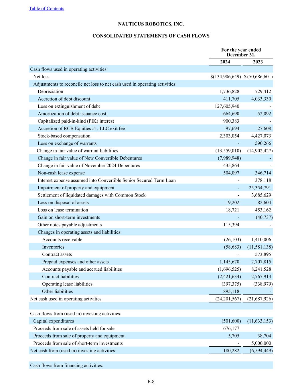 NAUTICUS ROBOTICS, INC. CONSOLIDATED STATEMENTS OF CASH FLOWS For the year ended December 31, 2024 2023 Cash flows used in operating activities: Net loss $ (134,906,649) $ (50,686,601) Adjustments to reconcile net loss to net cash used in operating activities: Depreciation 1,736,828 729,412 Accretion of debt discount 411,705 4,033,330 Loss on extinguishment of debt 127,605,940 - Amortization of debt issuance cost 664,690 52,092 Capitalized paid-in-kind (PIK) interest 900,383 - Accretion of RCB Equities #1, LLC exit fee 97,694 27,608 Stock-based compensation 2,303,054 4,427,073 Loss on exchange of warrants - 590,266 Change in fair value of warrant liabilities (13,559,010) (14,902,427) Change in fair value of New Convertible Debentures (7,989,948) - Change in fair value of November 2024 Debentures 435,864 - Non-cash lease expense 504,097 346,714 Interest expense assumed into Convertible Senior Secured Term Loan - 378,118 Impairment of property and equipment - 25,354,791 Settlement of liquidated damages with Common Stock - 3,685,629 Loss on disposal of assets 19,202 82,604 Loss on lease termination 18,721 453,162 Gain on short-term investments - (40,737) Other notes payable adjustments 115,394 - Changes in operating assets and liabilities: Accounts receivable (26,103) 1,410,006 Inventories (58,683) (11,581,138) Contract assets - 573,895 Prepaid expenses and other assets 1,145,670 2,707,815 Accounts payable and accrued liabilities (1,696,525) 8,241,528 Contract liabilities (2,421,634) 2,767,913 Operating lease liabilities (397,375) (338,979) Other liabilities 895,118 - Net cash used in operating activities (24,201,567) (21,687,926) Cash flows from (used in) investing activities: Capital expenditures (501,600) (11,633,153) Proceeds from sale of assets held for sale 676,177 - Proceeds from sale of property and equipment 5,705 38,704 Proceeds from sale of short-term investments - 5,000,000 Net cash from (used in) investing activities 180,282 (6,594,449) Cash flows from financing activities: Table of Contents F-8