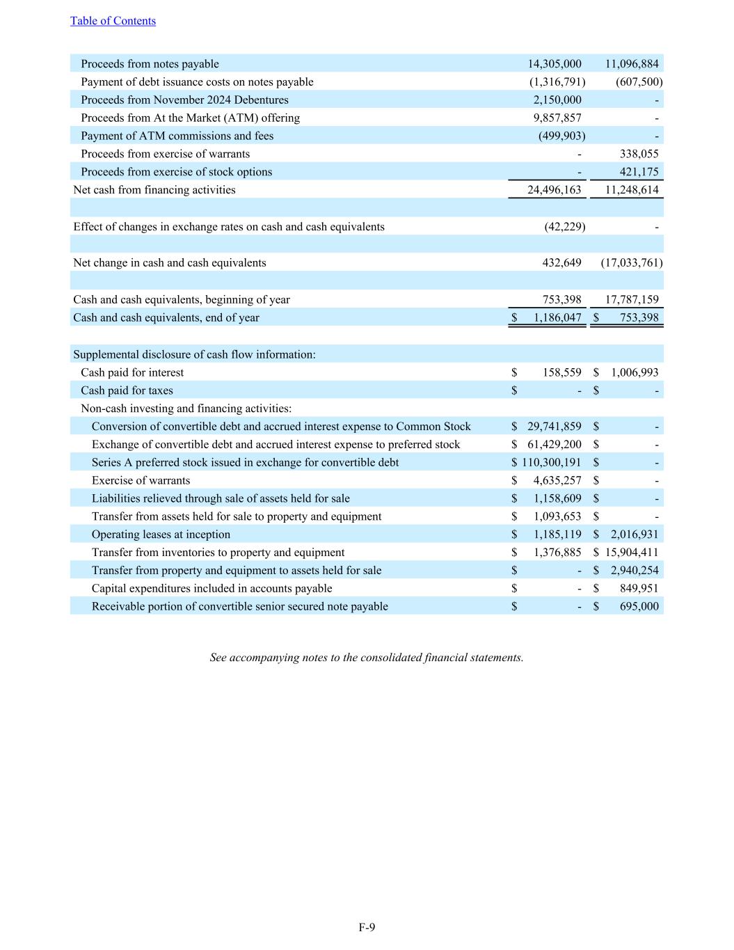 Proceeds from notes payable 14,305,000 11,096,884 Payment of debt issuance costs on notes payable (1,316,791) (607,500) Proceeds from November 2024 Debentures 2,150,000 - Proceeds from At the Market (ATM) offering 9,857,857 - Payment of ATM commissions and fees (499,903) - Proceeds from exercise of warrants - 338,055 Proceeds from exercise of stock options - 421,175 Net cash from financing activities 24,496,163 11,248,614 Effect of changes in exchange rates on cash and cash equivalents (42,229) - Net change in cash and cash equivalents 432,649 (17,033,761) Cash and cash equivalents, beginning of year 753,398 17,787,159 Cash and cash equivalents, end of year $ 1,186,047 $ 753,398 Supplemental disclosure of cash flow information: Cash paid for interest $ 158,559 $ 1,006,993 Cash paid for taxes $ - $ - Non-cash investing and financing activities: Conversion of convertible debt and accrued interest expense to Common Stock $ 29,741,859 $ - Exchange of convertible debt and accrued interest expense to preferred stock $ 61,429,200 $ - Series A preferred stock issued in exchange for convertible debt $ 110,300,191 $ - Exercise of warrants $ 4,635,257 $ - Liabilities relieved through sale of assets held for sale $ 1,158,609 $ - Transfer from assets held for sale to property and equipment $ 1,093,653 $ - Operating leases at inception $ 1,185,119 $ 2,016,931 Transfer from inventories to property and equipment $ 1,376,885 $ 15,904,411 Transfer from property and equipment to assets held for sale $ - $ 2,940,254 Capital expenditures included in accounts payable $ - $ 849,951 Receivable portion of convertible senior secured note payable $ - $ 695,000 See accompanying notes to the consolidated financial statements. Table of Contents F-9