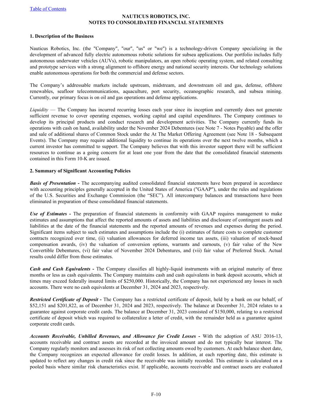 1. Description of the Business Nauticus Robotics, Inc. (the "Company", "our", "us" or "we") is a technology-driven Company specializing in the development of advanced fully electric autonomous robotic solutions for subsea applications. Our portfolio includes fully autonomous underwater vehicles (AUVs), robotic manipulators, an open robotic operating system, and related consulting and prototype services with a strong alignment to offshore energy and national security interests. Our technology solutions enable autonomous operations for both the commercial and defense sectors. The Company’s addressable markets include upstream, midstream, and downstream oil and gas, defense, offshore renewables, seafloor telecommunications, aquaculture, port security, oceanographic research, and subsea mining. Currently, our primary focus is on oil and gas operations and defense applications. Liquidity — The Company has incurred recurring losses each year since its inception and currently does not generate sufficient revenue to cover operating expenses, working capital and capital expenditures. The Company continues to develop its principal products and conduct research and development activities. The Company currently funds its operations with cash on hand, availability under the November 2024 Debentures (see Note 7 - Notes Payable) and the offer and sale of additional shares of Common Stock under the At The Market Offering Agreement (see Note 18 - Subsequent Events). The Company may require additional liquidity to continue its operations over the next twelve months, which a current investor has committed to support. The Company believes that with this investor support there will be sufficient resources to continue as a going concern for at least one year from the date that the consolidated financial statements contained in this Form 10-K are issued. 2. Summary of Significant Accounting Policies Basis of Presentation - The accompanying audited consolidated financial statements have been prepared in accordance with accounting principles generally accepted in the United States of America ("GAAP"), under the rules and regulations of the U.S. Securities and Exchange Commission (the “SEC”). All intercompany balances and transactions have been eliminated in preparation of these consolidated financial statements. Use of Estimates - The preparation of financial statements in conformity with GAAP requires management to make estimates and assumptions that affect the reported amounts of assets and liabilities and disclosure of contingent assets and liabilities at the date of the financial statements and the reported amounts of revenues and expenses during the period. Significant items subject to such estimates and assumptions include the (i) estimates of future costs to complete customer contracts recognized over time, (ii) valuation allowances for deferred income tax assets, (iii) valuation of stock-based compensation awards, (iv) the valuation of conversion options, warrants and earnouts, (v) fair value of the New Convertible Debentures, (vi) fair value of November 2024 Debentures, and (vii) fair value of Preferred Stock. Actual results could differ from those estimates. Cash and Cash Equivalents - The Company classifies all highly-liquid instruments with an original maturity of three months or less as cash equivalents. The Company maintains cash and cash equivalents in bank deposit accounts, which at times may exceed federally insured limits of $250,000. Historically, the Company has not experienced any losses in such accounts. There were no cash equivalents at December 31, 2024 and 2023, respectively. Restricted Certificate of Deposit - The Company has a restricted certificate of deposit, held by a bank on our behalf, of $52,151 and $201,822, as of December 31, 2024 and 2023, respectively. The balance at December 31, 2024 relates to a guarantee against corporate credit cards. The balance at December 31, 2023 consisted of $150,000, relating to a restricted certificate of deposit which was required to collateralize a letter of credit, with the remainder held as a guarantee against corporate credit cards. Accounts Receivable, Unbilled Revenues, and Allowance for Credit Losses - With the adoption of ASU 2016-13, accounts receivable and contract assets are recorded at the invoiced amount and do not typically bear interest. The Company regularly monitors and assesses its risk of not collecting amounts owed by customers. At each balance sheet date, the Company recognizes an expected allowance for credit losses. In addition, at each reporting date, this estimate is updated to reflect any changes in credit risk since the receivable was initially recorded. This estimate is calculated on a pooled basis where similar risk characteristics exist. If applicable, accounts receivable and contract assets are evaluated Table of Contents NAUTICUS ROBOTICS, INC. NOTES TO CONSOLIDATED FINANCIAL STATEMENTS F-10