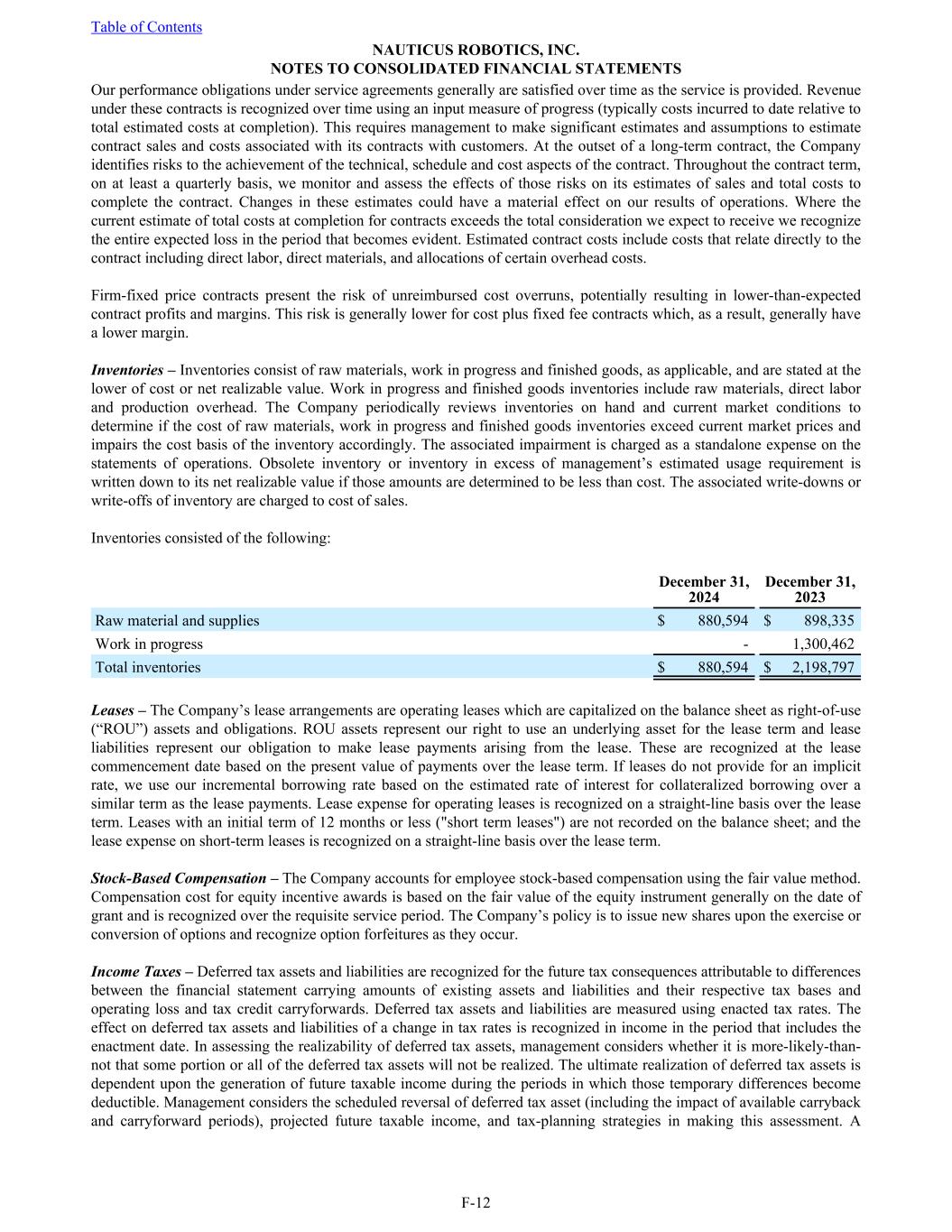 Our performance obligations under service agreements generally are satisfied over time as the service is provided. Revenue under these contracts is recognized over time using an input measure of progress (typically costs incurred to date relative to total estimated costs at completion). This requires management to make significant estimates and assumptions to estimate contract sales and costs associated with its contracts with customers. At the outset of a long-term contract, the Company identifies risks to the achievement of the technical, schedule and cost aspects of the contract. Throughout the contract term, on at least a quarterly basis, we monitor and assess the effects of those risks on its estimates of sales and total costs to complete the contract. Changes in these estimates could have a material effect on our results of operations. Where the current estimate of total costs at completion for contracts exceeds the total consideration we expect to receive we recognize the entire expected loss in the period that becomes evident. Estimated contract costs include costs that relate directly to the contract including direct labor, direct materials, and allocations of certain overhead costs. Firm-fixed price contracts present the risk of unreimbursed cost overruns, potentially resulting in lower-than-expected contract profits and margins. This risk is generally lower for cost plus fixed fee contracts which, as a result, generally have a lower margin. Inventories – Inventories consist of raw materials, work in progress and finished goods, as applicable, and are stated at the lower of cost or net realizable value. Work in progress and finished goods inventories include raw materials, direct labor and production overhead. The Company periodically reviews inventories on hand and current market conditions to determine if the cost of raw materials, work in progress and finished goods inventories exceed current market prices and impairs the cost basis of the inventory accordingly. The associated impairment is charged as a standalone expense on the statements of operations. Obsolete inventory or inventory in excess of management’s estimated usage requirement is written down to its net realizable value if those amounts are determined to be less than cost. The associated write-downs or write-offs of inventory are charged to cost of sales. Inventories consisted of the following: December 31, 2024 December 31, 2023 Raw material and supplies $ 880,594 $ 898,335 Work in progress - 1,300,462 Total inventories $ 880,594 $ 2,198,797 Leases – The Company’s lease arrangements are operating leases which are capitalized on the balance sheet as right-of-use (“ROU”) assets and obligations. ROU assets represent our right to use an underlying asset for the lease term and lease liabilities represent our obligation to make lease payments arising from the lease. These are recognized at the lease commencement date based on the present value of payments over the lease term. If leases do not provide for an implicit rate, we use our incremental borrowing rate based on the estimated rate of interest for collateralized borrowing over a similar term as the lease payments. Lease expense for operating leases is recognized on a straight-line basis over the lease term. Leases with an initial term of 12 months or less ("short term leases") are not recorded on the balance sheet; and the lease expense on short-term leases is recognized on a straight-line basis over the lease term. Stock-Based Compensation – The Company accounts for employee stock-based compensation using the fair value method. Compensation cost for equity incentive awards is based on the fair value of the equity instrument generally on the date of grant and is recognized over the requisite service period. The Company’s policy is to issue new shares upon the exercise or conversion of options and recognize option forfeitures as they occur. Income Taxes – Deferred tax assets and liabilities are recognized for the future tax consequences attributable to differences between the financial statement carrying amounts of existing assets and liabilities and their respective tax bases and operating loss and tax credit carryforwards. Deferred tax assets and liabilities are measured using enacted tax rates. The effect on deferred tax assets and liabilities of a change in tax rates is recognized in income in the period that includes the enactment date. In assessing the realizability of deferred tax assets, management considers whether it is more-likely-than- not that some portion or all of the deferred tax assets will not be realized. The ultimate realization of deferred tax assets is dependent upon the generation of future taxable income during the periods in which those temporary differences become deductible. Management considers the scheduled reversal of deferred tax asset (including the impact of available carryback and carryforward periods), projected future taxable income, and tax-planning strategies in making this assessment. A Table of Contents NAUTICUS ROBOTICS, INC. NOTES TO CONSOLIDATED FINANCIAL STATEMENTS F-12