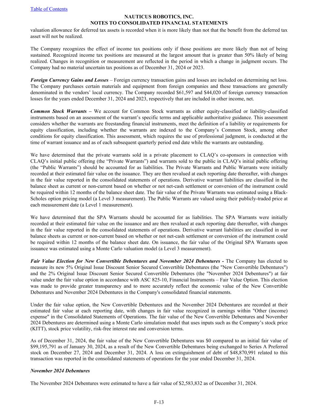 valuation allowance for deferred tax assets is recorded when it is more likely than not that the benefit from the deferred tax asset will not be realized. The Company recognizes the effect of income tax positions only if those positions are more likely than not of being sustained. Recognized income tax positions are measured at the largest amount that is greater than 50% likely of being realized. Changes in recognition or measurement are reflected in the period in which a change in judgment occurs. The Company had no material uncertain tax positions as of December 31, 2024 or 2023. Foreign Currency Gains and Losses – Foreign currency transaction gains and losses are included on determining net loss. The Company purchases certain materials and equipment from foreign companies and these transactions are generally denominated in the vendors’ local currency. The Company recorded $61,597 and $44,020 of foreign currency transaction losses for the years ended December 31, 2024 and 2023, respectively that are included in other income, net. Common Stock Warrants – We account for Common Stock warrants as either equity-classified or liability-classified instruments based on an assessment of the warrant’s specific terms and applicable authoritative guidance. This assessment considers whether the warrants are freestanding financial instruments, meet the definition of a liability or requirements for equity classification, including whether the warrants are indexed to the Company’s Common Stock, among other conditions for equity classification. This assessment, which requires the use of professional judgment, is conducted at the time of warrant issuance and as of each subsequent quarterly period end date while the warrants are outstanding. We have determined that the private warrants sold in a private placement to CLAQ’s co-sponsors in connection with CLAQ’s initial public offering (the “Private Warrants”) and warrants sold to the public in CLAQ’s initial public offering (the “Public Warrants”) should be accounted for as liabilities. The Private Warrants and Public Warrants were initially recorded at their estimated fair value on the issuance. They are then revalued at each reporting date thereafter, with changes in the fair value reported in the consolidated statements of operations. Derivative warrant liabilities are classified in the balance sheet as current or non-current based on whether or not net-cash settlement or conversion of the instrument could be required within 12 months of the balance sheet date. The fair value of the Private Warrants was estimated using a Black- Scholes option pricing model (a Level 3 measurement). The Public Warrants are valued using their publicly-traded price at each measurement date (a Level 1 measurement). We have determined that the SPA Warrants should be accounted for as liabilities. The SPA Warrants were initially recorded at their estimated fair value on the issuance and are then revalued at each reporting date thereafter, with changes in the fair value reported in the consolidated statements of operations. Derivative warrant liabilities are classified in our balance sheets as current or non-current based on whether or not net-cash settlement or conversion of the instrument could be required within 12 months of the balance sheet date. On issuance, the fair value of the Original SPA Warrants upon issuance was estimated using a Monte Carlo valuation model (a Level 3 measurement). Fair Value Election for New Convertible Debentures and November 2024 Debentures - The Company has elected to measure its new 5% Original Issue Discount Senior Secured Convertible Debentures (the "New Convertible Debentures") and the 2% Original Issue Discount Senior Secured Convertible Debentures (the "November 2024 Debentures") at fair value under the fair value option in accordance with ASC 825-10, Financial Instruments – Fair Value Option. This election was made to provide greater transparency and to more accurately reflect the economic value of the New Convertible Debentures and November 2024 Debentures in the Company's consolidated financial statements. Under the fair value option, the New Convertible Debentures and the November 2024 Debentures are recorded at their estimated fair value at each reporting date, with changes in fair value recognized in earnings within "Other (income) expense" in the Consolidated Statements of Operations. The fair value of the New Convertible Debentures and November 2024 Debentures are determined using a Monte Carlo simulation model that uses inputs such as the Company’s stock price (KITT), stock price volatility, risk-free interest rate and conversion terms. As of December 31, 2024, the fair value of the New Convertible Debentures was $0 compared to an initial fair value of $99,195,791 as of January 30, 2024, as a result of the New Convertible Debentures being exchanged to Series A Preferred stock on December 27, 2024 and December 31, 2024. A loss on extinguishment of debt of $48,870,991 related to this transaction was reported in the consolidated statements of operations for the year ended December 31, 2024. November 2024 Debentures The November 2024 Debentures were estimated to have a fair value of $2,583,832 as of December 31, 2024. Table of Contents NAUTICUS ROBOTICS, INC. NOTES TO CONSOLIDATED FINANCIAL STATEMENTS F-13