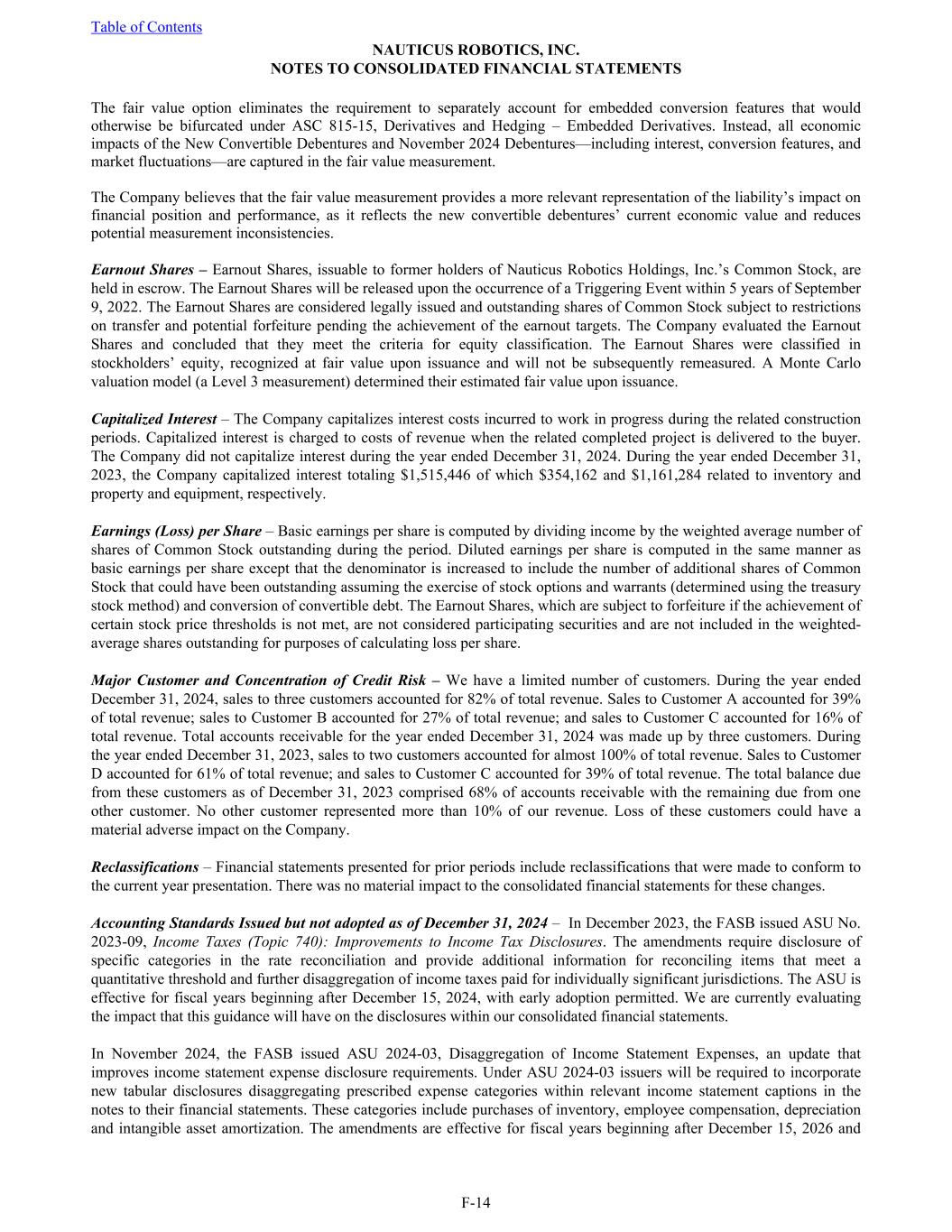The fair value option eliminates the requirement to separately account for embedded conversion features that would otherwise be bifurcated under ASC 815-15, Derivatives and Hedging – Embedded Derivatives. Instead, all economic impacts of the New Convertible Debentures and November 2024 Debentures—including interest, conversion features, and market fluctuations—are captured in the fair value measurement. The Company believes that the fair value measurement provides a more relevant representation of the liability’s impact on financial position and performance, as it reflects the new convertible debentures’ current economic value and reduces potential measurement inconsistencies. Earnout Shares – Earnout Shares, issuable to former holders of Nauticus Robotics Holdings, Inc.’s Common Stock, are held in escrow. The Earnout Shares will be released upon the occurrence of a Triggering Event within 5 years of September 9, 2022. The Earnout Shares are considered legally issued and outstanding shares of Common Stock subject to restrictions on transfer and potential forfeiture pending the achievement of the earnout targets. The Company evaluated the Earnout Shares and concluded that they meet the criteria for equity classification. The Earnout Shares were classified in stockholders’ equity, recognized at fair value upon issuance and will not be subsequently remeasured. A Monte Carlo valuation model (a Level 3 measurement) determined their estimated fair value upon issuance. Capitalized Interest – The Company capitalizes interest costs incurred to work in progress during the related construction periods. Capitalized interest is charged to costs of revenue when the related completed project is delivered to the buyer. The Company did not capitalize interest during the year ended December 31, 2024. During the year ended December 31, 2023, the Company capitalized interest totaling $1,515,446 of which $354,162 and $1,161,284 related to inventory and property and equipment, respectively. Earnings (Loss) per Share – Basic earnings per share is computed by dividing income by the weighted average number of shares of Common Stock outstanding during the period. Diluted earnings per share is computed in the same manner as basic earnings per share except that the denominator is increased to include the number of additional shares of Common Stock that could have been outstanding assuming the exercise of stock options and warrants (determined using the treasury stock method) and conversion of convertible debt. The Earnout Shares, which are subject to forfeiture if the achievement of certain stock price thresholds is not met, are not considered participating securities and are not included in the weighted- average shares outstanding for purposes of calculating loss per share. Major Customer and Concentration of Credit Risk – We have a limited number of customers. During the year ended December 31, 2024, sales to three customers accounted for 82% of total revenue. Sales to Customer A accounted for 39% of total revenue; sales to Customer B accounted for 27% of total revenue; and sales to Customer C accounted for 16% of total revenue. Total accounts receivable for the year ended December 31, 2024 was made up by three customers. During the year ended December 31, 2023, sales to two customers accounted for almost 100% of total revenue. Sales to Customer D accounted for 61% of total revenue; and sales to Customer C accounted for 39% of total revenue. The total balance due from these customers as of December 31, 2023 comprised 68% of accounts receivable with the remaining due from one other customer. No other customer represented more than 10% of our revenue. Loss of these customers could have a material adverse impact on the Company. Reclassifications – Financial statements presented for prior periods include reclassifications that were made to conform to the current year presentation. There was no material impact to the consolidated financial statements for these changes. Accounting Standards Issued but not adopted as of December 31, 2024 – In December 2023, the FASB issued ASU No. 2023-09, Income Taxes (Topic 740): Improvements to Income Tax Disclosures. The amendments require disclosure of specific categories in the rate reconciliation and provide additional information for reconciling items that meet a quantitative threshold and further disaggregation of income taxes paid for individually significant jurisdictions. The ASU is effective for fiscal years beginning after December 15, 2024, with early adoption permitted. We are currently evaluating the impact that this guidance will have on the disclosures within our consolidated financial statements. In November 2024, the FASB issued ASU 2024-03, Disaggregation of Income Statement Expenses, an update that improves income statement expense disclosure requirements. Under ASU 2024-03 issuers will be required to incorporate new tabular disclosures disaggregating prescribed expense categories within relevant income statement captions in the notes to their financial statements. These categories include purchases of inventory, employee compensation, depreciation and intangible asset amortization. The amendments are effective for fiscal years beginning after December 15, 2026 and Table of Contents NAUTICUS ROBOTICS, INC. NOTES TO CONSOLIDATED FINANCIAL STATEMENTS F-14