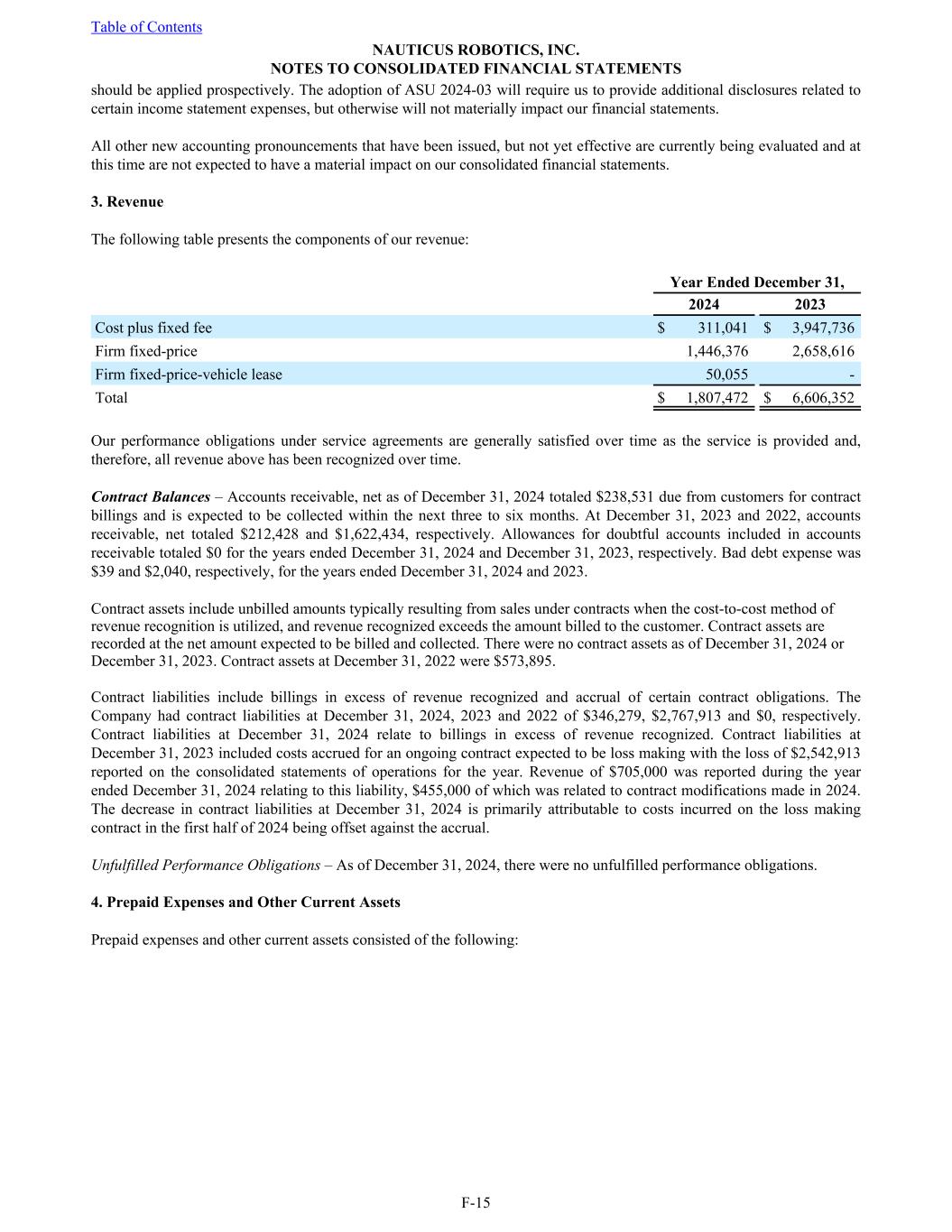 should be applied prospectively. The adoption of ASU 2024-03 will require us to provide additional disclosures related to certain income statement expenses, but otherwise will not materially impact our financial statements. All other new accounting pronouncements that have been issued, but not yet effective are currently being evaluated and at this time are not expected to have a material impact on our consolidated financial statements. 3. Revenue The following table presents the components of our revenue: Year Ended December 31, 2024 2023 Cost plus fixed fee $ 311,041 $ 3,947,736 Firm fixed-price 1,446,376 2,658,616 Firm fixed-price-vehicle lease 50,055 - Total $ 1,807,472 $ 6,606,352 Our performance obligations under service agreements are generally satisfied over time as the service is provided and, therefore, all revenue above has been recognized over time. Contract Balances – Accounts receivable, net as of December 31, 2024 totaled $238,531 due from customers for contract billings and is expected to be collected within the next three to six months. At December 31, 2023 and 2022, accounts receivable, net totaled $212,428 and $1,622,434, respectively. Allowances for doubtful accounts included in accounts receivable totaled $0 for the years ended December 31, 2024 and December 31, 2023, respectively. Bad debt expense was $39 and $2,040, respectively, for the years ended December 31, 2024 and 2023. Contract assets include unbilled amounts typically resulting from sales under contracts when the cost-to-cost method of revenue recognition is utilized, and revenue recognized exceeds the amount billed to the customer. Contract assets are recorded at the net amount expected to be billed and collected. There were no contract assets as of December 31, 2024 or December 31, 2023. Contract assets at December 31, 2022 were $573,895. Contract liabilities include billings in excess of revenue recognized and accrual of certain contract obligations. The Company had contract liabilities at December 31, 2024, 2023 and 2022 of $346,279, $2,767,913 and $0, respectively. Contract liabilities at December 31, 2024 relate to billings in excess of revenue recognized. Contract liabilities at December 31, 2023 included costs accrued for an ongoing contract expected to be loss making with the loss of $2,542,913 reported on the consolidated statements of operations for the year. Revenue of $705,000 was reported during the year ended December 31, 2024 relating to this liability, $455,000 of which was related to contract modifications made in 2024. The decrease in contract liabilities at December 31, 2024 is primarily attributable to costs incurred on the loss making contract in the first half of 2024 being offset against the accrual. Unfulfilled Performance Obligations – As of December 31, 2024, there were no unfulfilled performance obligations. 4. Prepaid Expenses and Other Current Assets Prepaid expenses and other current assets consisted of the following: Table of Contents NAUTICUS ROBOTICS, INC. NOTES TO CONSOLIDATED FINANCIAL STATEMENTS F-15
