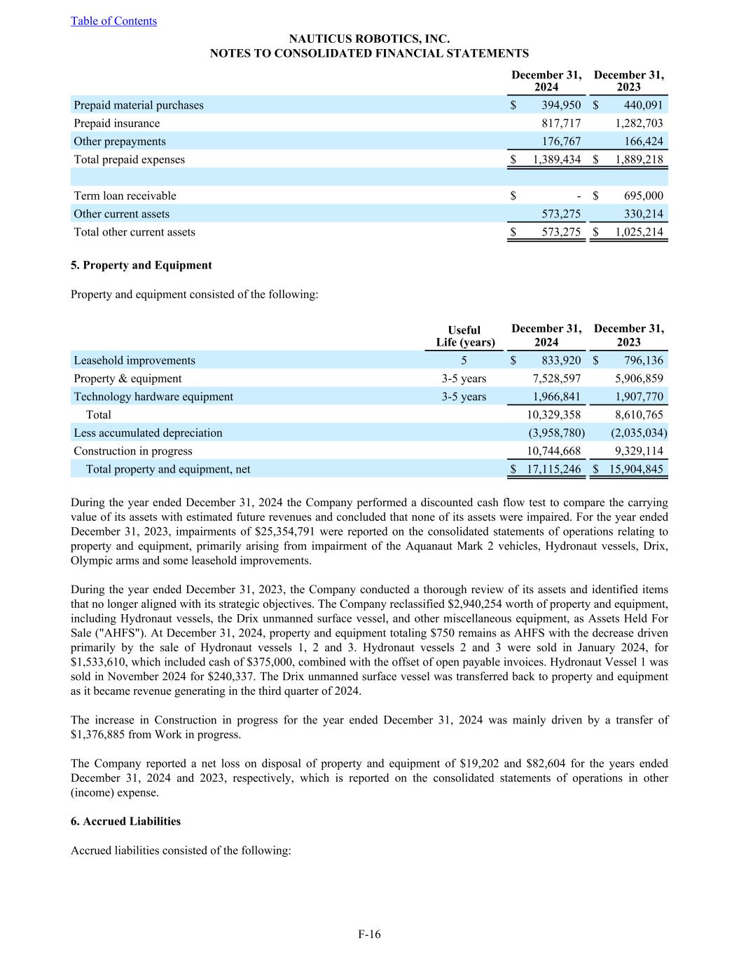 December 31, 2024 December 31, 2023 Prepaid material purchases $ 394,950 $ 440,091 Prepaid insurance 817,717 1,282,703 Other prepayments 176,767 166,424 Total prepaid expenses $ 1,389,434 $ 1,889,218 Term loan receivable $ - $ 695,000 Other current assets 573,275 330,214 Total other current assets $ 573,275 $ 1,025,214 5. Property and Equipment Property and equipment consisted of the following: Useful Life (years) December 31, 2024 December 31, 2023 Leasehold improvements 5 $ 833,920 $ 796,136 Property & equipment 3-5 years 7,528,597 5,906,859 Technology hardware equipment 3-5 years 1,966,841 1,907,770 Total 10,329,358 8,610,765 Less accumulated depreciation (3,958,780) (2,035,034) Construction in progress 10,744,668 9,329,114 Total property and equipment, net $ 17,115,246 $ 15,904,845 During the year ended December 31, 2024 the Company performed a discounted cash flow test to compare the carrying value of its assets with estimated future revenues and concluded that none of its assets were impaired. For the year ended December 31, 2023, impairments of $25,354,791 were reported on the consolidated statements of operations relating to property and equipment, primarily arising from impairment of the Aquanaut Mark 2 vehicles, Hydronaut vessels, Drix, Olympic arms and some leasehold improvements. During the year ended December 31, 2023, the Company conducted a thorough review of its assets and identified items that no longer aligned with its strategic objectives. The Company reclassified $2,940,254 worth of property and equipment, including Hydronaut vessels, the Drix unmanned surface vessel, and other miscellaneous equipment, as Assets Held For Sale ("AHFS"). At December 31, 2024, property and equipment totaling $750 remains as AHFS with the decrease driven primarily by the sale of Hydronaut vessels 1, 2 and 3. Hydronaut vessels 2 and 3 were sold in January 2024, for $1,533,610, which included cash of $375,000, combined with the offset of open payable invoices. Hydronaut Vessel 1 was sold in November 2024 for $240,337. The Drix unmanned surface vessel was transferred back to property and equipment as it became revenue generating in the third quarter of 2024. The increase in Construction in progress for the year ended December 31, 2024 was mainly driven by a transfer of $1,376,885 from Work in progress. The Company reported a net loss on disposal of property and equipment of $19,202 and $82,604 for the years ended December 31, 2024 and 2023, respectively, which is reported on the consolidated statements of operations in other (income) expense. 6. Accrued Liabilities Accrued liabilities consisted of the following: Table of Contents NAUTICUS ROBOTICS, INC. NOTES TO CONSOLIDATED FINANCIAL STATEMENTS F-16