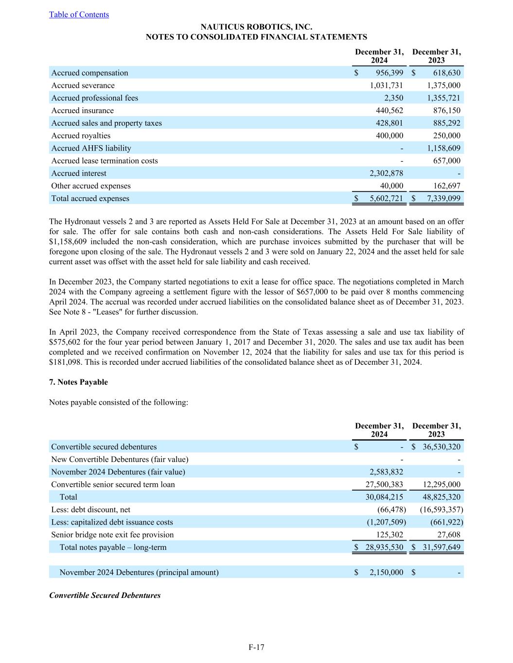 December 31, 2024 December 31, 2023 Accrued compensation $ 956,399 $ 618,630 Accrued severance 1,031,731 1,375,000 Accrued professional fees 2,350 1,355,721 Accrued insurance 440,562 876,150 Accrued sales and property taxes 428,801 885,292 Accrued royalties 400,000 250,000 Accrued AHFS liability - 1,158,609 Accrued lease termination costs - 657,000 Accrued interest 2,302,878 - Other accrued expenses 40,000 162,697 Total accrued expenses $ 5,602,721 $ 7,339,099 The Hydronaut vessels 2 and 3 are reported as Assets Held For Sale at December 31, 2023 at an amount based on an offer for sale. The offer for sale contains both cash and non-cash considerations. The Assets Held For Sale liability of $1,158,609 included the non-cash consideration, which are purchase invoices submitted by the purchaser that will be foregone upon closing of the sale. The Hydronaut vessels 2 and 3 were sold on January 22, 2024 and the asset held for sale current asset was offset with the asset held for sale liability and cash received. In December 2023, the Company started negotiations to exit a lease for office space. The negotiations completed in March 2024 with the Company agreeing a settlement figure with the lessor of $657,000 to be paid over 8 months commencing April 2024. The accrual was recorded under accrued liabilities on the consolidated balance sheet as of December 31, 2023. See Note 8 - "Leases" for further discussion. In April 2023, the Company received correspondence from the State of Texas assessing a sale and use tax liability of $575,602 for the four year period between January 1, 2017 and December 31, 2020. The sales and use tax audit has been completed and we received confirmation on November 12, 2024 that the liability for sales and use tax for this period is $181,098. This is recorded under accrued liabilities of the consolidated balance sheet as of December 31, 2024. 7. Notes Payable Notes payable consisted of the following: December 31, 2024 December 31, 2023 Convertible secured debentures $ - $ 36,530,320 New Convertible Debentures (fair value) - - November 2024 Debentures (fair value) 2,583,832 - Convertible senior secured term loan 27,500,383 12,295,000 Total 30,084,215 48,825,320 Less: debt discount, net (66,478) (16,593,357) Less: capitalized debt issuance costs (1,207,509) (661,922) Senior bridge note exit fee provision 125,302 27,608 Total notes payable – long-term $ 28,935,530 $ 31,597,649 November 2024 Debentures (principal amount) $ 2,150,000 $ - Convertible Secured Debentures Table of Contents NAUTICUS ROBOTICS, INC. NOTES TO CONSOLIDATED FINANCIAL STATEMENTS F-17