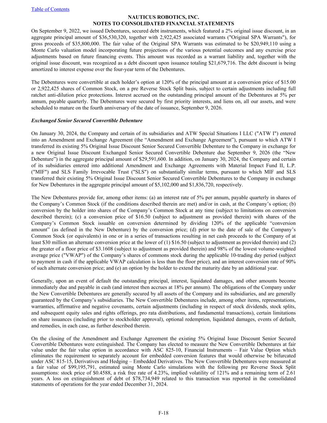 On September 9, 2022, we issued Debentures, secured debt instruments, which featured a 2% original issue discount, in an aggregate principal amount of $36,530,320, together with 2,922,425 associated warrants ("Original SPA Warrants"), for gross proceeds of $35,800,000. The fair value of the Original SPA Warrants was estimated to be $20,949,110 using a Monte Carlo valuation model incorporating future projections of the various potential outcomes and any exercise price adjustments based on future financing events. This amount was recorded as a warrant liability and, together with the original issue discount, was recognized as a debt discount upon issuance totaling $21,679,716. The debt discount is being amortized to interest expense over the four-year term of the Debentures. The Debentures were convertible at each holder’s option at 120% of the principal amount at a conversion price of $15.00 or 2,922,425 shares of Common Stock, on a pre Reverse Stock Split basis, subject to certain adjustments including full ratchet anti-dilution price protections. Interest accrued on the outstanding principal amount of the Debentures at 5% per annum, payable quarterly. The Debentures were secured by first priority interests, and liens on, all our assets, and were scheduled to mature on the fourth anniversary of the date of issuance, September 9, 2026. Exchanged Senior Secured Convertible Debenture On January 30, 2024, the Company and certain of its subsidiaries and ATW Special Situations I LLC ("ATW I") entered into an Amendment and Exchange Agreement (the “Amendment and Exchange Agreement”), pursuant to which ATW I transferred its existing 5% Original Issue Discount Senior Secured Convertible Debenture to the Company in exchange for a new Original Issue Discount Exchanged Senior Secured Convertible Debenture due September 9, 2026 (the “New Debenture”) in the aggregate principal amount of $29,591,600. In addition, on January 30, 2024, the Company and certain of its subsidiaries entered into additional Amendment and Exchange Agreements with Material Impact Fund II, L.P. ("MIF") and SLS Family Irrevocable Trust ("SLS") on substantially similar terms, pursuant to which MIF and SLS transferred their existing 5% Original Issue Discount Senior Secured Convertible Debentures to the Company in exchange for New Debentures in the aggregate principal amount of $5,102,000 and $1,836,720, respectively. The New Debentures provide for, among other items: (a) an interest rate of 5% per annum, payable quarterly in shares of the Company’s Common Stock (if the conditions described therein are met) and/or in cash, at the Company’s option; (b) conversion by the holder into shares of the Company’s Common Stock at any time (subject to limitations on conversion described therein); (c) a conversion price of $16.50 (subject to adjustment as provided therein) with shares of the Company’s Common Stock issuable on conversion determined by dividing 120% of the applicable “conversion amount” (as defined in the New Debenture) by the conversion price; (d) prior to the date of sale of the Company’s Common Stock (or equivalents) in one or in a series of transactions resulting in net cash proceeds to the Company of at least $30 million an alternate conversion price at the lower of (1) $16.50 (subject to adjustment as provided therein) and (2) the greater of a floor price of $3.1608 (subject to adjustment as provided therein) and 98% of the lowest volume-weighted average price ("VWAP") of the Company’s shares of commons stock during the applicable 10-trading day period (subject to payment in cash if the applicable VWAP calculation is less than the floor price), and an interest conversion rate of 90% of such alternate conversion price; and (e) an option by the holder to extend the maturity date by an additional year. Generally, upon an event of default the outstanding principal, interest, liquidated damages, and other amounts become immediately due and payable in cash (and interest then accrues at 18% per annum). The obligations of the Company under the New Convertible Debentures are generally secured by all assets of the Company and its subsidiaries, and are generally guaranteed by the Company’s subsidiaries. The New Convertible Debentures include, among other items, representations, warranties, affirmative and negative covenants, certain adjustments (including in respect of stock dividends, stock splits, and subsequent equity sales and rights offerings, pro rata distributions, and fundamental transactions), certain limitations on share issuances (including prior to stockholder approval), optional redemption, liquidated damages, events of default, and remedies, in each case, as further described therein. On the closing of the Amendment and Exchange Agreement the existing 5% Original Issue Discount Senior Secured Convertible Debentures were extinguished. The Company has elected to measure the New Convertible Debentures at fair value under the fair value option in accordance with ASC 825-10, Financial Instruments – Fair Value Option which eliminates the requirement to separately account for embedded conversion features that would otherwise be bifurcated under ASC 815-15, Derivatives and Hedging – Embedded Derivatives. The New Convertible Debentures were measured at a fair value of $99,195,791, estimated using Monte Carlo simulations with the following pre Reverse Stock Split assumptions: stock price of $0.4588, a risk free rate of 4.23%, implied volatility of 121% and a remaining term of 2.61 years. A loss on extinguishment of debt of $78,734,949 related to this transaction was reported in the consolidated statements of operations for the year ended December 31, 2024. Table of Contents NAUTICUS ROBOTICS, INC. NOTES TO CONSOLIDATED FINANCIAL STATEMENTS F-18