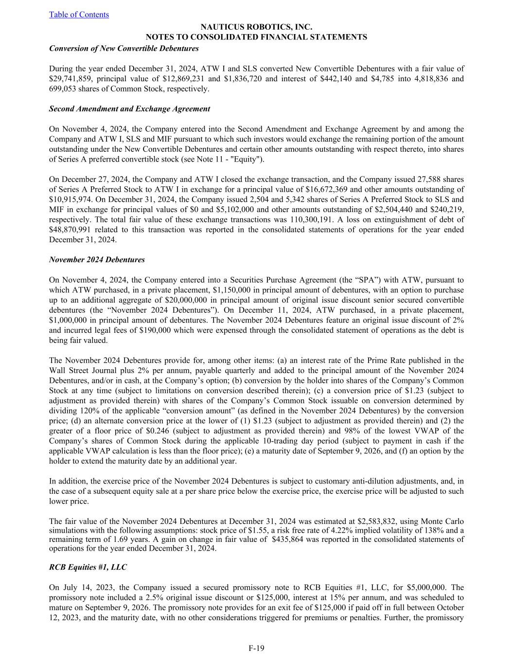 Conversion of New Convertible Debentures During the year ended December 31, 2024, ATW I and SLS converted New Convertible Debentures with a fair value of $29,741,859, principal value of $12,869,231 and $1,836,720 and interest of $442,140 and $4,785 into 4,818,836 and 699,053 shares of Common Stock, respectively. Second Amendment and Exchange Agreement On November 4, 2024, the Company entered into the Second Amendment and Exchange Agreement by and among the Company and ATW I, SLS and MIF pursuant to which such investors would exchange the remaining portion of the amount outstanding under the New Convertible Debentures and certain other amounts outstanding with respect thereto, into shares of Series A preferred convertible stock (see Note 11 - "Equity"). On December 27, 2024, the Company and ATW I closed the exchange transaction, and the Company issued 27,588 shares of Series A Preferred Stock to ATW I in exchange for a principal value of $16,672,369 and other amounts outstanding of $10,915,974. On December 31, 2024, the Company issued 2,504 and 5,342 shares of Series A Preferred Stock to SLS and MIF in exchange for principal values of $0 and $5,102,000 and other amounts outstanding of $2,504,440 and $240,219, respectively. The total fair value of these exchange transactions was 110,300,191. A loss on extinguishment of debt of $48,870,991 related to this transaction was reported in the consolidated statements of operations for the year ended December 31, 2024. November 2024 Debentures On November 4, 2024, the Company entered into a Securities Purchase Agreement (the “SPA”) with ATW, pursuant to which ATW purchased, in a private placement, $1,150,000 in principal amount of debentures, with an option to purchase up to an additional aggregate of $20,000,000 in principal amount of original issue discount senior secured convertible debentures (the “November 2024 Debentures”). On December 11, 2024, ATW purchased, in a private placement, $1,000,000 in principal amount of debentures. The November 2024 Debentures feature an original issue discount of 2% and incurred legal fees of $190,000 which were expensed through the consolidated statement of operations as the debt is being fair valued. The November 2024 Debentures provide for, among other items: (a) an interest rate of the Prime Rate published in the Wall Street Journal plus 2% per annum, payable quarterly and added to the principal amount of the November 2024 Debentures, and/or in cash, at the Company’s option; (b) conversion by the holder into shares of the Company’s Common Stock at any time (subject to limitations on conversion described therein); (c) a conversion price of $1.23 (subject to adjustment as provided therein) with shares of the Company’s Common Stock issuable on conversion determined by dividing 120% of the applicable “conversion amount” (as defined in the November 2024 Debentures) by the conversion price; (d) an alternate conversion price at the lower of (1) $1.23 (subject to adjustment as provided therein) and (2) the greater of a floor price of $0.246 (subject to adjustment as provided therein) and 98% of the lowest VWAP of the Company’s shares of Common Stock during the applicable 10-trading day period (subject to payment in cash if the applicable VWAP calculation is less than the floor price); (e) a maturity date of September 9, 2026, and (f) an option by the holder to extend the maturity date by an additional year. In addition, the exercise price of the November 2024 Debentures is subject to customary anti-dilution adjustments, and, in the case of a subsequent equity sale at a per share price below the exercise price, the exercise price will be adjusted to such lower price. The fair value of the November 2024 Debentures at December 31, 2024 was estimated at $2,583,832, using Monte Carlo simulations with the following assumptions: stock price of $1.55, a risk free rate of 4.22% implied volatility of 138% and a remaining term of 1.69 years. A gain on change in fair value of $435,864 was reported in the consolidated statements of operations for the year ended December 31, 2024. RCB Equities #1, LLC On July 14, 2023, the Company issued a secured promissory note to RCB Equities #1, LLC, for $5,000,000. The promissory note included a 2.5% original issue discount or $125,000, interest at 15% per annum, and was scheduled to mature on September 9, 2026. The promissory note provides for an exit fee of $125,000 if paid off in full between October 12, 2023, and the maturity date, with no other considerations triggered for premiums or penalties. Further, the promissory Table of Contents NAUTICUS ROBOTICS, INC. NOTES TO CONSOLIDATED FINANCIAL STATEMENTS F-19