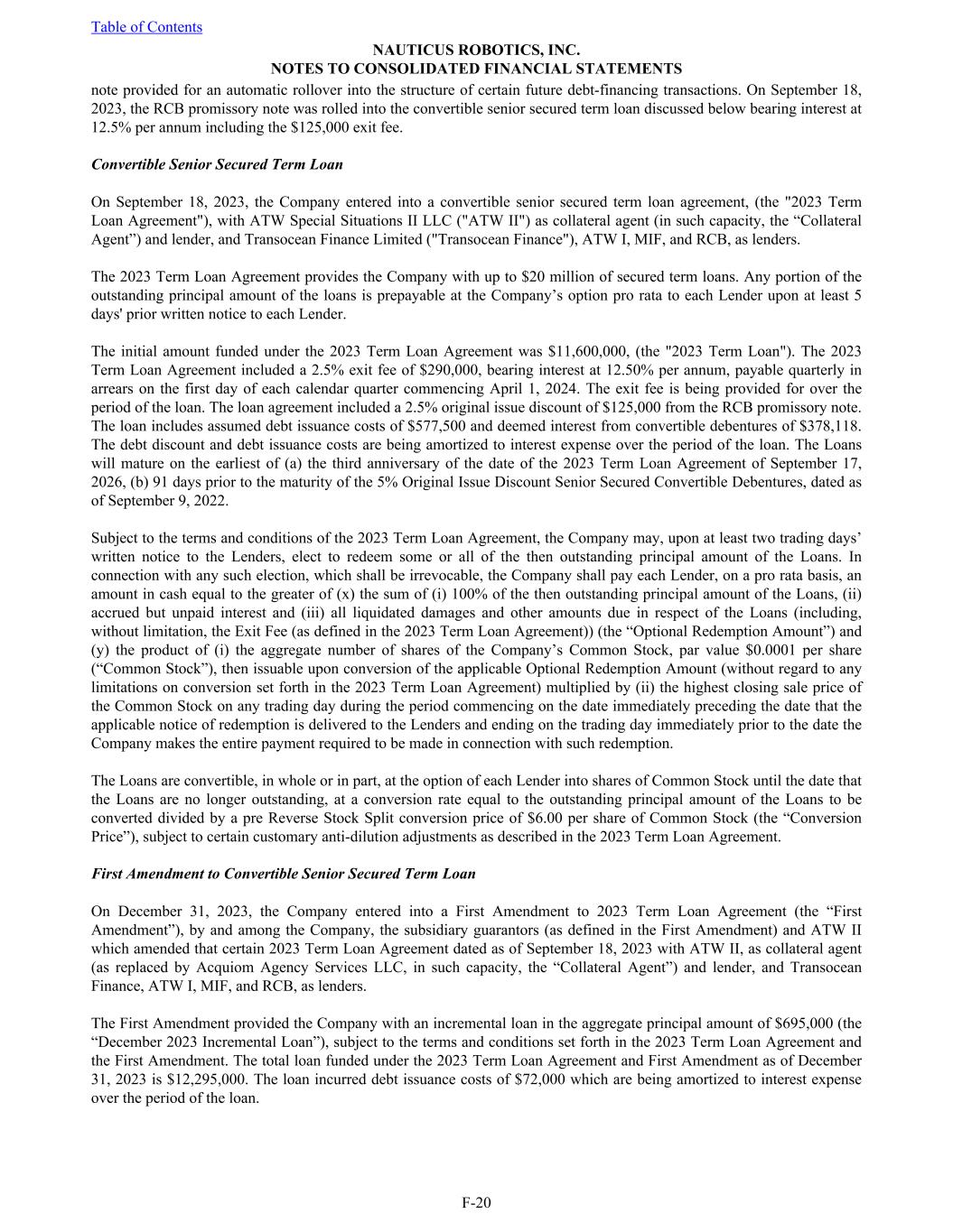 note provided for an automatic rollover into the structure of certain future debt-financing transactions. On September 18, 2023, the RCB promissory note was rolled into the convertible senior secured term loan discussed below bearing interest at 12.5% per annum including the $125,000 exit fee. Convertible Senior Secured Term Loan On September 18, 2023, the Company entered into a convertible senior secured term loan agreement, (the "2023 Term Loan Agreement"), with ATW Special Situations II LLC ("ATW II") as collateral agent (in such capacity, the “Collateral Agent”) and lender, and Transocean Finance Limited ("Transocean Finance"), ATW I, MIF, and RCB, as lenders. The 2023 Term Loan Agreement provides the Company with up to $20 million of secured term loans. Any portion of the outstanding principal amount of the loans is prepayable at the Company’s option pro rata to each Lender upon at least 5 days' prior written notice to each Lender. The initial amount funded under the 2023 Term Loan Agreement was $11,600,000, (the "2023 Term Loan"). The 2023 Term Loan Agreement included a 2.5% exit fee of $290,000, bearing interest at 12.50% per annum, payable quarterly in arrears on the first day of each calendar quarter commencing April 1, 2024. The exit fee is being provided for over the period of the loan. The loan agreement included a 2.5% original issue discount of $125,000 from the RCB promissory note. The loan includes assumed debt issuance costs of $577,500 and deemed interest from convertible debentures of $378,118. The debt discount and debt issuance costs are being amortized to interest expense over the period of the loan. The Loans will mature on the earliest of (a) the third anniversary of the date of the 2023 Term Loan Agreement of September 17, 2026, (b) 91 days prior to the maturity of the 5% Original Issue Discount Senior Secured Convertible Debentures, dated as of September 9, 2022. Subject to the terms and conditions of the 2023 Term Loan Agreement, the Company may, upon at least two trading days’ written notice to the Lenders, elect to redeem some or all of the then outstanding principal amount of the Loans. In connection with any such election, which shall be irrevocable, the Company shall pay each Lender, on a pro rata basis, an amount in cash equal to the greater of (x) the sum of (i) 100% of the then outstanding principal amount of the Loans, (ii) accrued but unpaid interest and (iii) all liquidated damages and other amounts due in respect of the Loans (including, without limitation, the Exit Fee (as defined in the 2023 Term Loan Agreement)) (the “Optional Redemption Amount”) and (y) the product of (i) the aggregate number of shares of the Company’s Common Stock, par value $0.0001 per share (“Common Stock”), then issuable upon conversion of the applicable Optional Redemption Amount (without regard to any limitations on conversion set forth in the 2023 Term Loan Agreement) multiplied by (ii) the highest closing sale price of the Common Stock on any trading day during the period commencing on the date immediately preceding the date that the applicable notice of redemption is delivered to the Lenders and ending on the trading day immediately prior to the date the Company makes the entire payment required to be made in connection with such redemption. The Loans are convertible, in whole or in part, at the option of each Lender into shares of Common Stock until the date that the Loans are no longer outstanding, at a conversion rate equal to the outstanding principal amount of the Loans to be converted divided by a pre Reverse Stock Split conversion price of $6.00 per share of Common Stock (the “Conversion Price”), subject to certain customary anti-dilution adjustments as described in the 2023 Term Loan Agreement. First Amendment to Convertible Senior Secured Term Loan On December 31, 2023, the Company entered into a First Amendment to 2023 Term Loan Agreement (the “First Amendment”), by and among the Company, the subsidiary guarantors (as defined in the First Amendment) and ATW II which amended that certain 2023 Term Loan Agreement dated as of September 18, 2023 with ATW II, as collateral agent (as replaced by Acquiom Agency Services LLC, in such capacity, the “Collateral Agent”) and lender, and Transocean Finance, ATW I, MIF, and RCB, as lenders. The First Amendment provided the Company with an incremental loan in the aggregate principal amount of $695,000 (the “December 2023 Incremental Loan”), subject to the terms and conditions set forth in the 2023 Term Loan Agreement and the First Amendment. The total loan funded under the 2023 Term Loan Agreement and First Amendment as of December 31, 2023 is $12,295,000. The loan incurred debt issuance costs of $72,000 which are being amortized to interest expense over the period of the loan. Table of Contents NAUTICUS ROBOTICS, INC. NOTES TO CONSOLIDATED FINANCIAL STATEMENTS F-20