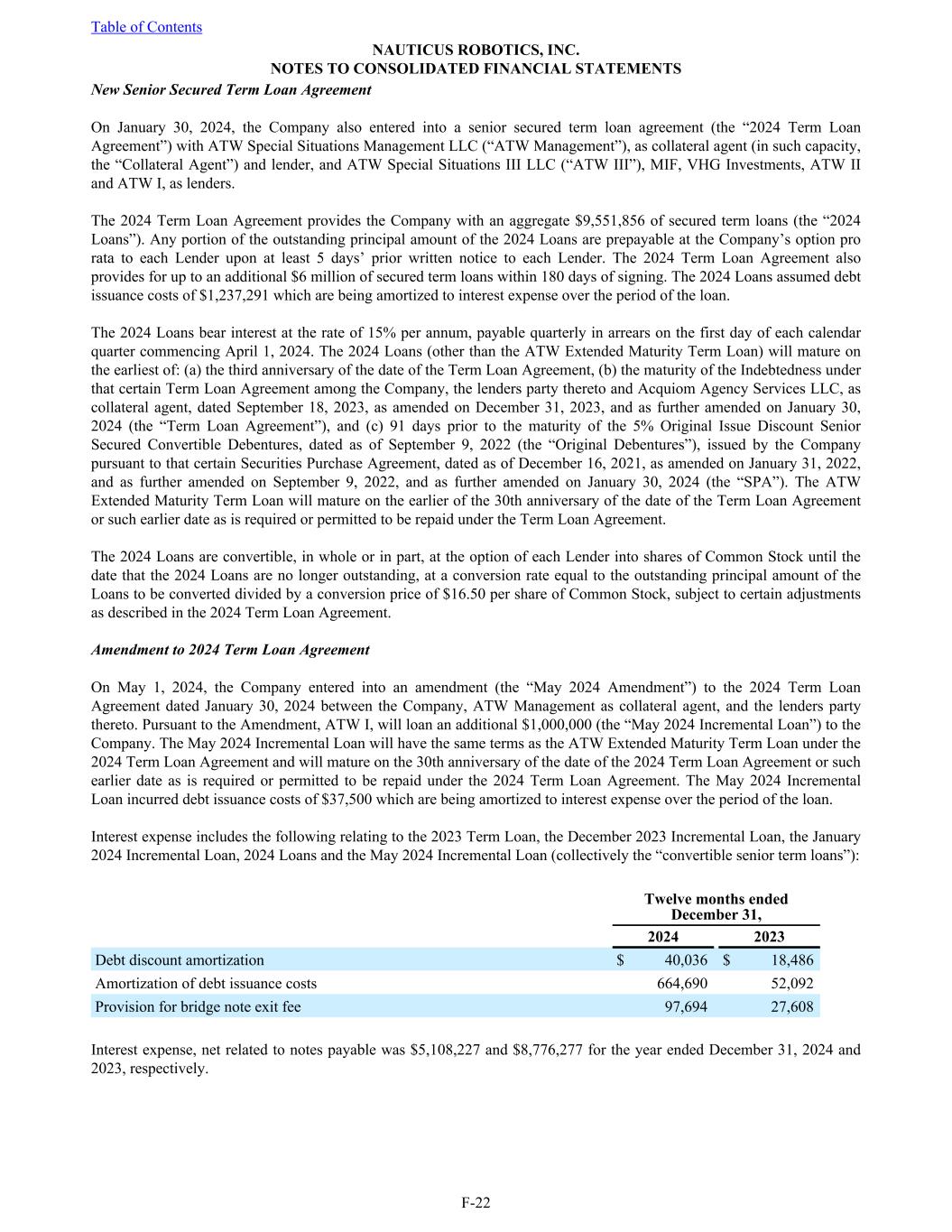 New Senior Secured Term Loan Agreement On January 30, 2024, the Company also entered into a senior secured term loan agreement (the “2024 Term Loan Agreement”) with ATW Special Situations Management LLC (“ATW Management”), as collateral agent (in such capacity, the “Collateral Agent”) and lender, and ATW Special Situations III LLC (“ATW III”), MIF, VHG Investments, ATW II and ATW I, as lenders. The 2024 Term Loan Agreement provides the Company with an aggregate $9,551,856 of secured term loans (the “2024 Loans”). Any portion of the outstanding principal amount of the 2024 Loans are prepayable at the Company’s option pro rata to each Lender upon at least 5 days’ prior written notice to each Lender. The 2024 Term Loan Agreement also provides for up to an additional $6 million of secured term loans within 180 days of signing. The 2024 Loans assumed debt issuance costs of $1,237,291 which are being amortized to interest expense over the period of the loan. The 2024 Loans bear interest at the rate of 15% per annum, payable quarterly in arrears on the first day of each calendar quarter commencing April 1, 2024. The 2024 Loans (other than the ATW Extended Maturity Term Loan) will mature on the earliest of: (a) the third anniversary of the date of the Term Loan Agreement, (b) the maturity of the Indebtedness under that certain Term Loan Agreement among the Company, the lenders party thereto and Acquiom Agency Services LLC, as collateral agent, dated September 18, 2023, as amended on December 31, 2023, and as further amended on January 30, 2024 (the “Term Loan Agreement”), and (c) 91 days prior to the maturity of the 5% Original Issue Discount Senior Secured Convertible Debentures, dated as of September 9, 2022 (the “Original Debentures”), issued by the Company pursuant to that certain Securities Purchase Agreement, dated as of December 16, 2021, as amended on January 31, 2022, and as further amended on September 9, 2022, and as further amended on January 30, 2024 (the “SPA”). The ATW Extended Maturity Term Loan will mature on the earlier of the 30th anniversary of the date of the Term Loan Agreement or such earlier date as is required or permitted to be repaid under the Term Loan Agreement. The 2024 Loans are convertible, in whole or in part, at the option of each Lender into shares of Common Stock until the date that the 2024 Loans are no longer outstanding, at a conversion rate equal to the outstanding principal amount of the Loans to be converted divided by a conversion price of $16.50 per share of Common Stock, subject to certain adjustments as described in the 2024 Term Loan Agreement. Amendment to 2024 Term Loan Agreement On May 1, 2024, the Company entered into an amendment (the “May 2024 Amendment”) to the 2024 Term Loan Agreement dated January 30, 2024 between the Company, ATW Management as collateral agent, and the lenders party thereto. Pursuant to the Amendment, ATW I, will loan an additional $1,000,000 (the “May 2024 Incremental Loan”) to the Company. The May 2024 Incremental Loan will have the same terms as the ATW Extended Maturity Term Loan under the 2024 Term Loan Agreement and will mature on the 30th anniversary of the date of the 2024 Term Loan Agreement or such earlier date as is required or permitted to be repaid under the 2024 Term Loan Agreement. The May 2024 Incremental Loan incurred debt issuance costs of $37,500 which are being amortized to interest expense over the period of the loan. Interest expense includes the following relating to the 2023 Term Loan, the December 2023 Incremental Loan, the January 2024 Incremental Loan, 2024 Loans and the May 2024 Incremental Loan (collectively the “convertible senior term loans”): Twelve months ended December 31, 2024 2023 Debt discount amortization $ 40,036 $ 18,486 Amortization of debt issuance costs 664,690 52,092 Provision for bridge note exit fee 97,694 27,608 Interest expense, net related to notes payable was $5,108,227 and $8,776,277 for the year ended December 31, 2024 and 2023, respectively. Table of Contents NAUTICUS ROBOTICS, INC. NOTES TO CONSOLIDATED FINANCIAL STATEMENTS F-22