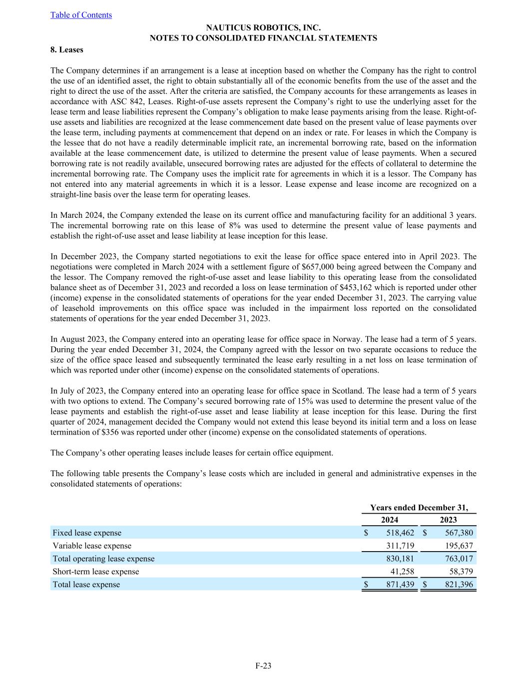 8. Leases The Company determines if an arrangement is a lease at inception based on whether the Company has the right to control the use of an identified asset, the right to obtain substantially all of the economic benefits from the use of the asset and the right to direct the use of the asset. After the criteria are satisfied, the Company accounts for these arrangements as leases in accordance with ASC 842, Leases. Right-of-use assets represent the Company’s right to use the underlying asset for the lease term and lease liabilities represent the Company’s obligation to make lease payments arising from the lease. Right-of- use assets and liabilities are recognized at the lease commencement date based on the present value of lease payments over the lease term, including payments at commencement that depend on an index or rate. For leases in which the Company is the lessee that do not have a readily determinable implicit rate, an incremental borrowing rate, based on the information available at the lease commencement date, is utilized to determine the present value of lease payments. When a secured borrowing rate is not readily available, unsecured borrowing rates are adjusted for the effects of collateral to determine the incremental borrowing rate. The Company uses the implicit rate for agreements in which it is a lessor. The Company has not entered into any material agreements in which it is a lessor. Lease expense and lease income are recognized on a straight-line basis over the lease term for operating leases. In March 2024, the Company extended the lease on its current office and manufacturing facility for an additional 3 years. The incremental borrowing rate on this lease of 8% was used to determine the present value of lease payments and establish the right-of-use asset and lease liability at lease inception for this lease. In December 2023, the Company started negotiations to exit the lease for office space entered into in April 2023. The negotiations were completed in March 2024 with a settlement figure of $657,000 being agreed between the Company and the lessor. The Company removed the right-of-use asset and lease liability to this operating lease from the consolidated balance sheet as of December 31, 2023 and recorded a loss on lease termination of $453,162 which is reported under other (income) expense in the consolidated statements of operations for the year ended December 31, 2023. The carrying value of leasehold improvements on this office space was included in the impairment loss reported on the consolidated statements of operations for the year ended December 31, 2023. In August 2023, the Company entered into an operating lease for office space in Norway. The lease had a term of 5 years. During the year ended December 31, 2024, the Company agreed with the lessor on two separate occasions to reduce the size of the office space leased and subsequently terminated the lease early resulting in a net loss on lease termination of which was reported under other (income) expense on the consolidated statements of operations. In July of 2023, the Company entered into an operating lease for office space in Scotland. The lease had a term of 5 years with two options to extend. The Company’s secured borrowing rate of 15% was used to determine the present value of the lease payments and establish the right-of-use asset and lease liability at lease inception for this lease. During the first quarter of 2024, management decided the Company would not extend this lease beyond its initial term and a loss on lease termination of $356 was reported under other (income) expense on the consolidated statements of operations. The Company’s other operating leases include leases for certain office equipment. The following table presents the Company’s lease costs which are included in general and administrative expenses in the consolidated statements of operations: Years ended December 31, 2024 2023 Fixed lease expense $ 518,462 $ 567,380 Variable lease expense 311,719 195,637 Total operating lease expense 830,181 763,017 Short-term lease expense 41,258 58,379 Total lease expense $ 871,439 $ 821,396 Table of Contents NAUTICUS ROBOTICS, INC. NOTES TO CONSOLIDATED FINANCIAL STATEMENTS F-23