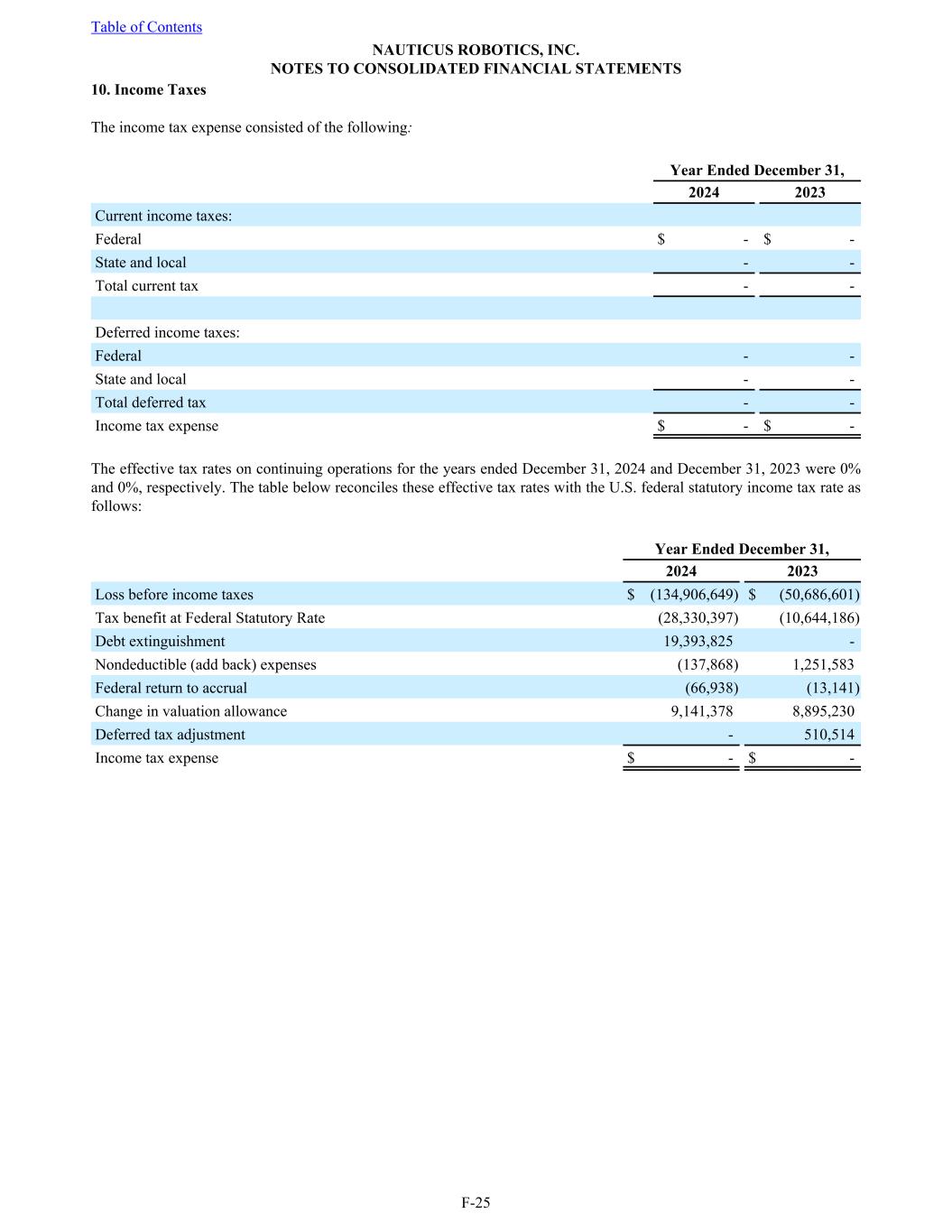 10. Income Taxes The income tax expense consisted of the following: Year Ended December 31, 2024 2023 Current income taxes: Federal $ - $ - State and local - - Total current tax - - Deferred income taxes: Federal - - State and local - - Total deferred tax - - Income tax expense $ - $ - The effective tax rates on continuing operations for the years ended December 31, 2024 and December 31, 2023 were 0% and 0%, respectively. The table below reconciles these effective tax rates with the U.S. federal statutory income tax rate as follows: Year Ended December 31, 2024 2023 Loss before income taxes $ (134,906,649) $ (50,686,601) Tax benefit at Federal Statutory Rate (28,330,397) (10,644,186) Debt extinguishment 19,393,825 - Nondeductible (add back) expenses (137,868) 1,251,583 Federal return to accrual (66,938) (13,141) Change in valuation allowance 9,141,378 8,895,230 Deferred tax adjustment - 510,514 Income tax expense $ - $ - Table of Contents NAUTICUS ROBOTICS, INC. NOTES TO CONSOLIDATED FINANCIAL STATEMENTS F-25