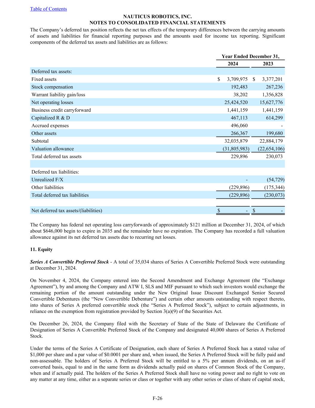The Company’s deferred tax position reflects the net tax effects of the temporary differences between the carrying amounts of assets and liabilities for financial reporting purposes and the amounts used for income tax reporting. Significant components of the deferred tax assets and liabilities are as follows: Year Ended December 31, 2024 2023 Deferred tax assets: Fixed assets $ 3,709,975 $ 3,377,201 Stock compensation 192,483 267,236 Warrant liability gain/loss 38,202 1,356,828 Net operating losses 25,424,520 15,627,776 Business credit carryforward 1,441,159 1,441,159 Capitalized R & D 467,113 614,299 Accrued expenses 496,060 - Other assets 266,367 199,680 Subtotal 32,035,879 22,884,179 Valuation allowance (31,805,983) (22,654,106) Total deferred tax assets 229,896 230,073 Deferred tax liabilities: Unrealized F/X - (54,729) Other liabilities (229,896) (175,344) Total deferred tax liabilities (229,896) (230,073) Net deferred tax assets/(liabilities) $ - $ - The Company has federal net operating loss carryforwards of approximately $121 million at December 31, 2024, of which about $646,000 begin to expire in 2035 and the remainder have no expiration. The Company has recorded a full valuation allowance against its net deferred tax assets due to recurring net losses. 11. Equity Series A Convertible Preferred Stock - A total of 35,034 shares of Series A Convertible Preferred Stock were outstanding at December 31, 2024. On November 4, 2024, the Company entered into the Second Amendment and Exchange Agreement (the “Exchange Agreement”), by and among the Company and ATW I, SLS and MIF pursuant to which such investors would exchange the remaining portion of the amount outstanding under the New Original Issue Discount Exchanged Senior Secured Convertible Debentures (the “New Convertible Debenture”) and certain other amounts outstanding with respect thereto, into shares of Series A preferred convertible stock (the “Series A Preferred Stock”), subject to certain adjustments, in reliance on the exemption from registration provided by Section 3(a)(9) of the Securities Act. On December 26, 2024, the Company filed with the Secretary of State of the State of Delaware the Certificate of Designation of Series A Convertible Preferred Stock of the Company and designated 40,000 shares of Series A Preferred Stock. Under the terms of the Series A Certificate of Designation, each share of Series A Preferred Stock has a stated value of $1,000 per share and a par value of $0.0001 per share and, when issued, the Series A Preferred Stock will be fully paid and non-assessable. The holders of Series A Preferred Stock will be entitled to a 5% per annum dividends, on an as-if converted basis, equal to and in the same form as dividends actually paid on shares of Common Stock of the Company, when and if actually paid. The holders of the Series A Preferred Stock shall have no voting power and no right to vote on any matter at any time, either as a separate series or class or together with any other series or class of share of capital stock, Table of Contents NAUTICUS ROBOTICS, INC. NOTES TO CONSOLIDATED FINANCIAL STATEMENTS F-26