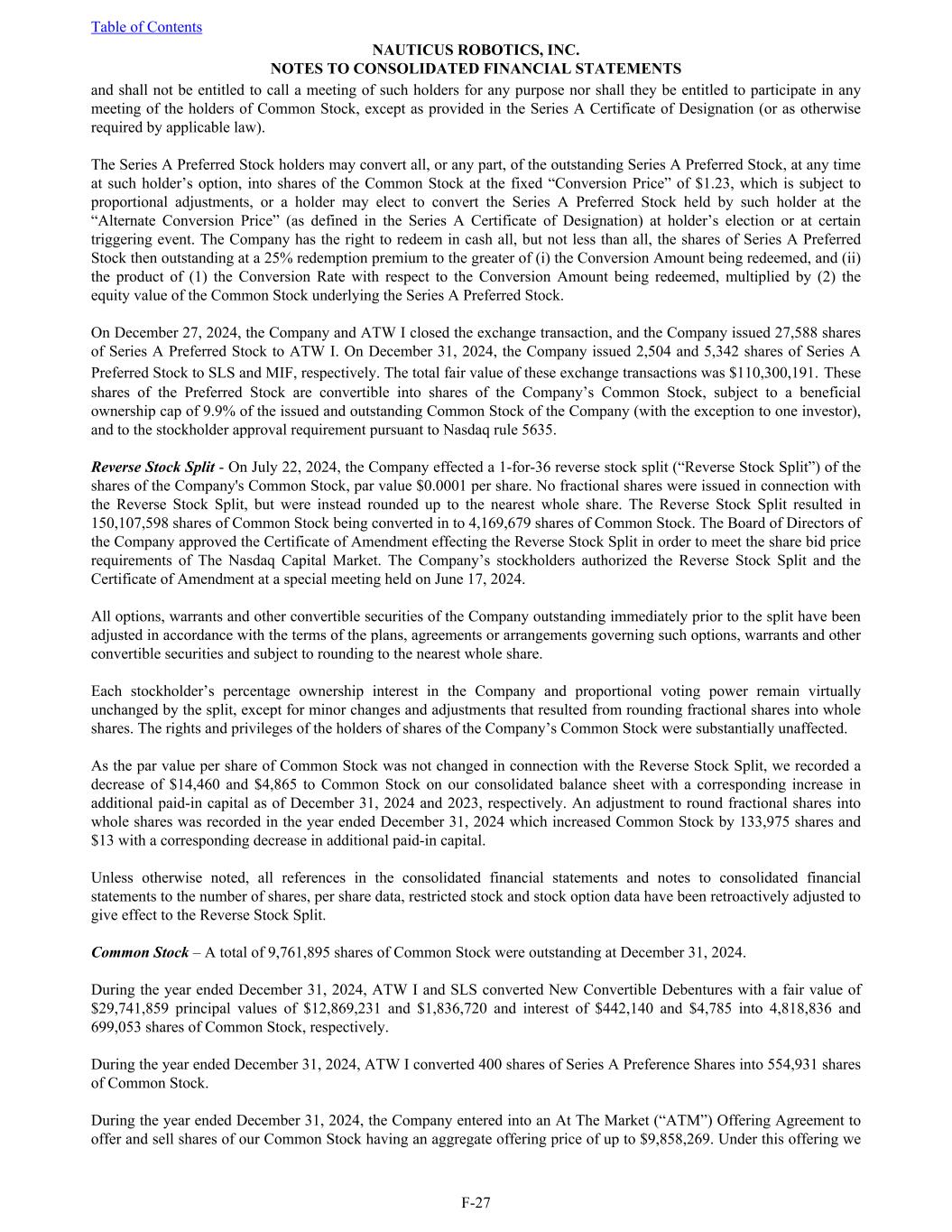 and shall not be entitled to call a meeting of such holders for any purpose nor shall they be entitled to participate in any meeting of the holders of Common Stock, except as provided in the Series A Certificate of Designation (or as otherwise required by applicable law). The Series A Preferred Stock holders may convert all, or any part, of the outstanding Series A Preferred Stock, at any time at such holder’s option, into shares of the Common Stock at the fixed “Conversion Price” of $1.23, which is subject to proportional adjustments, or a holder may elect to convert the Series A Preferred Stock held by such holder at the “Alternate Conversion Price” (as defined in the Series A Certificate of Designation) at holder’s election or at certain triggering event. The Company has the right to redeem in cash all, but not less than all, the shares of Series A Preferred Stock then outstanding at a 25% redemption premium to the greater of (i) the Conversion Amount being redeemed, and (ii) the product of (1) the Conversion Rate with respect to the Conversion Amount being redeemed, multiplied by (2) the equity value of the Common Stock underlying the Series A Preferred Stock. On December 27, 2024, the Company and ATW I closed the exchange transaction, and the Company issued 27,588 shares of Series A Preferred Stock to ATW I. On December 31, 2024, the Company issued 2,504 and 5,342 shares of Series A Preferred Stock to SLS and MIF, respectively. The total fair value of these exchange transactions was $110,300,191. These shares of the Preferred Stock are convertible into shares of the Company’s Common Stock, subject to a beneficial ownership cap of 9.9% of the issued and outstanding Common Stock of the Company (with the exception to one investor), and to the stockholder approval requirement pursuant to Nasdaq rule 5635. Reverse Stock Split - On July 22, 2024, the Company effected a 1-for-36 reverse stock split (“Reverse Stock Split”) of the shares of the Company's Common Stock, par value $0.0001 per share. No fractional shares were issued in connection with the Reverse Stock Split, but were instead rounded up to the nearest whole share. The Reverse Stock Split resulted in 150,107,598 shares of Common Stock being converted in to 4,169,679 shares of Common Stock. The Board of Directors of the Company approved the Certificate of Amendment effecting the Reverse Stock Split in order to meet the share bid price requirements of The Nasdaq Capital Market. The Company’s stockholders authorized the Reverse Stock Split and the Certificate of Amendment at a special meeting held on June 17, 2024. All options, warrants and other convertible securities of the Company outstanding immediately prior to the split have been adjusted in accordance with the terms of the plans, agreements or arrangements governing such options, warrants and other convertible securities and subject to rounding to the nearest whole share. Each stockholder’s percentage ownership interest in the Company and proportional voting power remain virtually unchanged by the split, except for minor changes and adjustments that resulted from rounding fractional shares into whole shares. The rights and privileges of the holders of shares of the Company’s Common Stock were substantially unaffected. As the par value per share of Common Stock was not changed in connection with the Reverse Stock Split, we recorded a decrease of $14,460 and $4,865 to Common Stock on our consolidated balance sheet with a corresponding increase in additional paid-in capital as of December 31, 2024 and 2023, respectively. An adjustment to round fractional shares into whole shares was recorded in the year ended December 31, 2024 which increased Common Stock by 133,975 shares and $13 with a corresponding decrease in additional paid-in capital. Unless otherwise noted, all references in the consolidated financial statements and notes to consolidated financial statements to the number of shares, per share data, restricted stock and stock option data have been retroactively adjusted to give effect to the Reverse Stock Split. Common Stock – A total of 9,761,895 shares of Common Stock were outstanding at December 31, 2024. During the year ended December 31, 2024, ATW I and SLS converted New Convertible Debentures with a fair value of $29,741,859 principal values of $12,869,231 and $1,836,720 and interest of $442,140 and $4,785 into 4,818,836 and 699,053 shares of Common Stock, respectively. During the year ended December 31, 2024, ATW I converted 400 shares of Series A Preference Shares into 554,931 shares of Common Stock. During the year ended December 31, 2024, the Company entered into an At The Market (“ATM”) Offering Agreement to offer and sell shares of our Common Stock having an aggregate offering price of up to $9,858,269. Under this offering we Table of Contents NAUTICUS ROBOTICS, INC. NOTES TO CONSOLIDATED FINANCIAL STATEMENTS F-27