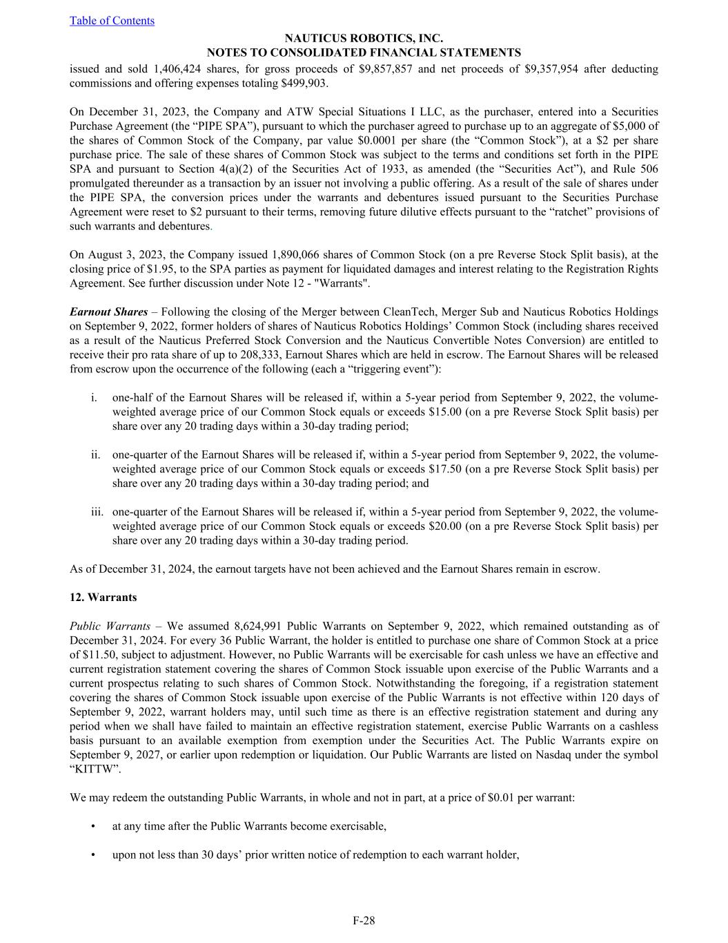 issued and sold 1,406,424 shares, for gross proceeds of $9,857,857 and net proceeds of $9,357,954 after deducting commissions and offering expenses totaling $499,903. On December 31, 2023, the Company and ATW Special Situations I LLC, as the purchaser, entered into a Securities Purchase Agreement (the “PIPE SPA”), pursuant to which the purchaser agreed to purchase up to an aggregate of $5,000 of the shares of Common Stock of the Company, par value $0.0001 per share (the “Common Stock”), at a $2 per share purchase price. The sale of these shares of Common Stock was subject to the terms and conditions set forth in the PIPE SPA and pursuant to Section 4(a)(2) of the Securities Act of 1933, as amended (the “Securities Act”), and Rule 506 promulgated thereunder as a transaction by an issuer not involving a public offering. As a result of the sale of shares under the PIPE SPA, the conversion prices under the warrants and debentures issued pursuant to the Securities Purchase Agreement were reset to $2 pursuant to their terms, removing future dilutive effects pursuant to the “ratchet” provisions of such warrants and debentures. On August 3, 2023, the Company issued 1,890,066 shares of Common Stock (on a pre Reverse Stock Split basis), at the closing price of $1.95, to the SPA parties as payment for liquidated damages and interest relating to the Registration Rights Agreement. See further discussion under Note 12 - "Warrants". Earnout Shares – Following the closing of the Merger between CleanTech, Merger Sub and Nauticus Robotics Holdings on September 9, 2022, former holders of shares of Nauticus Robotics Holdings’ Common Stock (including shares received as a result of the Nauticus Preferred Stock Conversion and the Nauticus Convertible Notes Conversion) are entitled to receive their pro rata share of up to 208,333, Earnout Shares which are held in escrow. The Earnout Shares will be released from escrow upon the occurrence of the following (each a “triggering event”): i. one-half of the Earnout Shares will be released if, within a 5-year period from September 9, 2022, the volume- weighted average price of our Common Stock equals or exceeds $15.00 (on a pre Reverse Stock Split basis) per share over any 20 trading days within a 30-day trading period; ii. one-quarter of the Earnout Shares will be released if, within a 5-year period from September 9, 2022, the volume- weighted average price of our Common Stock equals or exceeds $17.50 (on a pre Reverse Stock Split basis) per share over any 20 trading days within a 30-day trading period; and iii. one-quarter of the Earnout Shares will be released if, within a 5-year period from September 9, 2022, the volume- weighted average price of our Common Stock equals or exceeds $20.00 (on a pre Reverse Stock Split basis) per share over any 20 trading days within a 30-day trading period. As of December 31, 2024, the earnout targets have not been achieved and the Earnout Shares remain in escrow. 12. Warrants Public Warrants – We assumed 8,624,991 Public Warrants on September 9, 2022, which remained outstanding as of December 31, 2024. For every 36 Public Warrant, the holder is entitled to purchase one share of Common Stock at a price of $11.50, subject to adjustment. However, no Public Warrants will be exercisable for cash unless we have an effective and current registration statement covering the shares of Common Stock issuable upon exercise of the Public Warrants and a current prospectus relating to such shares of Common Stock. Notwithstanding the foregoing, if a registration statement covering the shares of Common Stock issuable upon exercise of the Public Warrants is not effective within 120 days of September 9, 2022, warrant holders may, until such time as there is an effective registration statement and during any period when we shall have failed to maintain an effective registration statement, exercise Public Warrants on a cashless basis pursuant to an available exemption from exemption under the Securities Act. The Public Warrants expire on September 9, 2027, or earlier upon redemption or liquidation. Our Public Warrants are listed on Nasdaq under the symbol “KITTW”. We may redeem the outstanding Public Warrants, in whole and not in part, at a price of $0.01 per warrant: • at any time after the Public Warrants become exercisable, • upon not less than 30 days’ prior written notice of redemption to each warrant holder, Table of Contents NAUTICUS ROBOTICS, INC. NOTES TO CONSOLIDATED FINANCIAL STATEMENTS F-28