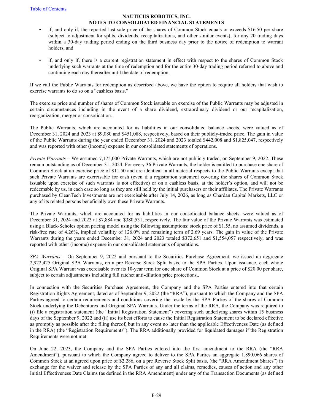 • if, and only if, the reported last sale price of the shares of Common Stock equals or exceeds $16.50 per share (subject to adjustment for splits, dividends, recapitalizations, and other similar events), for any 20 trading days within a 30-day trading period ending on the third business day prior to the notice of redemption to warrant holders, and • if, and only if, there is a current registration statement in effect with respect to the shares of Common Stock underlying such warrants at the time of redemption and for the entire 30-day trading period referred to above and continuing each day thereafter until the date of redemption. If we call the Public Warrants for redemption as described above, we have the option to require all holders that wish to exercise warrants to do so on a “cashless basis.” The exercise price and number of shares of Common Stock issuable on exercise of the Public Warrants may be adjusted in certain circumstances including in the event of a share dividend, extraordinary dividend or our recapitalization, reorganization, merger or consolidation. The Public Warrants, which are accounted for as liabilities in our consolidated balance sheets, were valued as of December 31, 2024 and 2023 at $9,080 and $451,088, respectively, based on their publicly-traded price. The gain in value of the Public Warrants during the year ended December 31, 2024 and 2023 totaled $442,008 and $1,825,047, respectively and was reported with other (income) expense in our consolidated statements of operations. Private Warrants – We assumed 7,175,000 Private Warrants, which are not publicly traded, on September 9, 2022. These remain outstanding as of December 31, 2024. For every 36 Private Warrants, the holder is entitled to purchase one share of Common Stock at an exercise price of $11.50 and are identical in all material respects to the Public Warrants except that such Private Warrants are exercisable for cash (even if a registration statement covering the shares of Common Stock issuable upon exercise of such warrants is not effective) or on a cashless basis, at the holder’s option, and will not be redeemable by us, in each case so long as they are still held by the initial purchasers or their affiliates. The Private Warrants purchased by CleanTech Investments are not exercisable after July 14, 2026, as long as Chardan Capital Markets, LLC or any of its related persons beneficially own these Private Warrants. The Private Warrants, which are accounted for as liabilities in our consolidated balance sheets, were valued as of December 31, 2024 and 2023 at $7,884 and $380,531, respectively. The fair value of the Private Warrants was estimated using a Black-Scholes option pricing model using the following assumptions: stock price of $1.55, no assumed dividends, a risk-free rate of 4.26%, implied volatility of 126.0% and remaining term of 2.69 years. The gain in value of the Private Warrants during the years ended December 31, 2024 and 2023 totaled $372,651 and $1,554,057 respectively, and was reported with other (income) expense in our consolidated statements of operations. SPA Warrants – On September 9, 2022 and pursuant to the Securities Purchase Agreement, we issued an aggregate 2,922,425 Original SPA Warrants, on a pre Reverse Stock Split basis, to the SPA Parties. Upon issuance, each whole Original SPA Warrant was exercisable over its 10-year term for one share of Common Stock at a price of $20.00 per share, subject to certain adjustments including full ratchet anti-dilution price protections.. In connection with the Securities Purchase Agreement, the Company and the SPA Parties entered into that certain Registration Rights Agreement, dated as of September 9, 2022 (the “RRA”), pursuant to which the Company and the SPA Parties agreed to certain requirements and conditions covering the resale by the SPA Parties of the shares of Common Stock underlying the Debentures and Original SPA Warrants. Under the terms of the RRA, the Company was required to (i) file a registration statement (the “Initial Registration Statement”) covering such underlying shares within 15 business days of the September 9, 2022 and (ii) use its best efforts to cause the Initial Registration Statement to be declared effective as promptly as possible after the filing thereof, but in any event no later than the applicable Effectiveness Date (as defined in the RRA) (the “Registration Requirements”). The RRA additionally provided for liquidated damages if the Registration Requirements were not met. On June 22, 2023, the Company and the SPA Parties entered into the first amendment to the RRA (the “RRA Amendment”), pursuant to which the Company agreed to deliver to the SPA Parties an aggregate 1,890,066 shares of Common Stock at an agreed upon price of $2.286, on a pre Reverse Stock Split basis, (the “RRA Amendment Shares”) in exchange for the waiver and release by the SPA Parties of any and all claims, remedies, causes of action and any other Initial Effectiveness Date Claims (as defined in the RRA Amendment) under any of the Transaction Documents (as defined Table of Contents NAUTICUS ROBOTICS, INC. NOTES TO CONSOLIDATED FINANCIAL STATEMENTS F-29