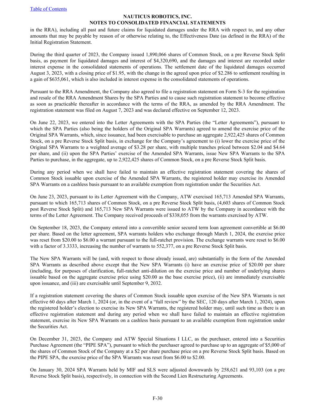 in the RRA), including all past and future claims for liquidated damages under the RRA with respect to, and any other amounts that may be payable by reason of or otherwise relating to, the Effectiveness Date (as defined in the RRA) of the Initial Registration Statement. During the third quarter of 2023, the Company issued 1,890,066 shares of Common Stock, on a pre Reverse Stock Split basis, as payment for liquidated damages and interest of $4,320,690, and the damages and interest are recorded under interest expense in the consolidated statements of operations. The settlement date of the liquidated damages occurred August 3, 2023, with a closing price of $1.95, with the change in the agreed upon price of $2.286 to settlement resulting in a gain of $635,061, which is also included in interest expense in the consolidated statements of operations. Pursuant to the RRA Amendment, the Company also agreed to file a registration statement on Form S-3 for the registration and resale of the RRA Amendment Shares by the SPA Parties and to cause such registration statement to become effective as soon as practicable thereafter in accordance with the terms of the RRA, as amended by the RRA Amendment. The registration statement was filed on August 7, 2023 and was declared effective on September 12, 2023. On June 22, 2023, we entered into the Letter Agreements with the SPA Parties (the “Letter Agreements”), pursuant to which the SPA Parties (also being the holders of the Original SPA Warrants) agreed to amend the exercise price of the Original SPA Warrants, which, since issuance, had been exercisable to purchase an aggregate 2,922,425 shares of Common Stock, on a pre Reverse Stock Split basis, in exchange for the Company’s agreement to (i) lower the exercise price of the Original SPA Warrants to a weighted average of $3.28 per share, with multiple tranches priced between $2.04 and $4.64 per share, and (ii) upon the SPA Parties’ exercise of the Amended SPA Warrants, issue New SPA Warrants to the SPA Parties to purchase, in the aggregate, up to 2,922,425 shares of Common Stock, on a pre Reverse Stock Split basis. During any period when we shall have failed to maintain an effective registration statement covering the shares of Common Stock issuable upon exercise of the Amended SPA Warrants, the registered holder may exercise its Amended SPA Warrants on a cashless basis pursuant to an available exemption from registration under the Securities Act. On June 23, 2023, pursuant to its Letter Agreement with the Company, ATW exercised 165,713 Amended SPA Warrants, pursuant to which 165,713 shares of Common Stock, on a pre Reverse Stock Split basis, (4,603 shares of Common Stock post Reverse Stock Split) and 165,713 New SPA Warrants were issued to ATW by the Company in accordance with the terms of the Letter Agreement. The Company received proceeds of $338,055 from the warrants exercised by ATW. On September 18, 2023, the Company entered into a convertible senior secured term loan agreement convertible at $6.00 per share. Based on the letter agreement, SPA warrants holders who exchange through March 1, 2024, the exercise price was reset from $20.00 to $6.00 a warrant pursuant to the full-ratchet provision. The exchange warrants were reset to $6.00 with a factor of 3.3333, increasing the number of warrants to 552,377, on a pre Reverse Stock Split basis. The New SPA Warrants will be (and, with respect to those already issued, are) substantially in the form of the Amended SPA Warrants as described above except that the New SPA Warrants (i) have an exercise price of $20.00 per share (including, for purposes of clarification, full-ratchet anti-dilution on the exercise price and number of underlying shares issuable based on the aggregate exercise price using $20.00 as the base exercise price), (ii) are immediately exercisable upon issuance, and (iii) are exercisable until September 9, 2032. If a registration statement covering the shares of Common Stock issuable upon exercise of the New SPA Warrants is not effective 60 days after March 1, 2024 (or, in the event of a “full review” by the SEC, 120 days after March 1, 2024), upon the registered holder’s election to exercise its New SPA Warrants, the registered holder may, until such time as there is an effective registration statement and during any period when we shall have failed to maintain an effective registration statement, exercise its New SPA Warrants on a cashless basis pursuant to an available exemption from registration under the Securities Act. On December 31, 2023, the Company and ATW Special Situations I LLC, as the purchaser, entered into a Securities Purchase Agreement (the “PIPE SPA”), pursuant to which the purchaser agreed to purchase up to an aggregate of $5,000 of the shares of Common Stock of the Company at a $2 per share purchase price on a pre Reverse Stock Split basis. Based on the PIPE SPA, the exercise price of the SPA Warrants was reset from $6.00 to $2.00. On January 30, 2024 SPA Warrants held by MIF and SLS were adjusted downwards by 258,621 and 93,103 (on a pre Reverse Stock Split basis), respectively, in connection with the Second Lien Restructuring Agreements. Table of Contents NAUTICUS ROBOTICS, INC. NOTES TO CONSOLIDATED FINANCIAL STATEMENTS F-30