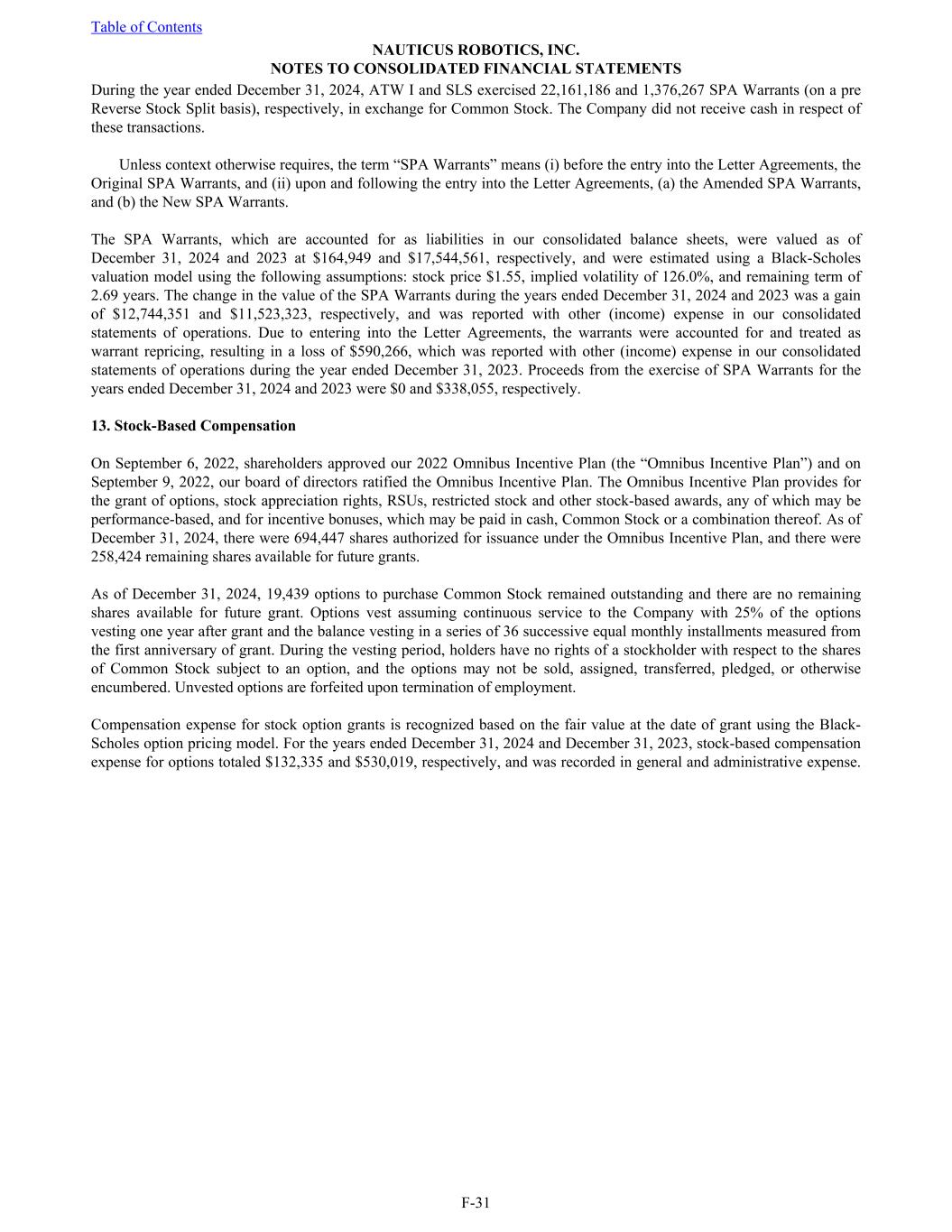 During the year ended December 31, 2024, ATW I and SLS exercised 22,161,186 and 1,376,267 SPA Warrants (on a pre Reverse Stock Split basis), respectively, in exchange for Common Stock. The Company did not receive cash in respect of these transactions. Unless context otherwise requires, the term “SPA Warrants” means (i) before the entry into the Letter Agreements, the Original SPA Warrants, and (ii) upon and following the entry into the Letter Agreements, (a) the Amended SPA Warrants, and (b) the New SPA Warrants. The SPA Warrants, which are accounted for as liabilities in our consolidated balance sheets, were valued as of December 31, 2024 and 2023 at $164,949 and $17,544,561, respectively, and were estimated using a Black-Scholes valuation model using the following assumptions: stock price $1.55, implied volatility of 126.0%, and remaining term of 2.69 years. The change in the value of the SPA Warrants during the years ended December 31, 2024 and 2023 was a gain of $12,744,351 and $11,523,323, respectively, and was reported with other (income) expense in our consolidated statements of operations. Due to entering into the Letter Agreements, the warrants were accounted for and treated as warrant repricing, resulting in a loss of $590,266, which was reported with other (income) expense in our consolidated statements of operations during the year ended December 31, 2023. Proceeds from the exercise of SPA Warrants for the years ended December 31, 2024 and 2023 were $0 and $338,055, respectively. 13. Stock-Based Compensation On September 6, 2022, shareholders approved our 2022 Omnibus Incentive Plan (the “Omnibus Incentive Plan”) and on September 9, 2022, our board of directors ratified the Omnibus Incentive Plan. The Omnibus Incentive Plan provides for the grant of options, stock appreciation rights, RSUs, restricted stock and other stock-based awards, any of which may be performance-based, and for incentive bonuses, which may be paid in cash, Common Stock or a combination thereof. As of December 31, 2024, there were 694,447 shares authorized for issuance under the Omnibus Incentive Plan, and there were 258,424 remaining shares available for future grants. As of December 31, 2024, 19,439 options to purchase Common Stock remained outstanding and there are no remaining shares available for future grant. Options vest assuming continuous service to the Company with 25% of the options vesting one year after grant and the balance vesting in a series of 36 successive equal monthly installments measured from the first anniversary of grant. During the vesting period, holders have no rights of a stockholder with respect to the shares of Common Stock subject to an option, and the options may not be sold, assigned, transferred, pledged, or otherwise encumbered. Unvested options are forfeited upon termination of employment. Compensation expense for stock option grants is recognized based on the fair value at the date of grant using the Black- Scholes option pricing model. For the years ended December 31, 2024 and December 31, 2023, stock-based compensation expense for options totaled $132,335 and $530,019, respectively, and was recorded in general and administrative expense. Table of Contents NAUTICUS ROBOTICS, INC. NOTES TO CONSOLIDATED FINANCIAL STATEMENTS F-31