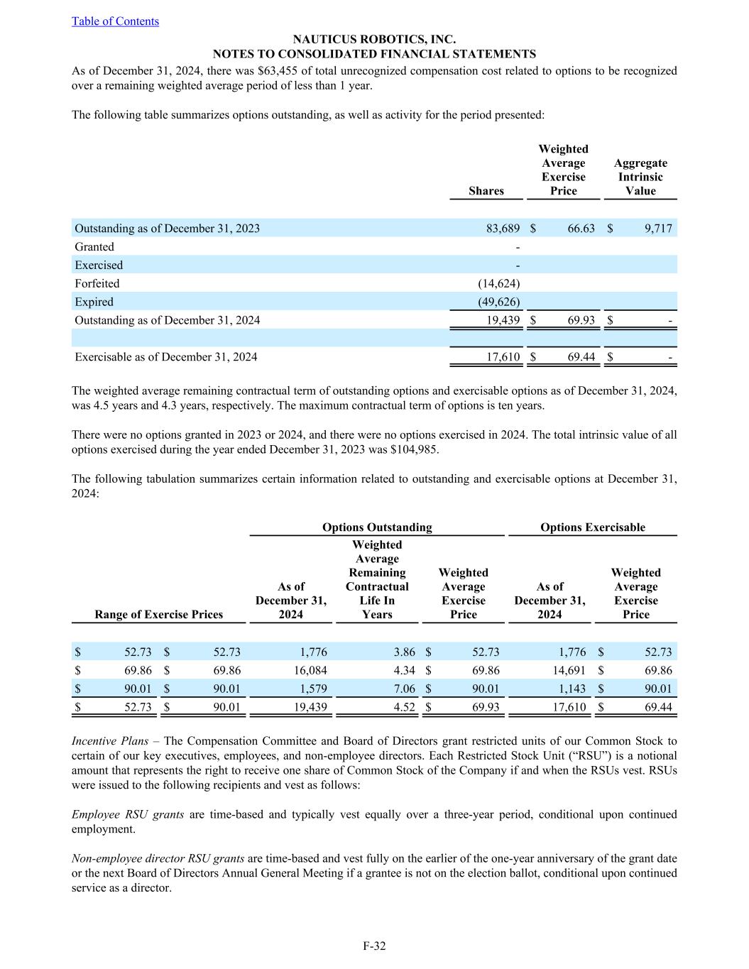 As of December 31, 2024, there was $63,455 of total unrecognized compensation cost related to options to be recognized over a remaining weighted average period of less than 1 year. The following table summarizes options outstanding, as well as activity for the period presented: Shares Weighted Average Exercise Price Aggregate Intrinsic Value Outstanding as of December 31, 2023 83,689 $ 66.63 $ 9,717 Granted - Exercised - Forfeited (14,624) Expired (49,626) Outstanding as of December 31, 2024 19,439 $ 69.93 $ - Exercisable as of December 31, 2024 17,610 $ 69.44 $ - The weighted average remaining contractual term of outstanding options and exercisable options as of December 31, 2024, was 4.5 years and 4.3 years, respectively. The maximum contractual term of options is ten years. There were no options granted in 2023 or 2024, and there were no options exercised in 2024. The total intrinsic value of all options exercised during the year ended December 31, 2023 was $104,985. The following tabulation summarizes certain information related to outstanding and exercisable options at December 31, 2024: Options Outstanding Options Exercisable Range of Exercise Prices As of December 31, 2024 Weighted Average Remaining Contractual Life In Years Weighted Average Exercise Price As of December 31, 2024 Weighted Average Exercise Price $ 52.73 $ 52.73 1,776 3.86 $ 52.73 1,776 $ 52.73 $ 69.86 $ 69.86 16,084 4.34 $ 69.86 14,691 $ 69.86 $ 90.01 $ 90.01 1,579 7.06 $ 90.01 1,143 $ 90.01 $ 52.73 $ 90.01 19,439 4.52 $ 69.93 17,610 $ 69.44 Incentive Plans – The Compensation Committee and Board of Directors grant restricted units of our Common Stock to certain of our key executives, employees, and non-employee directors. Each Restricted Stock Unit (“RSU”) is a notional amount that represents the right to receive one share of Common Stock of the Company if and when the RSUs vest. RSUs were issued to the following recipients and vest as follows: Employee RSU grants are time-based and typically vest equally over a three-year period, conditional upon continued employment. Non-employee director RSU grants are time-based and vest fully on the earlier of the one-year anniversary of the grant date or the next Board of Directors Annual General Meeting if a grantee is not on the election ballot, conditional upon continued service as a director. Table of Contents NAUTICUS ROBOTICS, INC. NOTES TO CONSOLIDATED FINANCIAL STATEMENTS F-32