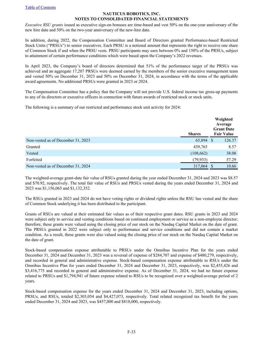 Executive RSU grants issued as executive sign-on bonuses are time-based and vest 50% on the one-year anniversary of the new hire date and 50% on the two-year anniversary of the new-hire date. In addition, during 2022, the Compensation Committee and Board of Directors granted Performance-based Restricted Stock Units (“PRSUs”) to senior executives. Each PRSU is a notional amount that represents the right to receive one share of Common Stock if and when the PRSU vests. PRSU participants may earn between 0% and 150% of the PRSUs, subject to attainment of certain performance conditions which were based upon the Company’s 2022 revenues. In April 2023, the Company’s board of directors determined that 51% of the performance target of the PRSUs was achieved and an aggregate 17,207 PRSUs were deemed earned by the members of the senior executive management team and vested 50% on December 31, 2023 and 50% on December 31, 2024, in accordance with the terms of the applicable award agreements. No additional PRSUs were granted in 2023 or 2024. The Compensation Committee has a policy that the Company will not provide U.S. federal income tax gross-up payments to any of its directors or executive officers in connection with future awards of restricted stock or stock units. The following is a summary of our restricted and performance stock unit activity for 2024: Shares Weighted Average Grant Date Fair Value Non-vested as of December 31, 2023 65,894 $ 126.37 Granted 439,765 8.57 Vested (108,662) 38.08 Forfeited (79,933) 57.29 Non-vested as of December 31, 2024 317,064 $ 10.66 The weighted-average grant-date fair value of RSUs granted during the year ended December 31, 2024 and 2023 was $8.57 and $70.92, respectively. The total fair value of RSUs and PRSUs vested during the years ended December 31, 2024 and 2023 was $1,156,065 and $1,132,352. The RSUs granted in 2023 and 2024 do not have voting rights or dividend rights unless the RSU has vested and the share of Common Stock underlying it has been distributed to the participant. Grants of RSUs are valued at their estimated fair values as of their respective grant dates. RSU grants in 2023 and 2024 were subject only to service and vesting conditions based on continued employment or service as a non-employee director; therefore, these grants were valued using the closing price of our stock on the Nasdaq Capital Market on the date of grant. The PRSUs granted in 2022 were subject only to performance and service conditions and did not contain a market condition. As a result, these grants were also valued using the closing price of our stock on the Nasdaq Capital Market on the date of grant. Stock-based compensation expense attributable to PRSUs under the Omnibus Incentive Plan for the years ended December 31, 2024 and December 31, 2023 was a reversal of expense of $284,707 and expense of $480,279, respectively, and recorded in general and administrative expense. Stock-based compensation expense attributable to RSUs under the Omnibus Incentive Plan for years ended December 31, 2024 and December 31, 2023, respectively, was $2,455,426 and $3,416,775 and recorded in general and administrative expense. As of December 31, 2024, we had no future expense related to PRSUs and $1,794,941 of future expense related to RSUs to be recognized over a weighted-average period of 2 years. Stock-based compensation expense for the years ended December 31, 2024 and December 31, 2023, including options, PRSUs, and RSUs, totaled $2,303,054 and $4,427,073, respectively. Total related recognized tax benefit for the years ended December 31, 2024 and 2023, was $457,000 and $818,000, respectively. Table of Contents NAUTICUS ROBOTICS, INC. NOTES TO CONSOLIDATED FINANCIAL STATEMENTS F-33